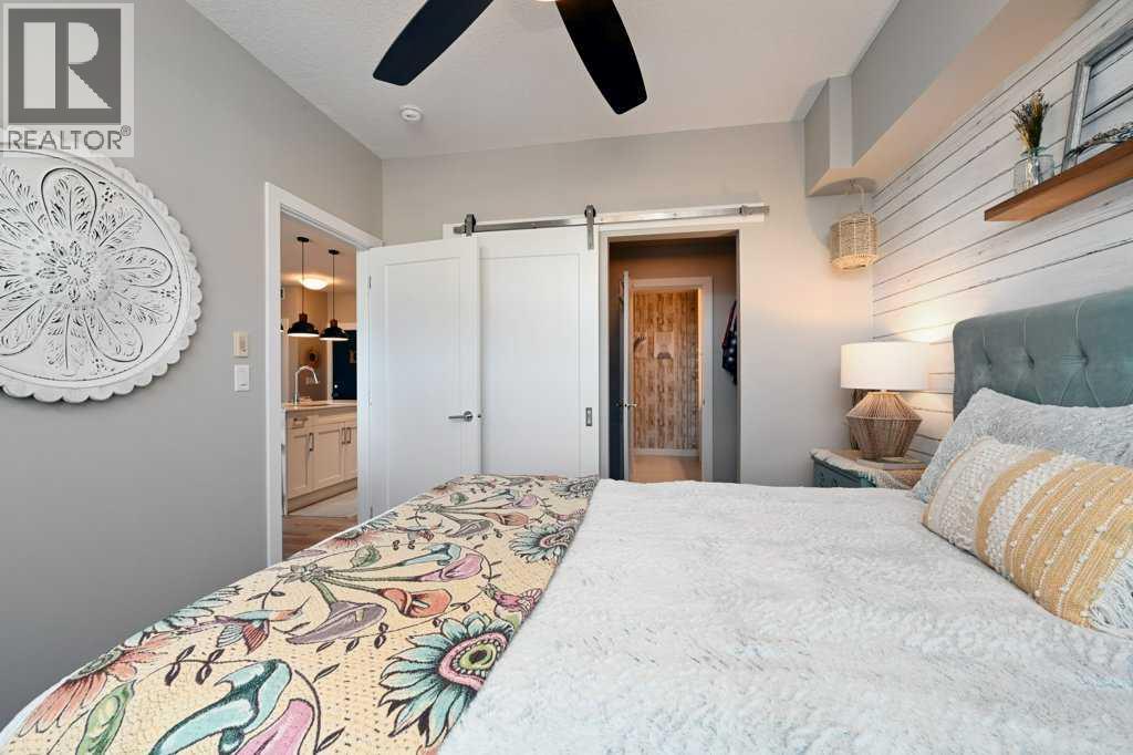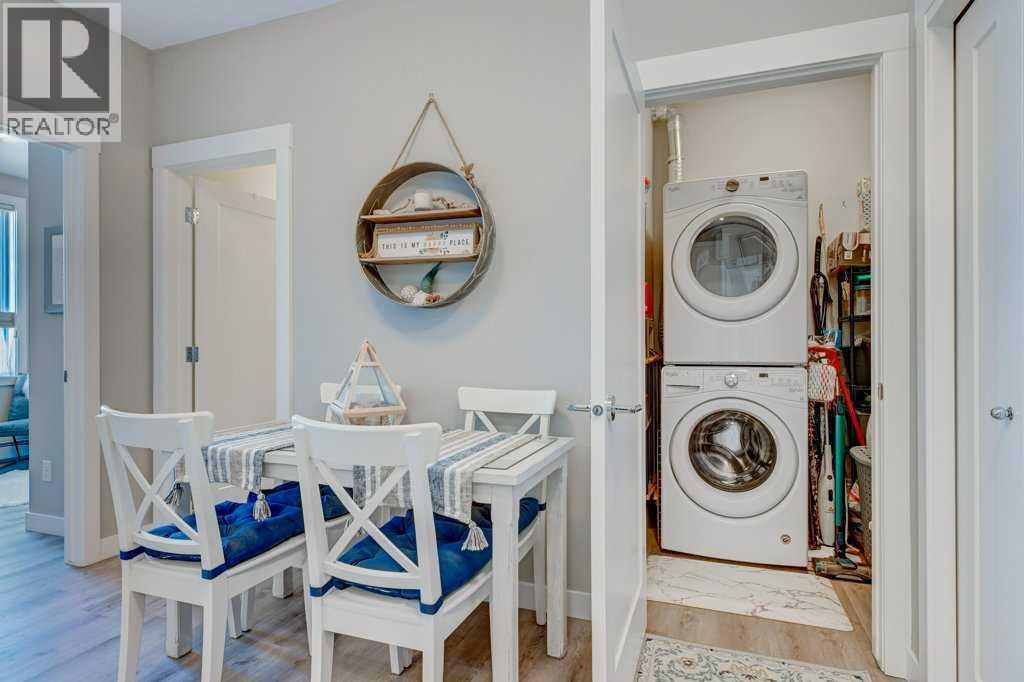A well-appointed, warm and stylish 2-bedroom, 2-bathroom condo on the 2nd floor of the secure, well-managed Walgrove Place in Walden. Built by Cardel Lifestyles in 2018, this bright, quiet, air-conditioned unit offers comfortable, modern living. The open floor plan is set up with the bedrooms on opposite sides of the main living area, providing excellent privacy and functionality. The unit has been well maintained, with thoughtful design throughout. Upgraded features include air conditioning, luxury vinyl plank flooring throughout, a deluxe wall kitchen appliance package with chimney hood and raised upper cabinetry. The primary suite offers a walk-in closet with barn door and custom built-in white wood shelving and drawers. The 4-piece ensuite includes dual undermount sinks, a fully tiled shower with sliding glass doors, and ceramic tile flooring. Both bedrooms are equipped with custom cordless up/down blackout blinds. The spacious balcony includes a gas line for BBQ. There is plenty of natural light throughout. The heated underground titled parking stall includes a generous storage cage and is conveniently located near the exit door. Showhome condition and offers more than typical upgrades. Immediate possession possible. Shopping, restaurants, and walking paths are just across the street, with easy access to South Health Campus, Transit, Stoney Trail, and Deerfoot Trail. (id:53676)