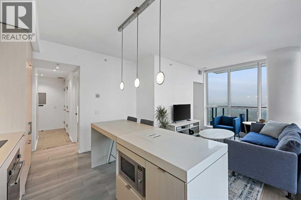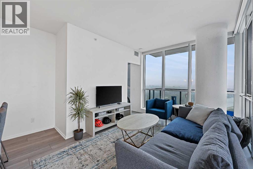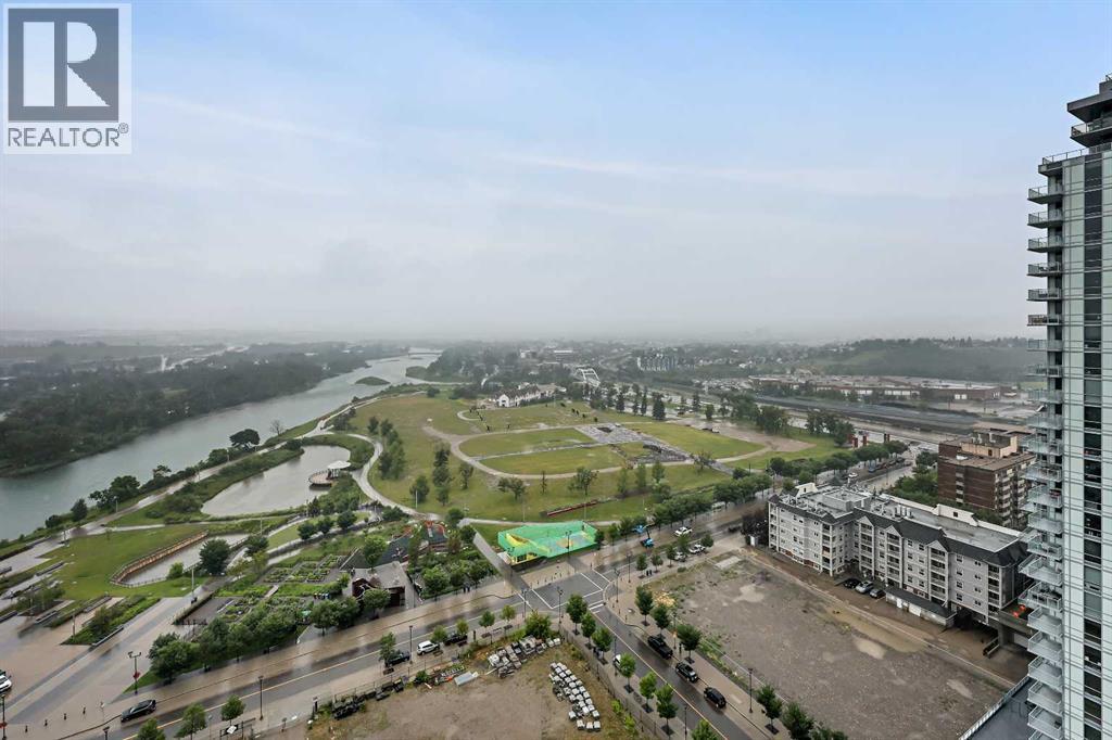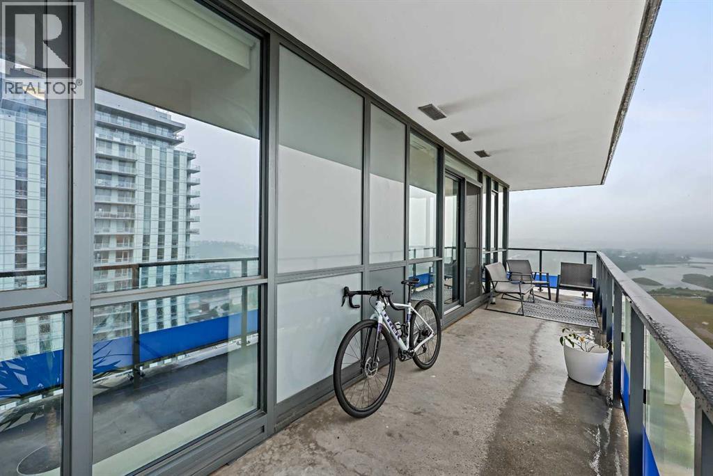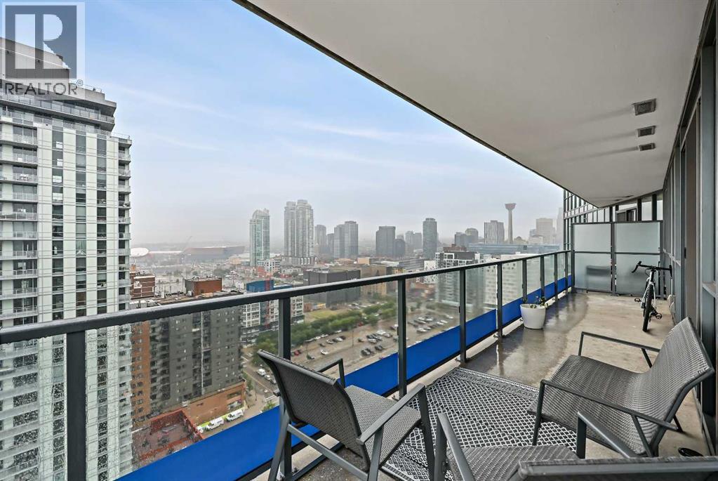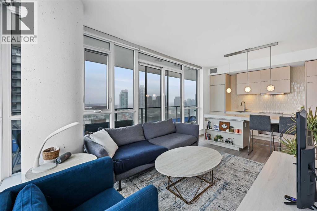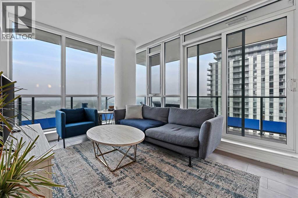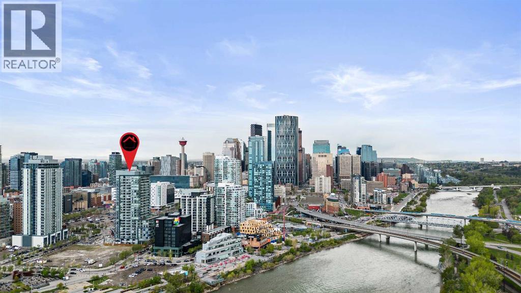 Experience elevated city living in this spectacular 21st-floor corner unit in the Verve, located in the vibrant heart of East Village. With unobstructed southeast views overlooking the Bow River, Fort Calgary, Stampede Park, and downtown skyline, this 2-bedroom, 2-bathroom residence combines location, light, and lifestyle in one of Calgary’s most walkable neighbourhoods. Floor-to-ceiling windows flood the open-concept space with natural light, while the set-back deep windowsills create an expansive, airy feel rarely found in high-rise condos. The 200+ sq ft wraparound balcony invites you to BBQ, lounge, and soak in the panoramic vistas day or night. Thoughtfully designed for comfort and style, the kitchen features sleek cabinetry, quartz countertops, a large island perfect for entertaining, and a built-in electric cooktop. The primary bedroom offers a tranquil retreat with stunning views and a modern 3-piece ensuite, while the second bedroom is ideal for guests, a home office, or den. A spacious 4-piece main bath, in-suite laundry room, and central air conditioning add to everyday convenience. The unit also includes a rare, oversized titled underground parking stall—big enough to fit a truck—and an assigned storage locker. The Verve offers exceptional amenities: a second-floor fitness centre, social lounge with kitchen and terrace, guest suites, and an exclusive 25th-floor rooftop patio and party room with unobstructed views. Perfectly positioned for active professionals, pet lovers, and investors alike. You're steps from the RiverWalk, bike paths, and an off-leash dog park across the street. The Central Library, Superstore, Studio Bell, and a growing list of East Village cafes, restaurants, and breweries are all within a 5-minute walk. Plus, you're in Calgary's free fare LRT zone for stress-free downtown commuting. Whether you're searching for a pet-friendly river-view condo, a modern downtown home with amenities, or a turnkey rental in a high-demand location, this top-floor end unit delivers it all. Don’t miss your opportunity to own one of East Village’s most desirable views. Book your showing today. (id:53676)