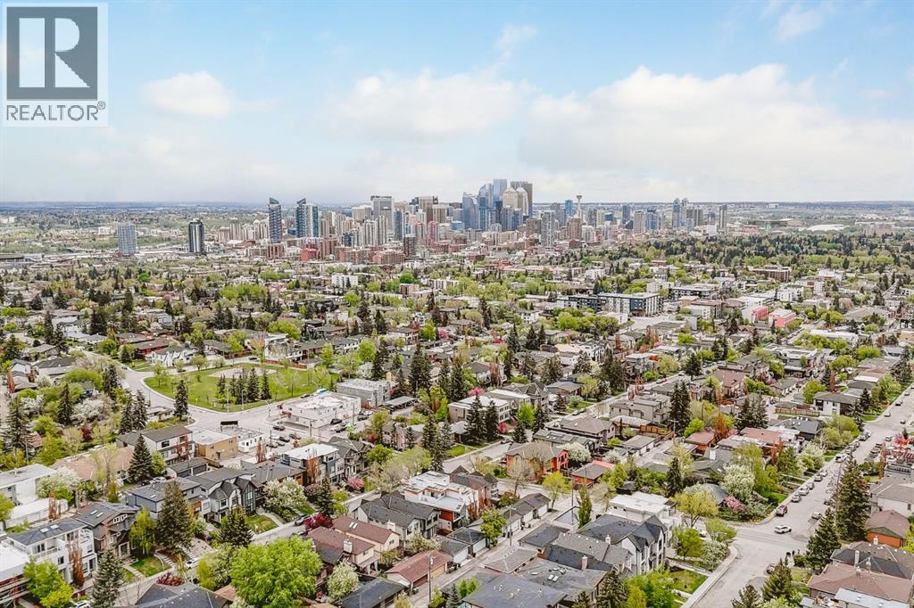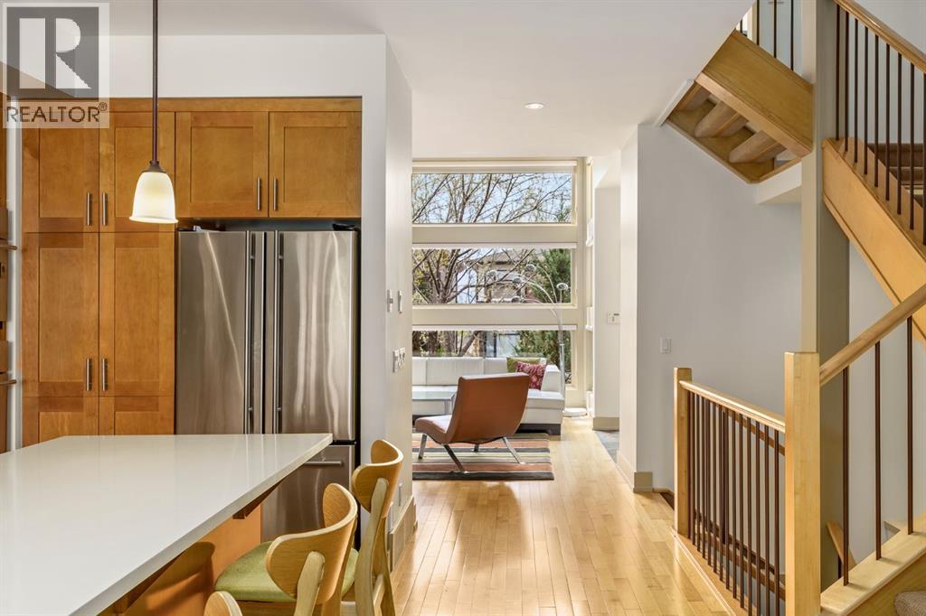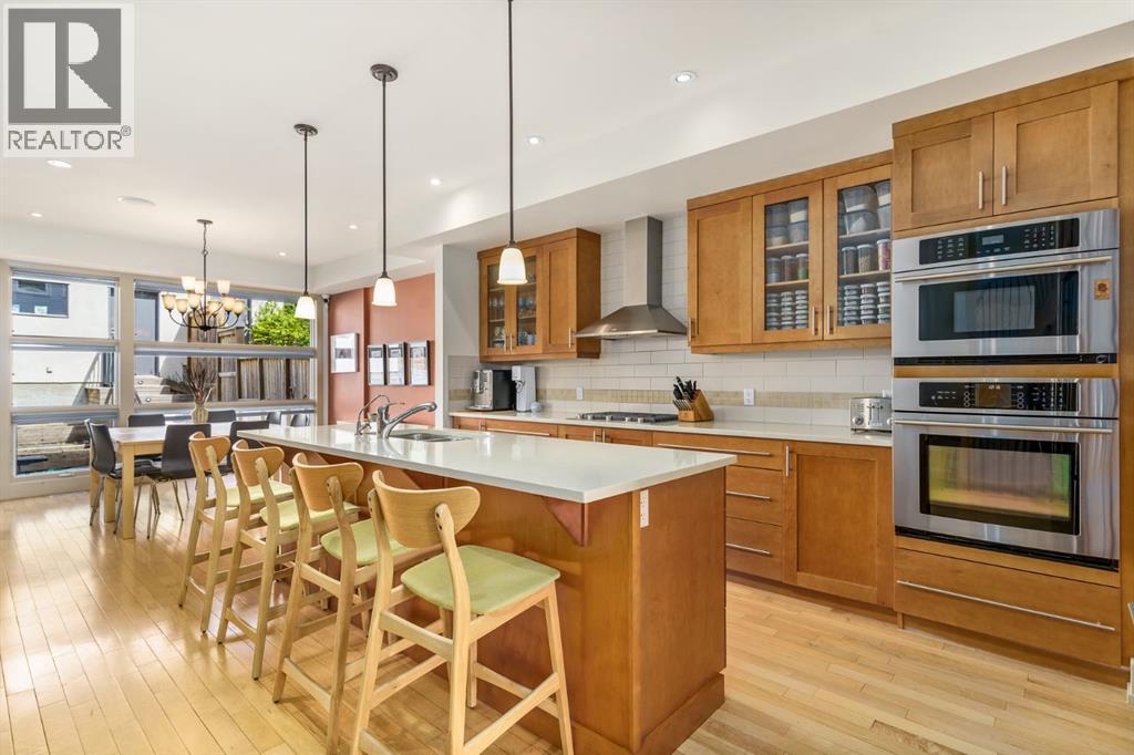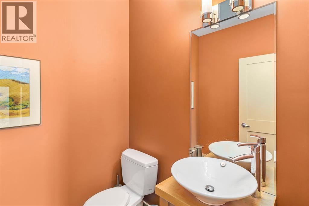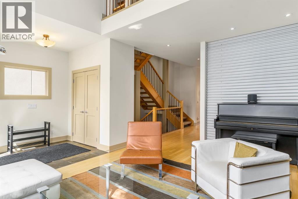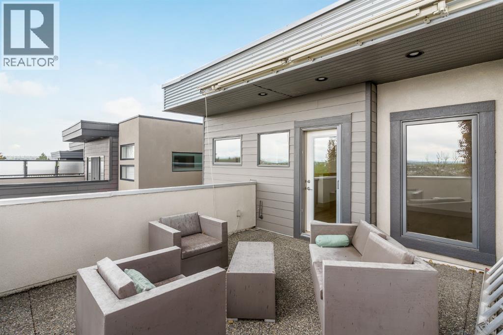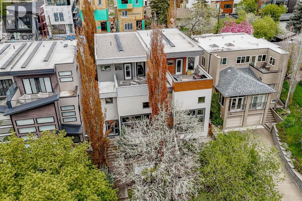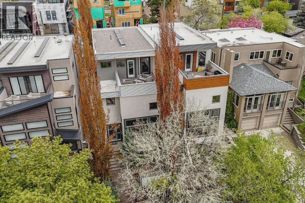 OPEN HOUSE: Sat Oct 11, 12PM-2PM. Immerse yourself in scenic beauty and urban convenience with this remarkable residence in the vibrant Marda Loop District. A corrugated metal exterior and landscaped front yard provide charming curb appeal in this highly coveted neighbourhood. Step into the stunning entryway, where you are welcomed by an open floorplan, pristine hardwood, and fresh paint. The front living room is illuminated by sunlight with an impressive 18ft open to below and giant south facing triple glaze argon filled Plygem windows. Gather around the stone fronted gas fireplace and an accompanying metal feature wall that complements the outside of the home. Nearby is the immaculate chef's kitchen that boasts a long island with undermount sink and filtered water, sleek stainless steel appliances, gas cooktop and quartz countertops. Endless cabinetry space is ideal for optimal storage and organization while the abundant seating options are perfect for hosting dinner parties. A spacious dining room at the rear is filled with light and directly accesses the secluded courtyard patio nestled between the back of the home and convenient double garage. The adjacent powder room features a bowl mounted sink for an interesting pop of character. Ascend the open riser staircase which further radiates light from above onto the second level. Here you will find three large bedrooms and a versatile loft and den area; with built-ins that can easily convert this into a functional office or additional family room. A dedicated laundry room with sink further combines practicality and comfort. The third level encompasses the vast primary retreat and bonus space with a wet bar, both areas featuring new luxury vinyl plank flooring. The bonus area connects onto an enviable south-facing rooftop patio with sweeping views of the picturesque rocky mountains. The primary bedroom comes fully equipped with closet organizers, and an elegant ensuite with a built-in tiled tub, dual sinks, makeup vanity, in floor heating, and glass enclosed shower with product niche and bench. Down below in the fully finished basement you will find 9ft ceilings, radiant in-floor heating and custom fit rubber gym matting in the expansive recreation space. Thoughtful upgrades include rigid styrofoam insulation and gravel on torch on roof, water softener, newer UV protected/triple glazed windows, built-in speakers, Toto toilets and undermount sinks throughout, and a tankless water heater system. Characterized by sunshine that spills into every corner of the home, along with two exclusive amenity spaces for ultimate enjoyment of the great outdoors while maintaining your privacy. This exceptional home has 3,550sq.ft of livable space and is favourably situated in the popular community of Richmond, with unparalleled proximity to green spaces, entertainment and retail; mere walking distance to 33rd Ave with quick access to the Downtown Core and beyond. A perfect blend of luxury and convenience. (id:53676)