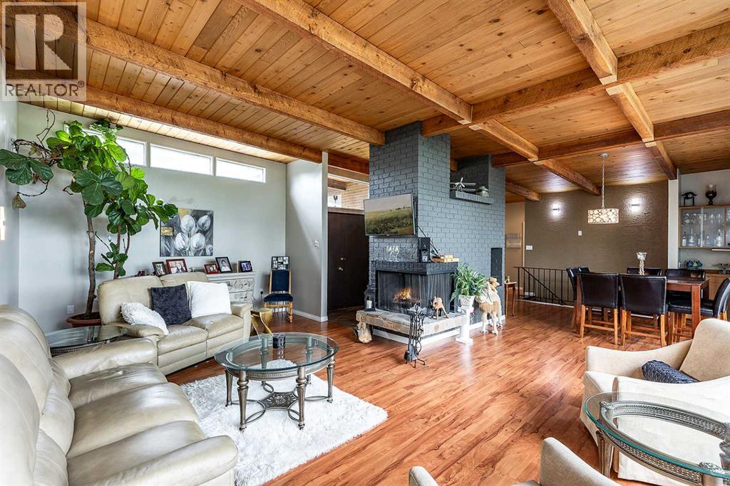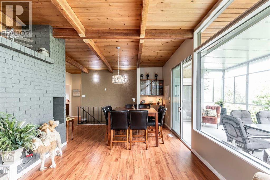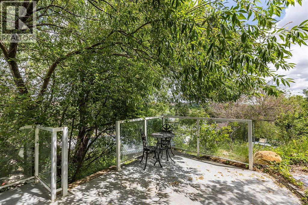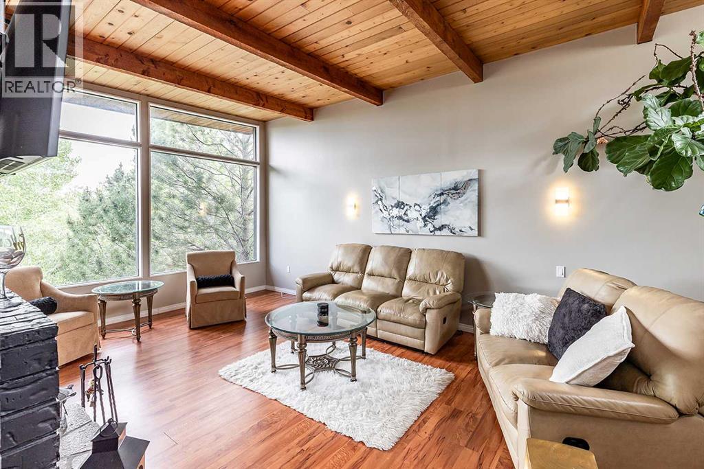 Discover this architecturally designed, one-of-a-kind, walkout hillside bungalow that perfectly frames stunning views of the river valley. Nestled among mature trees, this home offers privacy, character, and a peaceful connection to nature. The main floor features striking open-beamed, sloped ceilings and a beautiful double masonry fireplace, creating a warm and inviting atmosphere. The open-concept layout flows into an oak kitchen with a built-in oven — designed to capture both function and charm. Just off the main living area, you’ll find a gorgeous sunroom set among the trees — the perfect space to unwind, entertain, or simply enjoy the view in every season. With 3 bedrooms and 2 bathrooms, this home also features a developed walkout basement offering potential for an additional bedroom or flexible living space. Outside, a two-tiered backyard and partially covered patio make the most of the natural setting. Additional highlights include a single attached garage and extra parking on the front pad. This truly unique property combines architectural interest, incredible views, and a serene setting — a rare find in Medicine Hat’s sought-after southwest hills. (id:53676)