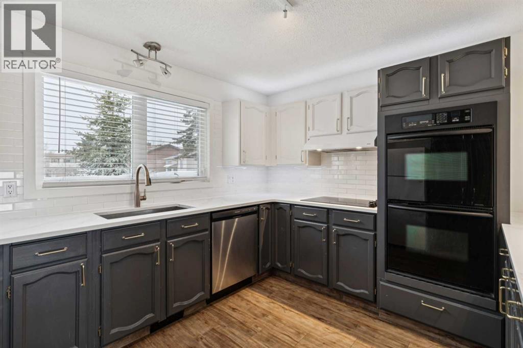 As you step into the home, you are greeted by a functional front entryway featuring a convenient closet for easy jacket and shoe storage. The foyer opens immediately into an expansive living room, where a large bay window floods the space with an abundance of natural light. The main floor transitions seamlessly into the open-concept dining area and kitchen, tied together by durable, vinyl-plank flooring. The modernized kitchen is a chef’s delight, showcasing a stylish two-toned cabinet design—crisp white uppers paired with deep blue lowers. This space is fully equipped with an electric cooktop, built-in double oven, and a sleek white refrigerator, all framed by elegant white quartz countertops and a subway tile backsplash. A unique multi-level design leads down to an additional living space, anchored by a classic brick-surround fireplace and sliding glass doors that provide direct access to the rear deck. Moving to the upper level, a classic white spindle staircase leads to the private bedrooms. The primary suite is notably spacious, easily accommodating a king-sized bed and complimented by a 3 pc ensuite, while the additional bedrooms feature large windows and updated closet doors, making them perfect for children’s rooms or a home office. These rooms share a clean, modern 4-piece bathroom with updated fixtures. The lower level offers even more versatility with a finished basement featuring plush carpeting, perfect for a media room or home gym. You'll also find a secondary room offering great flexibility for a home office or guest space. Outside, the property features a fully fenced backyard with a spacious deck, ideal for summer gatherings, leading to the detached garage for secure parking and extra storage. Benefits continue with a back gated fence perfect for RV storage! Located in the heart of the established community of Temple, this home is just minutes away from everything a family needs. You are within walking distance to multiple schools, including Annie F oote and Father Scollen, as well as local parks and the Temple Community Association. With quick access to Stoney Trail and McKnight Blvd, plus the nearby Village Square Leisure Centre and Sunridge Mall, this location perfectly balances quiet residential living with city convenience. (id:53676)