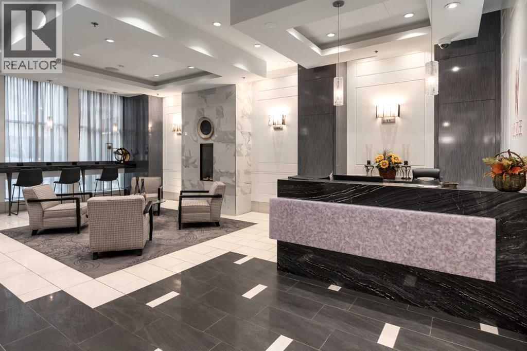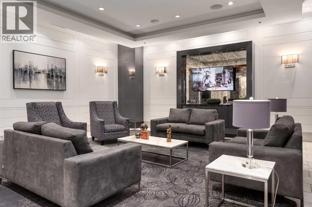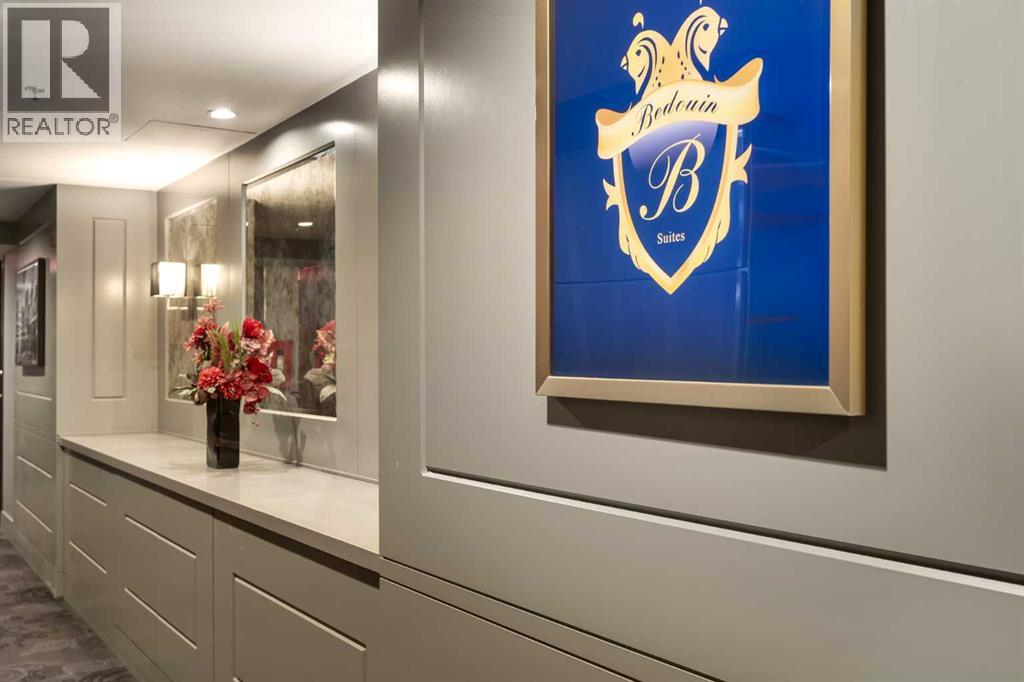 Experience elevated sophistication on the exclusive BEDOUIN Floor at Vogue! One of only four floors in the building with these premium upgrades, this gorgeous corner suite is soaked in natural light and showcasing panoramic views of the city skyline and Rocky Mountains. The BEDOUIN Collection offers refined details including designer lighting with dimmers, custom bedroom paneling with wall sconces, and premium finishes throughout.The open concept kitchen features two-tone cabinetry, quartz counters, under-cabinet lighting, a custom island with bar seating, tile backsplash, and upgraded stainless-steel appliances including a chimney-style hood fan. The chic living space is complete with a book matched built-in walnut entertainment unit. The sizeable corner balcony features a gas BBQ line, making BBQing a dream. The primary bedroom, wrapped in windows, features a spa-inspired ensuite with quartz countertops, tile floors, modern vanity with storage, and a full-height tiled tub/shower combo. The second bedroom offers flexibility as a guest room or home office and is steps from its own full bathroom with a floor-to-ceiling tiled shower and upgraded glass door. The bedrooms are ideally separated for ultimate privacy.Additional highlights include in-suite laundry with new dryer (2025), a titled secure heated underground parking stall with storage, and central A/C. Vogue offers an elegant, hotel-style lobby with full-time concierge plus exceptional amenities: a state-of-the-art fitness centre, yoga studio, billiards and party rooms, and the 36th-floor Sky Lounge with rooftop terraces and breathtaking 360° mountain and city views. Walk to Prince’s Island Park, Kensington Village, the LRT (free zone), boutique shops, fine dining, cafes, and Calgary’s +15 network—all just steps away. This is luxury urban living at its finest. (id:53676)