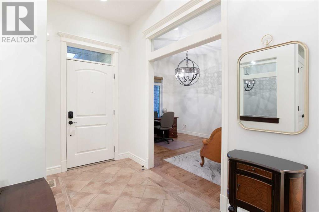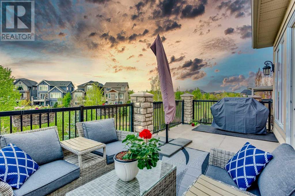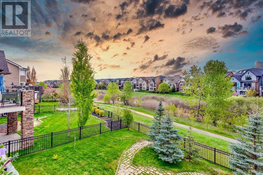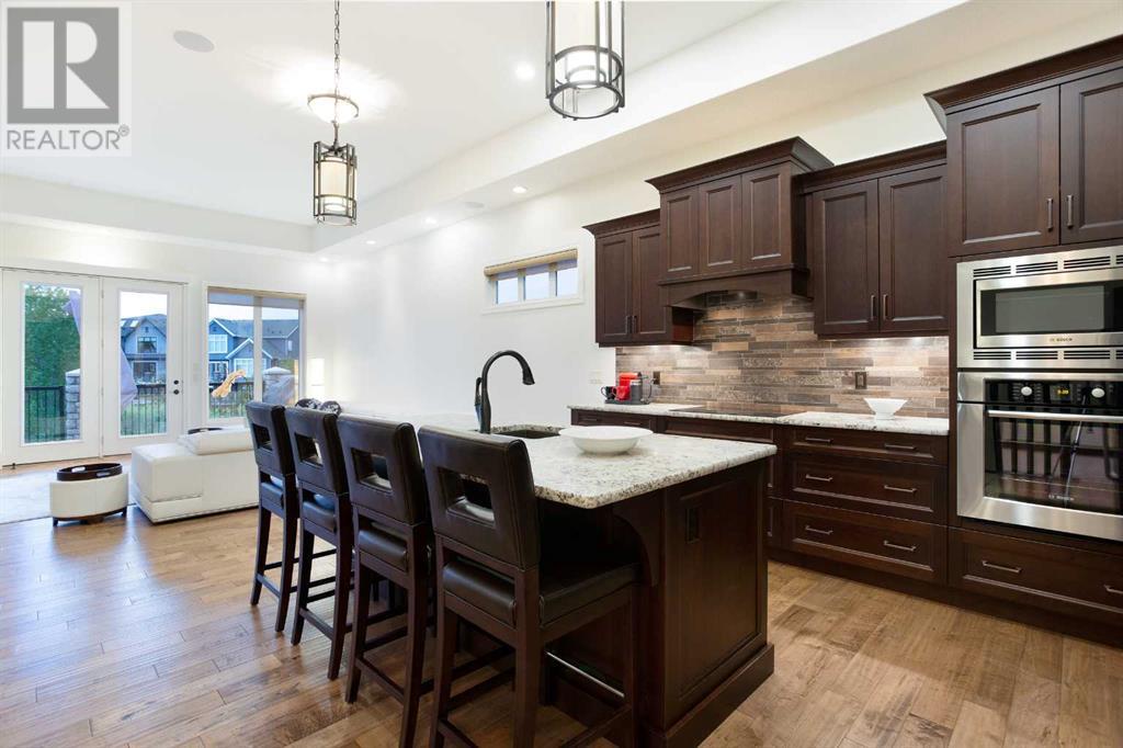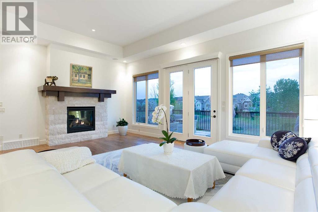 Welcome to this beautifully designed walkout bungalow in the heart of Riverstone, offering a rare combination of luxury, privacy, and connection to nature. Perfectly positioned on a quiet street, this home features a south-facing backyard that backs directly onto a tranquil green space and creek, creating a serene backdrop year-round. From the moment you arrive, you'll notice the timeless curb appeal, accentuated by custom exterior stonework and an elegant entryway with soaring 11.5' ceilings throughout the main level. As you enter, you're welcomed by a grand open concept layout with wide archways, exquisite finishes, and an abundance of natural light. One of the first things you'll appreciate is how incredibly spacious and unique the living room is—a true custom design that sets this home apart. It's uncommon to find a bungalow with such a generously scaled main living area, making it ideal for both intimate evenings and large gatherings. A stunning fireplace with rich stone surround and a warm wood mantle creates a perfect focal point, complementing the warmth of the hardwood floors. The kitchen is a dream for entertainers and home chefs alike, featuring high-end custom cabinetry, granite countertops, and a walk-through pantry with exceptional storage. The adjacent dining area is highlighted by a beautiful, built-in china cabinet that adds elegance and practical display space—perfect for showcasing your most treasured pieces while tying the room together with timeless charm. Off the foyer, you’ll find a stylish front office that’s ideal for working from home or creating a cozy library or reading nook. The primary suite is a true sanctuary, offering tranquil views of the creek and greenspace beyond. The ensuite bathroom is spa-inspired, complete with a skylight, oversized shower, luxurious deep soaker tub for two, custom vanity tower, and a spacious walk-in closet. Downstairs, the professionally developed walkout level offers more room to enjoy, featuring ten-foot ceilings, roughed-in speakers, one spacious bedroom with a walk-in closet, a full four-piece bathroom, and a roughed-in future bar area that allows for additional customization. Whether you're envisioning a games room, home theatre, or a quiet retreat, the lower level offers endless possibilities. Step outside onto your oversized vinyl deck which features a gas line and water tap and take in the breathtaking views and experience the peacefulness of the natural landscape. The large double-attached garage provides room for all your vehicles and gear and has been upgraded with a gas line and sink with hot and cold taps. While additional features like separate furnaces for the main and lower level, air conditioning, water softener, in-ground irrigation, and a thoughtfully designed mudroom add convenience and comfort to everyday life. This is a rare opportunity to own in one of Calgary’s most coveted communities along the Bow River, minutes to Fish Creek Park, the South Health Campus, and top-tier schools. (id:53676)