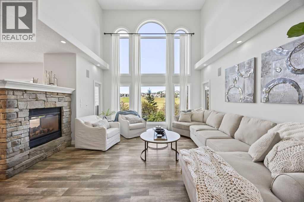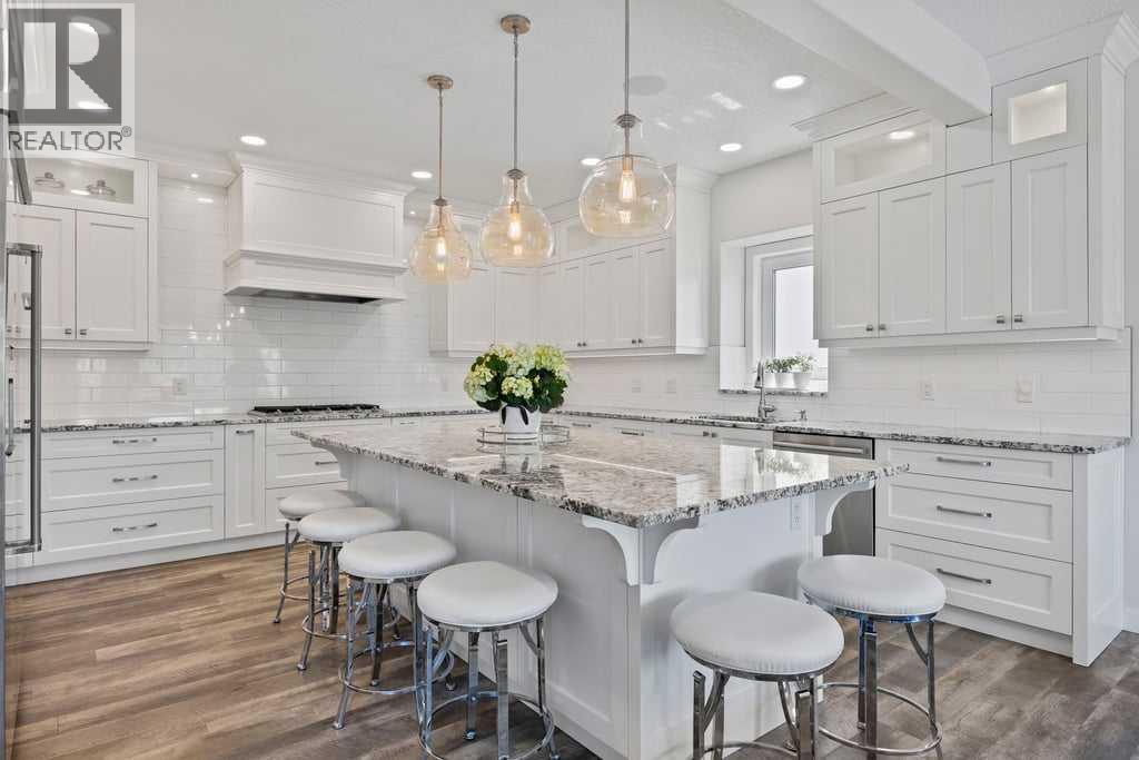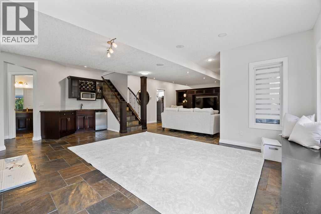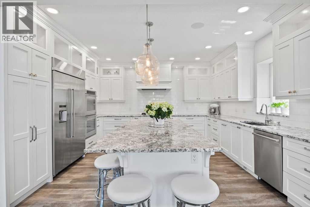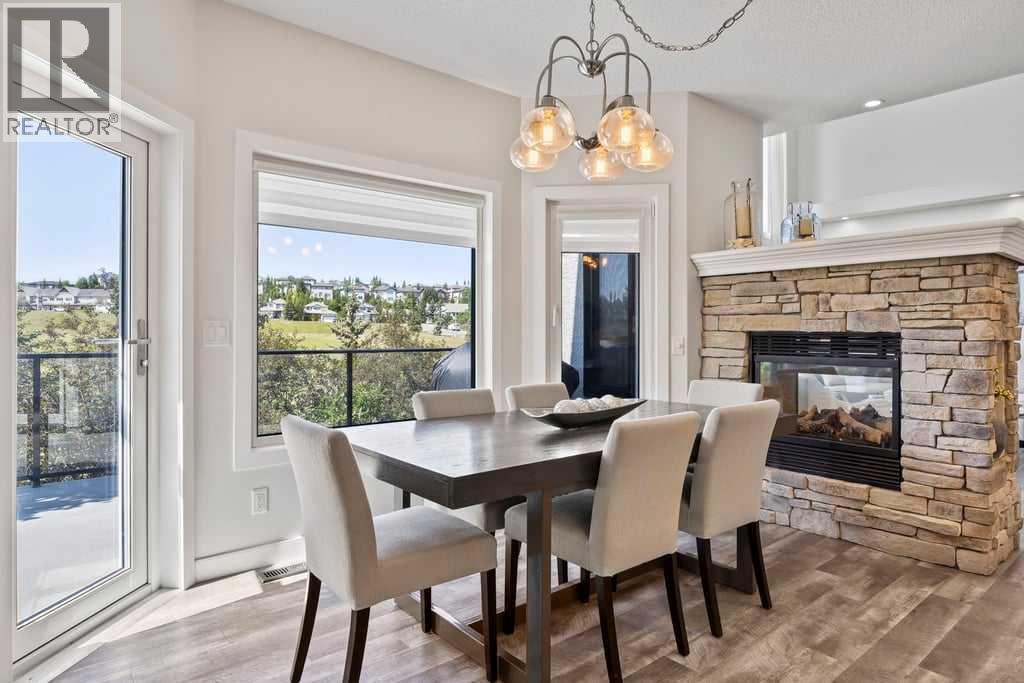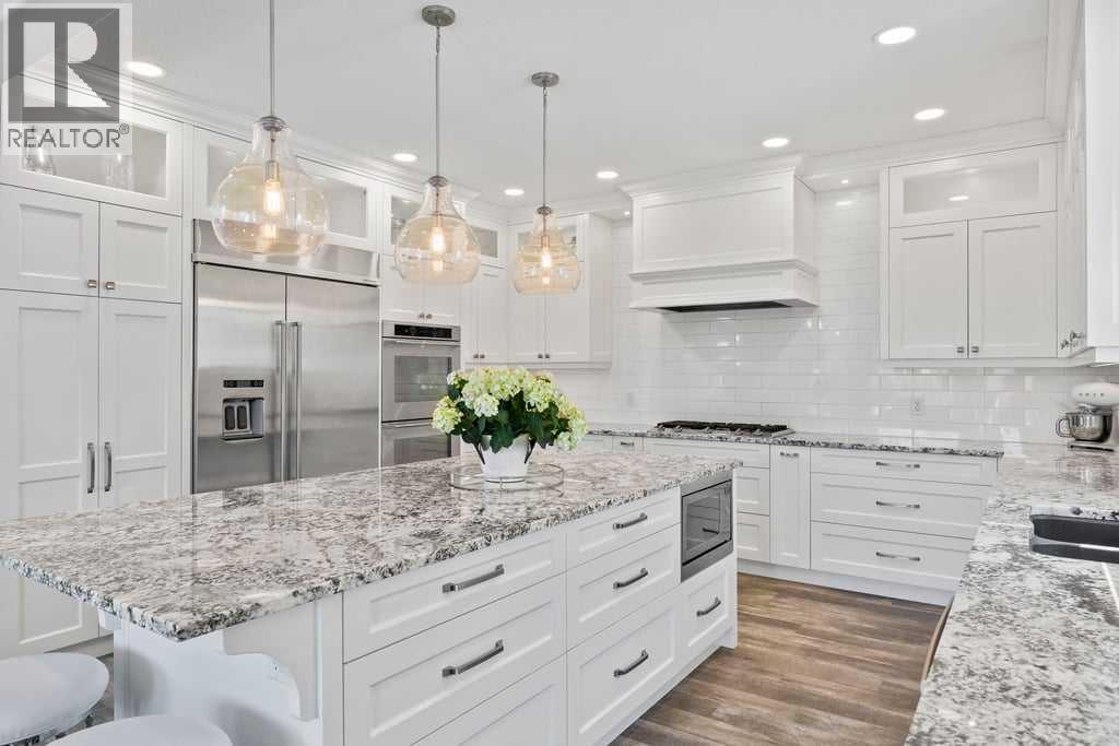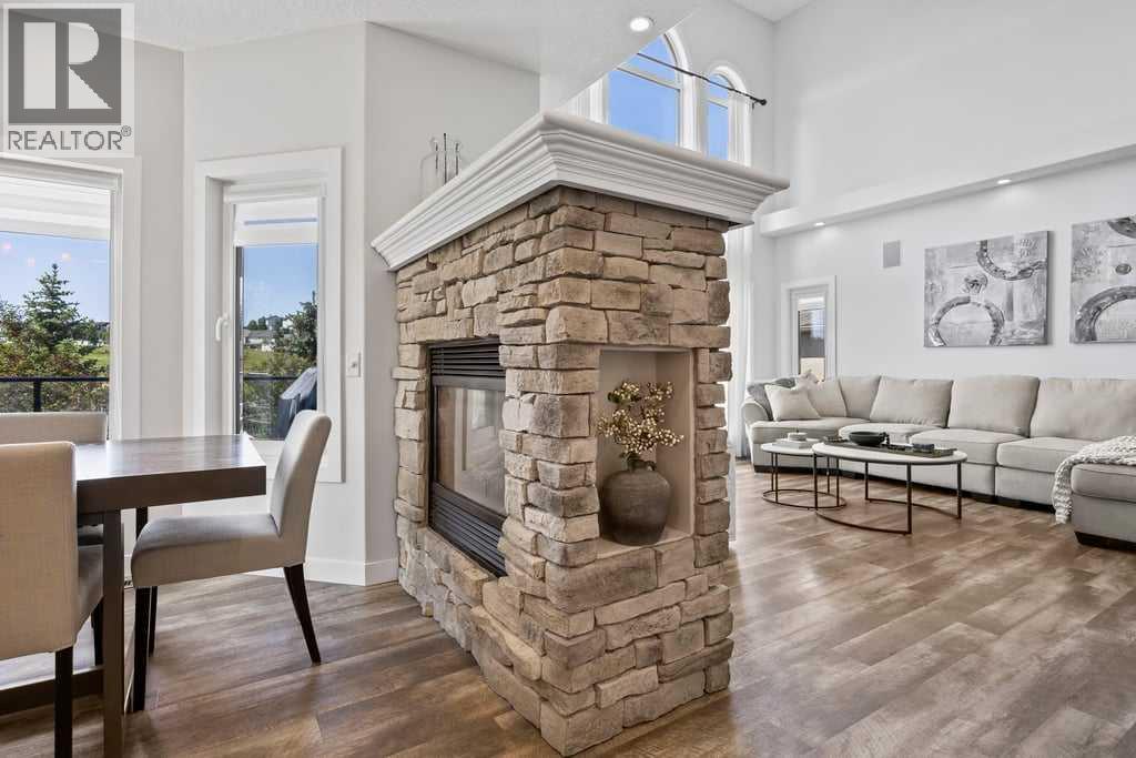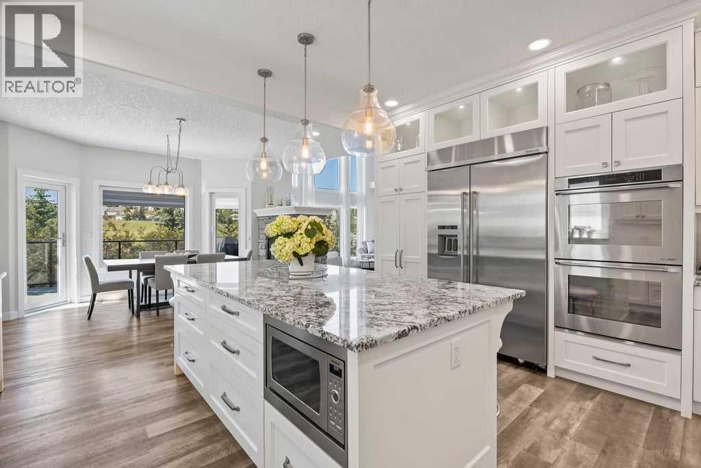 Unparalleled Value In This fully renovated walkout home in a quiet Cochrane cul-de-sac backs directly onto green space with gated access to the community sports field. Surrounded by lush landscaping, gardens, and curb-edged pathways, the 5-bedroom, 3.5-bathroom home offers nearly 4,000 sq ft of thoughtfully upgraded living space—including a fully finished basement designed for versatile indoor-outdoor living.The main floor blends warmth and function, centred around a striking double-sided stone fireplace linking the living and dining areas. The chef-inspired kitchen (2018) features granite counters, a 48” built-in KitchenAid fridge/freezer with ice and water, dual 30” Dacor wall ovens, a 36” Dacor gas cooktop, Bosch ultra-quiet dishwasher, Vent-A-Hood range, and a Panasonic Prestige microwave. Timeless cabinetry, under-cabinet lighting, and stylish finishes complete the space.Off the entry are two bright offices—perfect for remote work or creative pursuits. One was professionally customized in 2021 with built-in cabinetry and a quartz desk. Rich hardwood floors, large windows, and triple-pane exterior doors (2023) add to the home’s inviting feel. A front porch and powder room near the garage entry offer additional convenience.Upstairs, a vaulted bonus room creates a flexible family zone. The spacious primary suite includes a custom walk-in closet (2018) and a fully renovated ensuite with quartz double vanity, tiled shower, soaker tub, and heated floors. Two additional bedrooms share another beautifully updated full bath.The walkout basement adds in-floor heating, two more bedrooms, a full bathroom, and a kitchenette with under-counter fridge and built-in microwave. Step into the glass-enclosed sunroom (2019) through a 13' sliding door—perfect for morning coffee or quiet evenings overlooking the yard.Additional Features & Upgrades:Roof replaced (2021)Large triple pane windows and new exterior doors (2023), custom blinds & drapes throughout.Two high-efficiency Lennox furnaces with built-in dehumidifiers (2018)Two Comfort Aire 2.5-ton A/C units (2023)NTI condensing boiler & timed hot water recirculation (2018)Oversized insulated garage with 50,000 BTU Big Maxx heater.Widened driveway & rear gate walkway (2020)Curb-Ease concrete edging (2023) around yard.Keter Artisan 7x7 resin shed (2022)Whole-home speaker system with outdoor zones,Kenmore Elite washer/dryer with steam.Located steps from parks, pathways, and everyday amenities, this home combines high-end finishes with peace-of-mind upgrades—offering truly move-in-ready living in one of Cochrane’s most established communities. (id:53676)