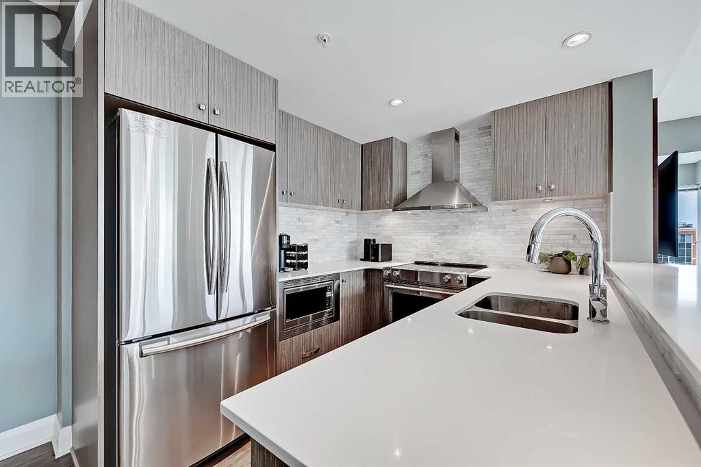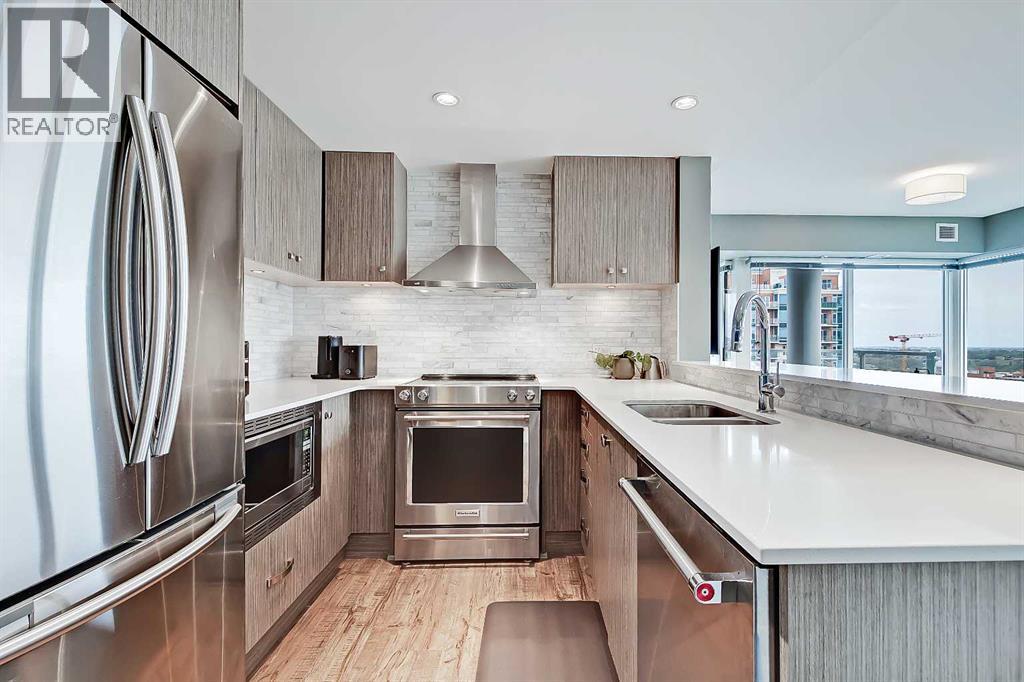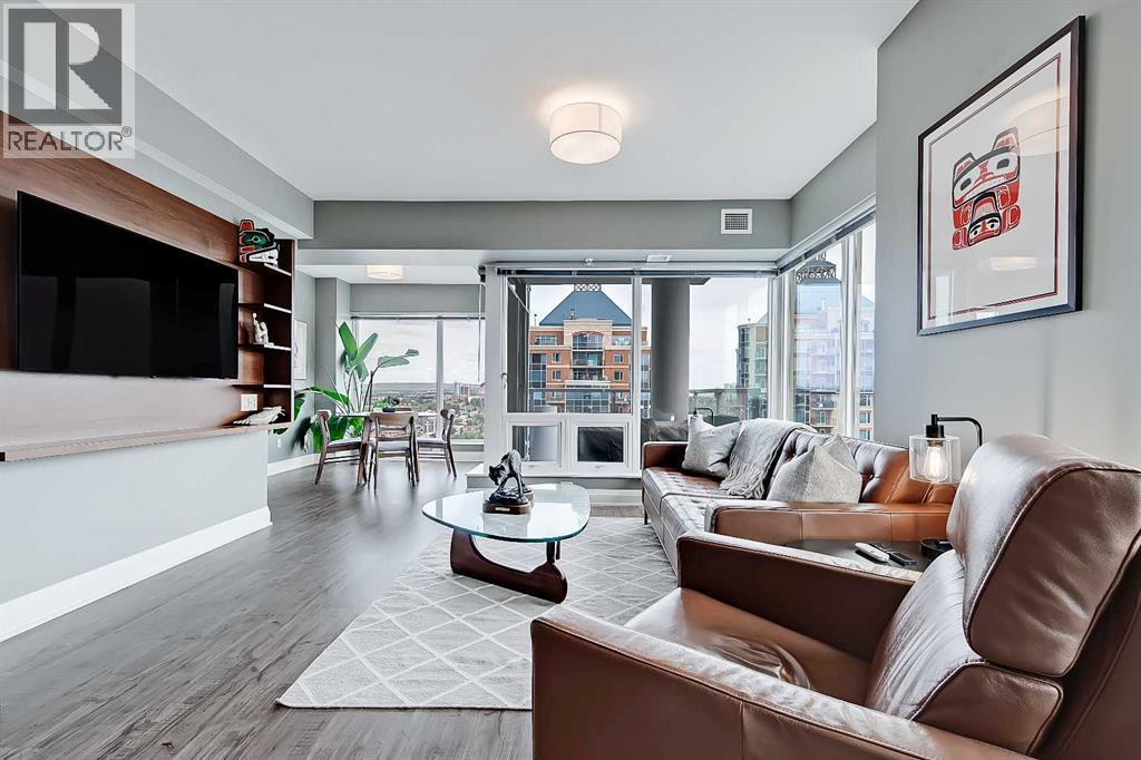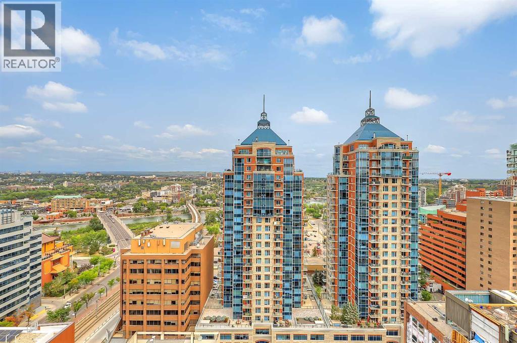 *VISIT MULTIMEDIA LINK FOR FULL DETAILS INCLUDING IMMERSIVE 360 VT & FLOORPLANS!** Wow, check out this 2 bed & den/2bath NE CORNER UNIT with PHENOMENAL RIVER & CITY VIEWS! There are only 4 floors in the upscale Vogue building that were specially customized for Bedouin Suites, and this is one of them! EXCLUSIVE ‘BEDOUIN’ FEATURES include upgraded hallways and common areas, as well as INCREDIBLE UNIT UPGRADES like upgraded appliances & lighting including dimmers throughout, custom bedroom panelling including convenience plugs and sconce lighting, upgraded bathrooms with tile wainscoting and glass shower doors, built-in closet organizers throughout, built-in walnut entertainment units, a Smart Sensor energy management system for the eco-minded buyer and MORE! Highly upgraded, this open-concept condo features floor-to-ceiling windows and upgraded luxury vinyl plank flooring throughout. Contemporary woodgrain cabinets line the kitchen w/ modern hardware & under cabinet lighting, quartz counters, a marble-style tile backsplash, dual basin undermount S/S sink, & upgraded stainless steel appliances, including a chimney-style hoodfan. Breakfast bar seating adds a casual dining option, or sit down for meals in the dining room with 2x walls of windows. The open main living area also features floor-to-ceiling windows and an extensive balcony w/ gas line for a BBQ & with the most stunning views of downtown Calgary and the Bow River. A split floorplan is great for privacy between the bedrooms. The large primary suite features large windows w/ panoramic views, custom paneling with sconce lighting and convenince plugs, a generous closet w/ built-in organizers, & a 5-pc ensuite w/ tile flooring, extended modern vanity with dual undermount sinks, modern faucets, quartz countertops, tile backsplash, & fully tiled tub/shower w/ upgraded glass door. The 2nd bedroom features a generous sized closet & large windows w/ panoramic views. It has quick access to the main 3-pc bath w/ tile floo rs & an oversized glass shower w/ full height tile. Complete w/ central AC, in-suite laundry, titled indoor parking & a private storage locker, and 3 mounted TVs included! VOGUE is a high-end building w/ executive amenities including a gorgeous lobby, full-time concierge, fitness room, games room, large party room w/ kitchen, owners lounge, meeting room, and more. Surrounded by parks, transit, the LRT, shopping & more, & within easy walking distance to the downtown core & all Kensington shops & services – this location offers the best urban lifestyle in the Downtown Commercial Core! ATTENTION INVESTORS - THIS UNIT IS TENANT OCCUPIED @ $2900/MONTH UNTIL MAY 31, 2026 AND THE TENANT WOULD BE WILLING TO STAY LONGER IF WANTED. *Multiple Units & Floorplans Available in this Building - Visit Multimedia Links for Full Details!* (id:53676)