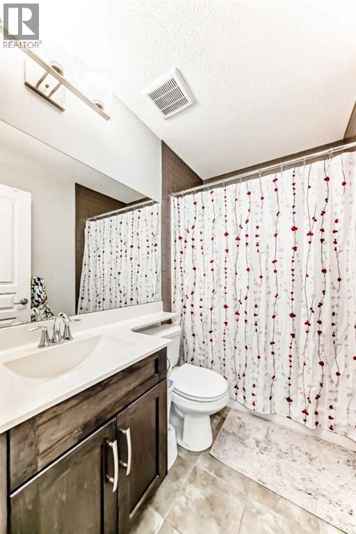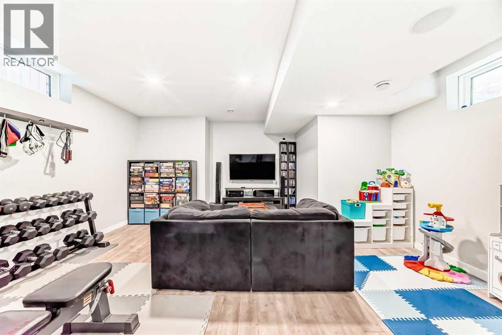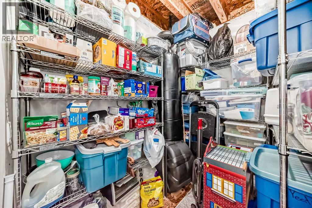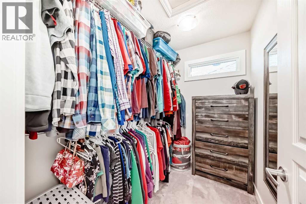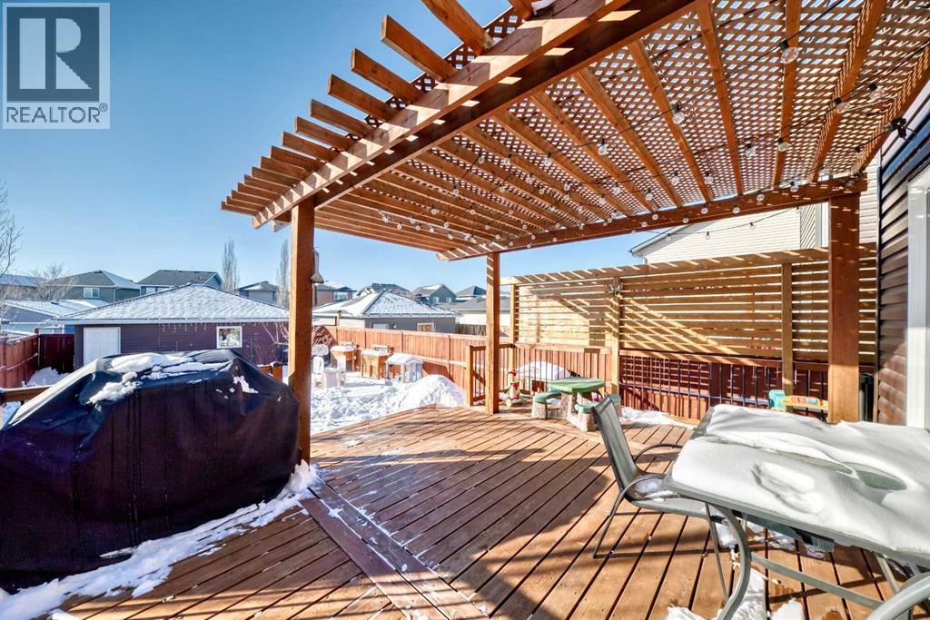 Perfect home for first time owners or a growing family, 2015 vintage 3+ bedroom 2 storey in Airdrie's district of Ravenswood. Lovely curb appeal with covered veranda. Upgraded wood laminate flooring on main floor with tiled front and rear entries. Large and spacious kitchen with 8 foot working island, separate pantry, 9 ft ceilings and tall cabinetry, dining room nook over looks rear yard, spacious great room expanding into flex space before kithen area, main floor laundry room with storage space. 3 Bedroom upstairs, 4 pce ensuite plus 4 pce for other bedrooms, All bedrooms have walk-in closets. Huge lot (142 ft+ long lot with sunny western exposure). Rear yard b. house and garage is about 65 ft long and 30 ft wide., lots of room for children or adults to play. Huge 16 ft X 18 ft wood deck with pergola, small decorative rocked side yards for low maintenance. Completely fenced lot. Basement fully dev'd with 9 foot ceilings, raised floors with laminate flooring, an office/bedroom, large recreation room, large storage room. High efficient furnace, A/C, over sized water heater for future teenagers. Oversized double garage 24 ft wide and 22 ft deep. Large lots are rare without backing onto busy locations. (id:53676)