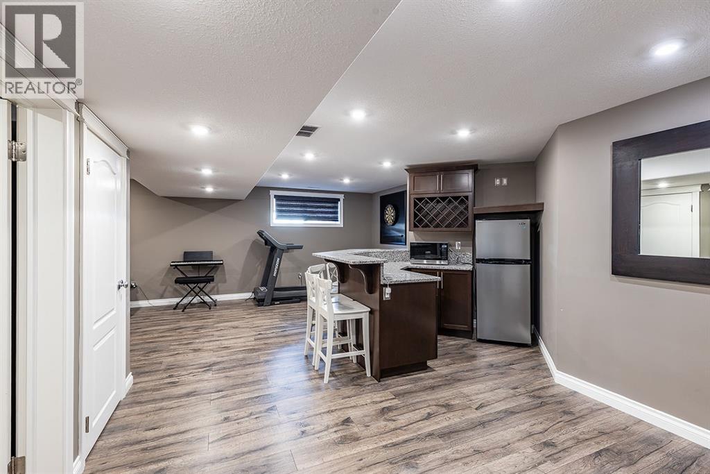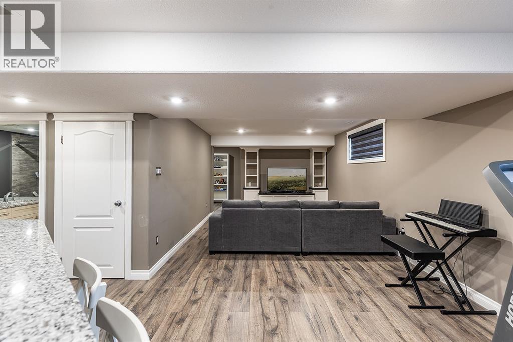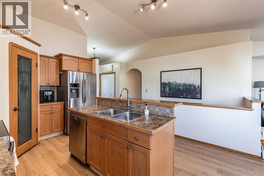 This beautifully designed 1,200+ sq ft bungalow is ideally positioned on a corner lot, showcasing a timeless brick front exterior, masonry fencing, and a thoughtfully planned low-maintenance yard complete with a storage shed. From the moment you enter, you’ll appreciate the bright, open layout enhanced by vaulted ceilings and vinyl plank flooring throughout the main level.The heart of the home is the spacious kitchen, featuring stainless steel appliances, a large island with seating, ample cabinetry, and seamless flow into the dining and living areas—perfect for both everyday living and entertaining. The inviting living room is anchored by a cozy gas fireplace, creating a warm and welcoming atmosphere year-round. Just off the main living space, step onto the oversized deck, ideal for summer barbecues, outdoor dining, or relaxing evenings.The main floor offers two generous bedrooms, including a primary suite with its own ensuite, along with a dedicated office—perfect for remote work or a quiet study space. Main floor laundry adds everyday convenience and completes the highly functional layout.Downstairs, the fully finished basement expands your living space with two additional bedrooms, a modern 3-piece bathroom with walk-in shower, and a well-appointed bar and entertainment area, making it an ideal space for hosting guests, movie nights, or accommodating family and visitors.Additional highlights include a double attached garage, ample storage options, and a layout that offers comfort, style, and practicality. This move-in-ready bungalow combines quality finishes, versatile living spaces, and an excellent location—perfect for families, professionals, or those seeking single-level living with room to grow. (id:53676)