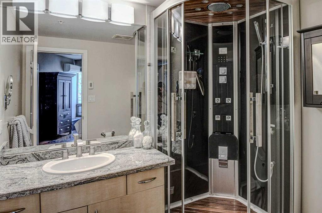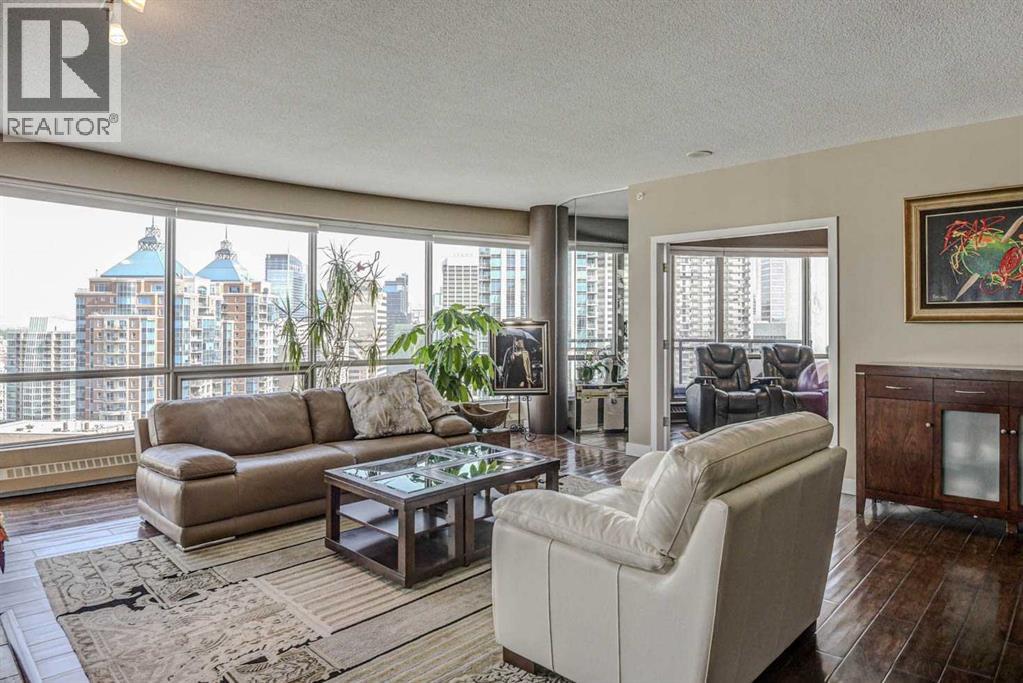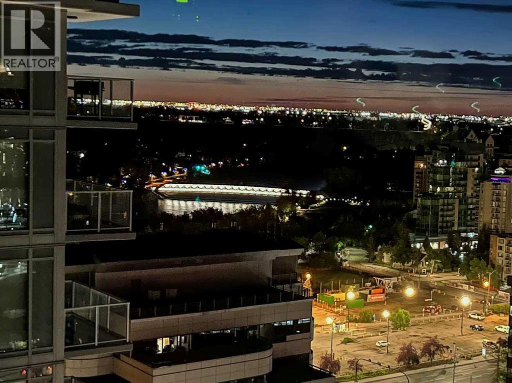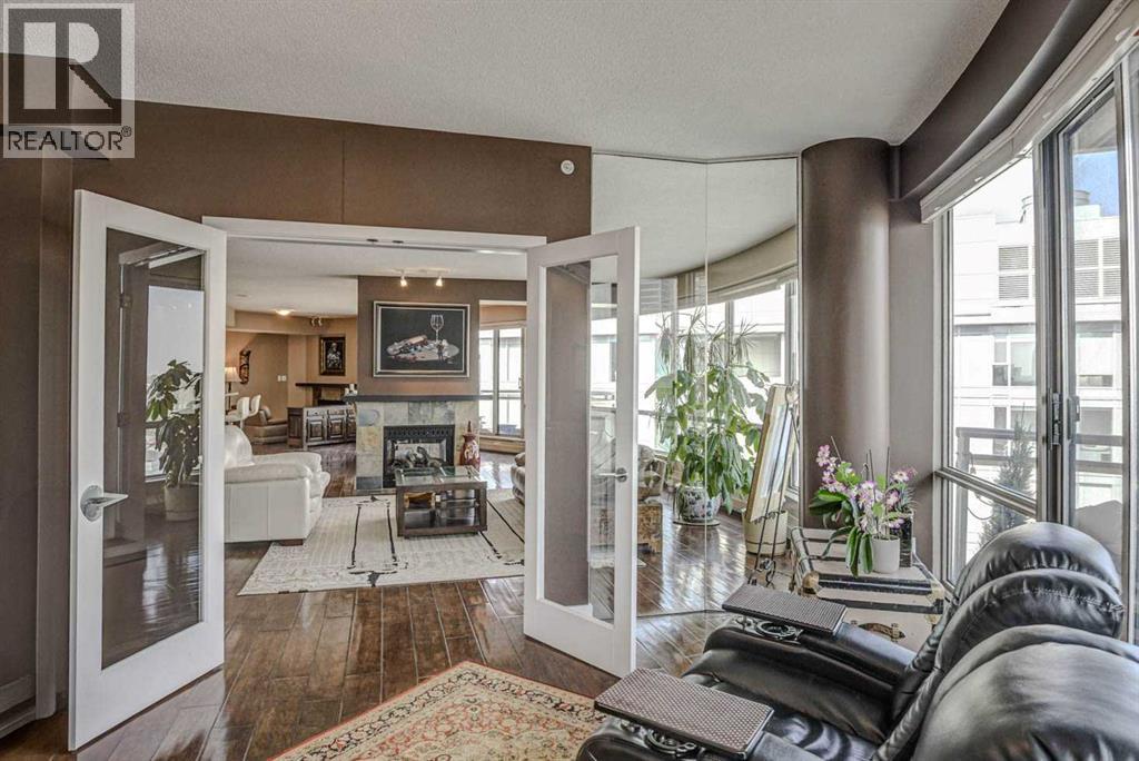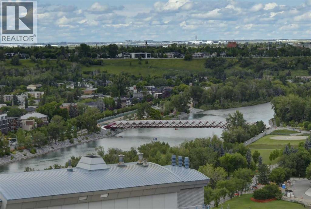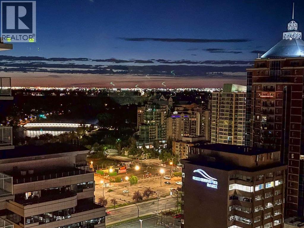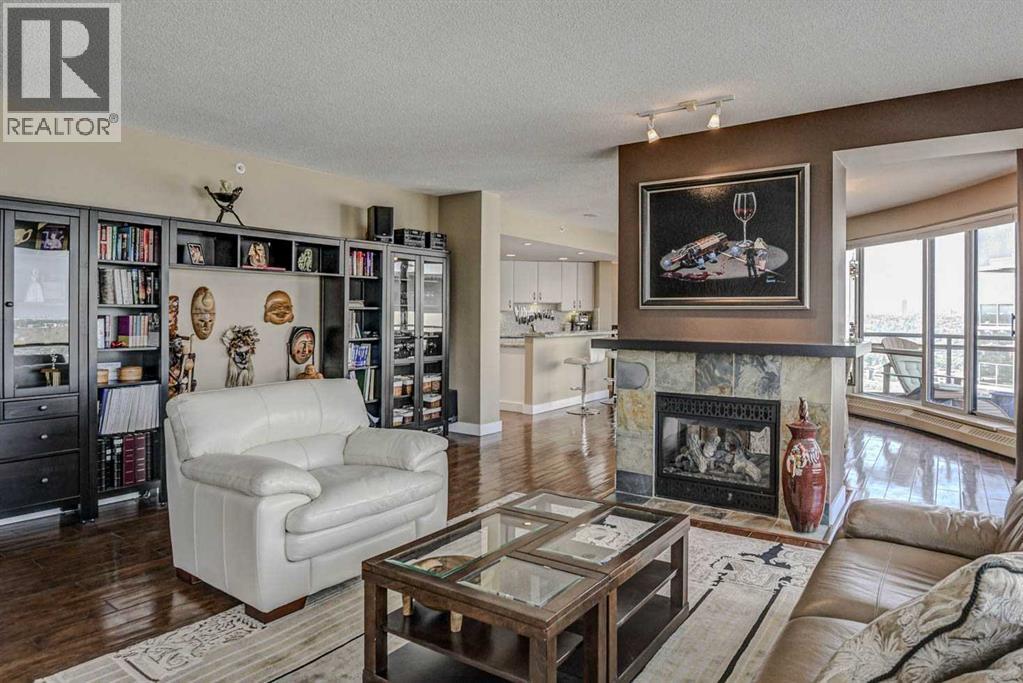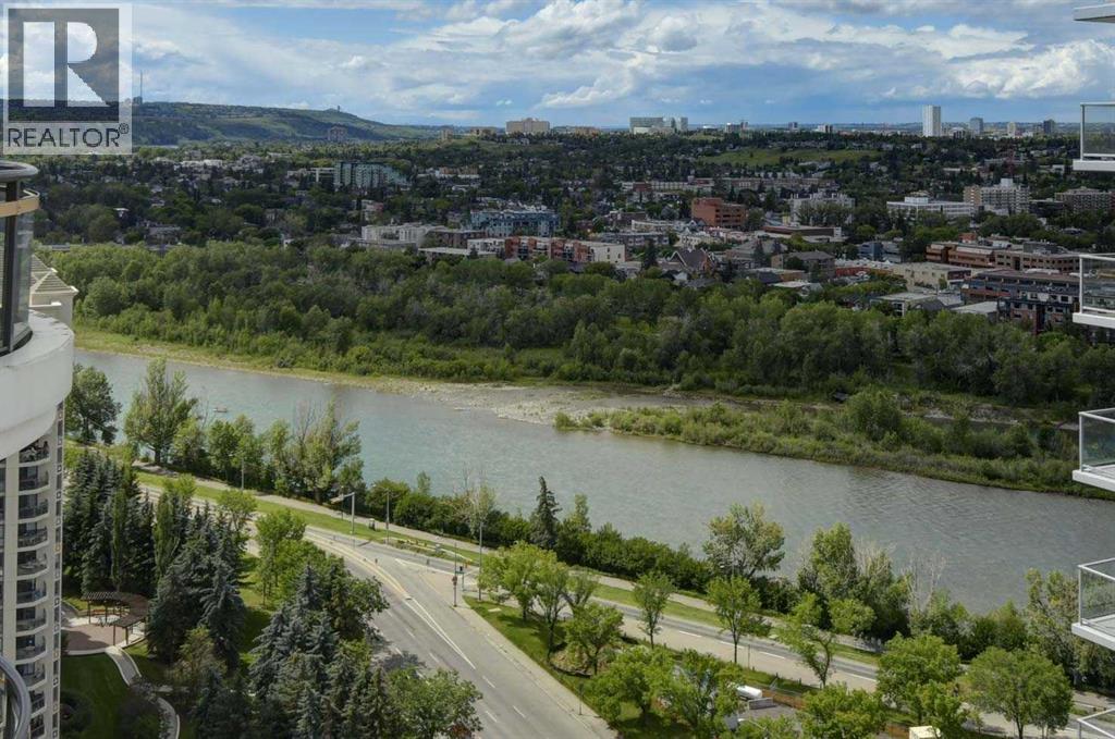 Perched high on the 24th floor of the McLeod at Riverwest building, this stunning 2-bedroom plus a den residence delivers sophisticated inner-city living with panoramic Bow River and skyline views. Spanning over 1,900 sq ft, the elegant curved floorplan wraps around floor-to-ceiling windows, flooding the home with natural light and showcasing a seamless blend of luxury and comfort. The renovated $30K kitchen is a chef’s dream with sleek granite countertops, Stove is double oven induction, stainless steel appliances, updated backsplash, garburator and a raised breakfast bar, all newly painted in crisp white. The living and dining rooms are elegantly anchored by a double-sided gas fireplace, creating a warm and connected atmosphere for entertaining or relaxing. Just off the kitchen, a cozy flex area features a second gas fireplace, a perfect spot to curl up with a book or enjoy a quiet moment away from the main living spaces. French doors lead to a quiet den ideal for remote work or a creative retreat. The primary suite is a tranquil haven with balcony access, dual closets and a 4-piece ensuite featuring in-floor heating and a bidet. The second bedroom is equally refined with its own 3-piece ensuite that includes a spa-style $8K steam shower. A stylish powder room, in-suite laundry with ample storage space, up/down blinds and engineered hardwood add further comfort and style. 3 Air conditioning split systems in the bedrooms and a window unit in the living room provide year-round climate control. Two assigned underground parking stalls and an additional storage unit ensure convenience and peace of mind. The expansive curved balcony offers unobstructed river, Peace Bridge and downtown views, a front-row seat to Calgary’s finest! Residents of Riverwest enjoy access to premium amenities including a fitness centre, indoor pool, and recreation lounge. Set in the heart of the Downtown West End, this unbeatable location is steps to the Bow River Pathway, LRT station, vibrant Kensington and future Green Line. Walk or bike to cafés, shops and restaurants while enjoying all the vibrancy and ease of urban life. A rare opportunity to own a true retreat in the sky, this home offers upscale living in one of Calgary’s most connected and scenic downtown communities! (id:53676)