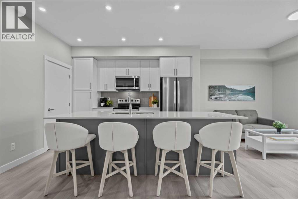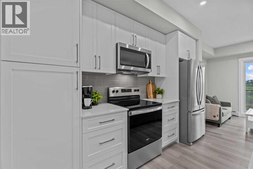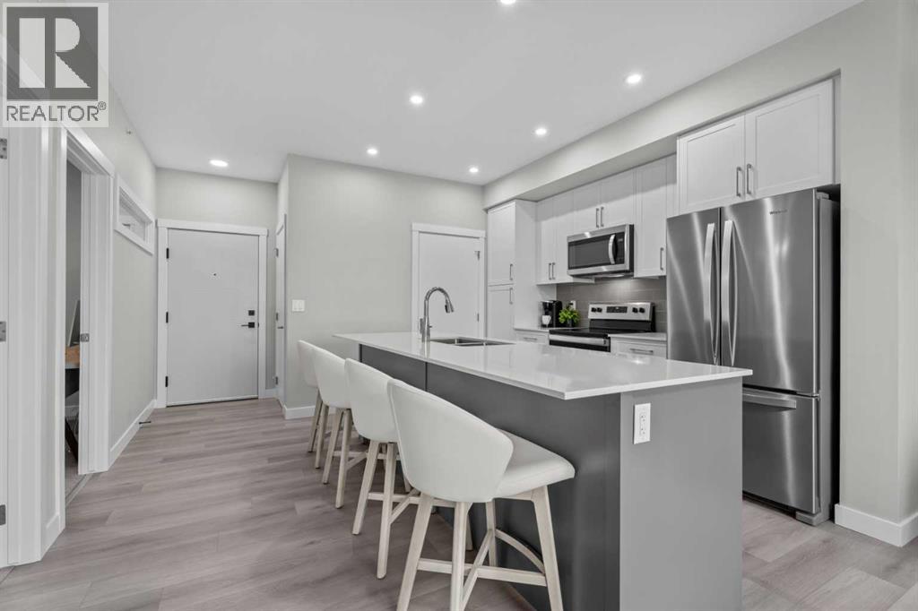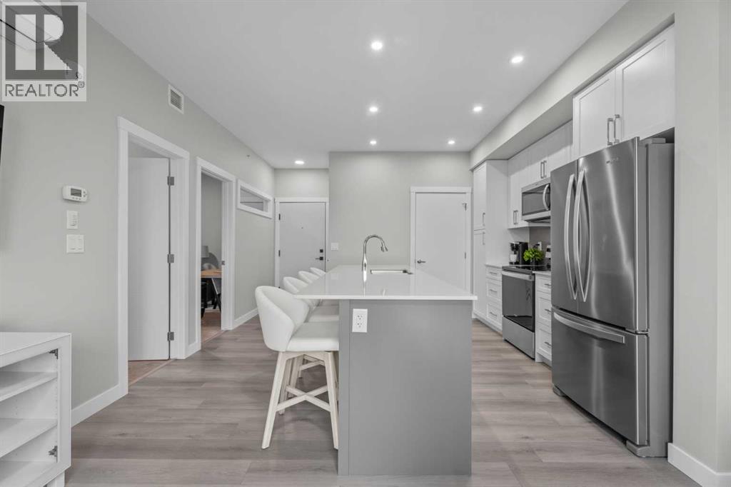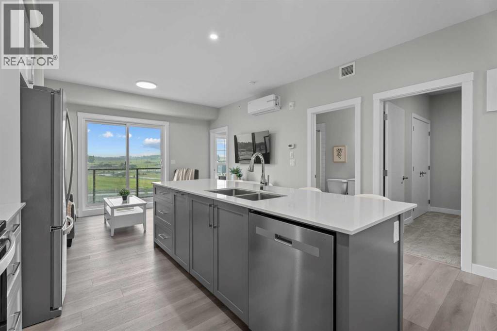 Better Than New in Lawrie Park! Gorgeous new construction without the wait!!Welcome to this gorgeous, upgraded 2 bedroom, 2 bathroom TOP FLOOR condo in the desirable Lawrie Park building in Wedderburn, Okotoks. Still under warranty and loaded with thoughtful upgrades, this home blends comfort, function, and style.Step into a bright white kitchen featuring a massive island, quartz countertops, and durable LVP flooring throughout the main living space. The open concept layout is perfect for entertaining or everyday living. Both bedrooms are spacious, with the primary suite offering a full ensuite and great closet space.Extras like in suite laundry, air conditioning, and a large balcony (with mountain views on a clear day!) overlooking the dog park make this home even more appealing, especially in a pet friendly building! You'll also enjoy the convenience of a heated underground parking stall, separate storage locker, and low condo fees.Located in vibrant Wedderburn, you're close to walking paths, schools, and exciting new commercial development. This condo truly feels better than new, move in and enjoy maintenance free living at its finest! (id:53676)