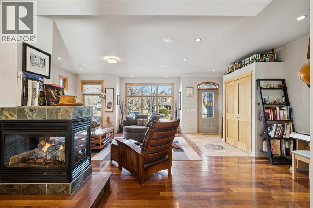 Nestled on a quiet, tree-lined cul-de-sac in sought-after West Hillhurst, this custom-built (2008) detached home offers over 3,700 sq ft of thoughtfully designed living space. Ideally located near schools, Kensington, shopping, the Bow River pathway system, downtown, and major hospitals, the setting seamlessly combines inner-city convenience with the tranquility of a low-traffic street. The bright, open main level is designed for both everyday living and entertaining. A spacious front living room is elegantly separated from the dining area by a three-sided gas fireplace. The expansive kitchen features premium appliances, extensive cabinetry, and a large, functional island. Just off the kitchen, a generous mudroom and private powder room provide practical separation for busy family life. Upstairs, the second level offers two well-proportioned bedrooms with ample closet space and a full four-piece bath. The primary retreat is a true sanctuary, complete with vaulted ceilings, its own gas fireplace, custom built-in cabinetry, a large walk-in closet, and a beautifully appointed ensuite featuring a tiled walk-in shower, fully jetted tub, and double vanity. A full laundry room completes this level. The third floor presents a versatile loft with skylights, south-facing windows, and a full four-piece bathroom with additional storage, creating a warm and inviting space ideal for entertaining, a home office, or a guest suite. The fully developed basement includes a flexible bedroom or exercise room with a walk-in closet, along with a spacious recreation room featuring a wet bar—perfect for family gatherings or movie nights. Additional features include hardwood and tile flooring throughout (no carpet), multi-zone built-in sound wiring, central air-conditioning, low-maintenance landscaping, a sunny south-facing backyard with stamped concrete patio, and a double detached garage. Solidly constructed and meticulously maintained, this timeless home was designed to endure for gene rations. (id:53676)