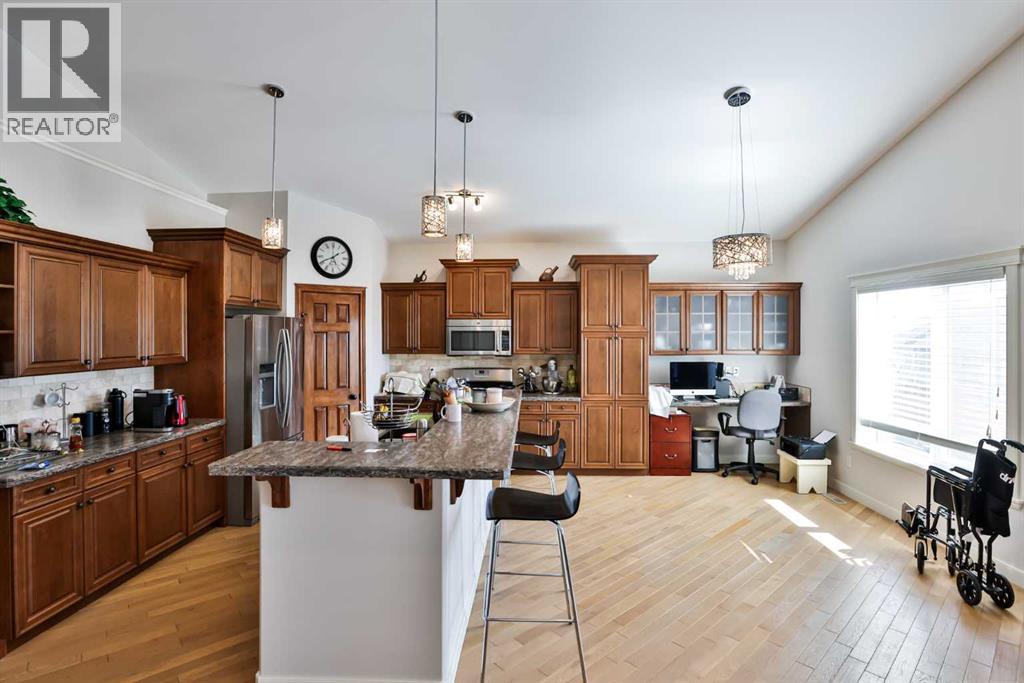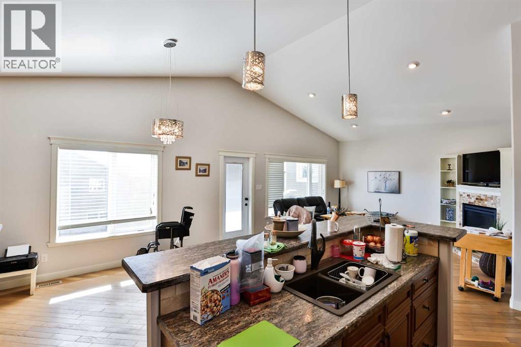 This custom built home has been thoughtfully designed to offer all of the upgrades and conveniences of an executive home with the benefit of a private basement revenue suite. The home's large entry archway with front double attached garage and the master suite windows over the garage, give this home fantastic curb appeal. The home's appeal is further supported by the superior finishes of Hardie board siding, stone, and metal railing. The main floor has a spacious open design with vaulted ceilings, hardwood floors, and the kitchen, dining, and living areas all open to each other. The kitchen cabinets are a gorgeous rich solid maple stained door with dark countertops and complementing tile backsplash. Appliances are stainless steel with a gas stove, over-the-range microwave hood fan, fridge with water, and dishwasher in the island next to the sink. The kitchen and dining are accented by unique custom lighting. There is a lovely deck just off the living room that is partially enclosed for easy enjoyment. The living room has a corner gas fireplace with custom shelves for cozy easy decorating. This main level also offers a second bedroom, dedicated laundry room, and 4 piece bathroom. The master bedroom is up one more level above the garage, boasting a beautiful large primary bedroom with walk-in closet, and a spa-like ensuite with a jetted tub, double vanities, and a glass door shower. The basement suite, with a private walk-out entry, has tall ceilings with large windows for lots of light creating a bright and inviting feeling. The suite offers 2 large bedrooms, a 4 piece bathroom, it's own stacking washer and dryer in a laundry closet, a modest kitchen and eating bar, and a corner gas fireplace. The small backyard is fully fenced with a small covered patio area, a shed, and a private parking pad with convenient back lane access. This custom home has been fabulously maintained with the entire interior of the home having been just freshly painted in a beautiful updated n eutral cream tone creating the perfect fresh canvas for you to start decorating. Call your favorite real estate agent today to view. (id:53676)