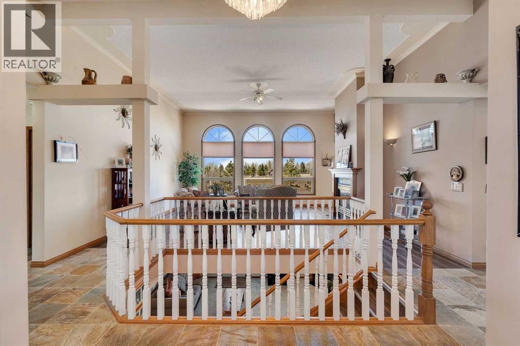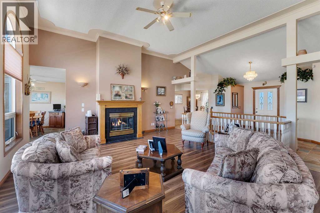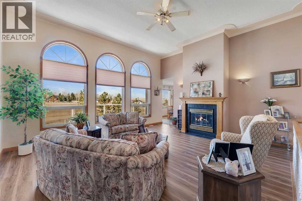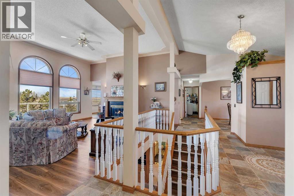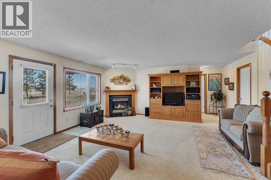 Walkout Bilevel on 4 acres with a triple attached garage and over 3000 sq. ft. of developed living space. This is the kind of property that offers both space and flexibility—inside and out. The main floor is bright and open with high ceilings that make the entire home feel even larger. The living room is anchored by a gas fireplace and flows easily into the white kitchen, complete with ample cabinetry, generous counter space, and a sunny breakfast nook overlooking the property. A formal dining room adds the perfect spot for hosting family dinners or special occasions. There are two bedrooms on the main level, including the primary with its own ensuite, offering a comfortable and private retreat. The fully developed walkout basement expands your living space with 2 additional bedrooms and a den, a large rec room with 2nd fire place, and direct access to the outdoors—ideal for guests, a growing family, or multi-generational living. Outside, the 4 acres provide endless possibilities. Enjoy the privacy, the views, and the freedom to use the land the way you want—all just a short drive from amenities. (id:53676)