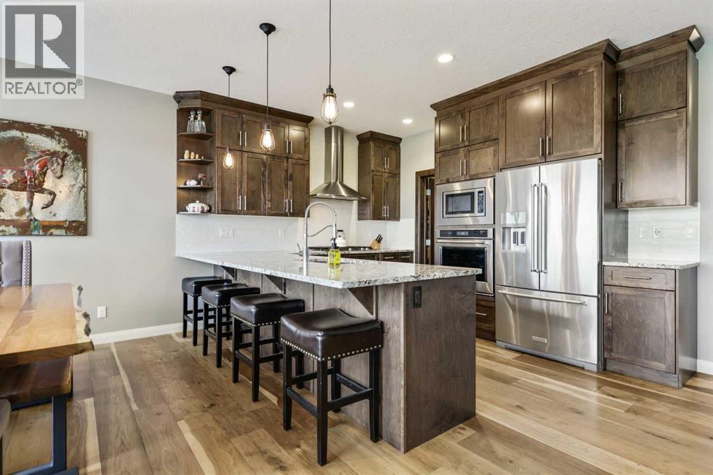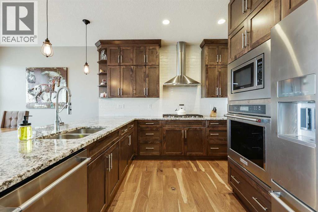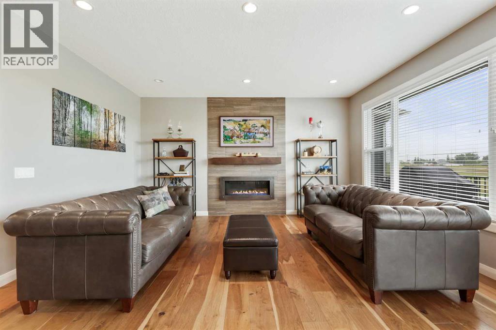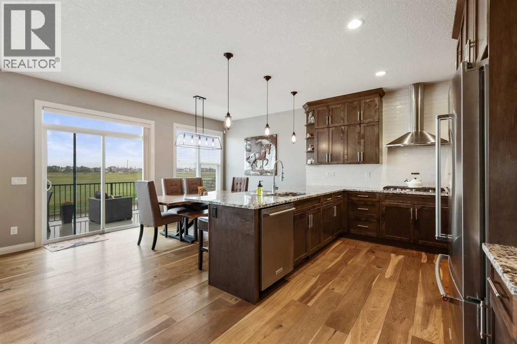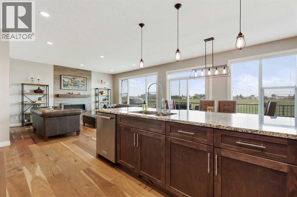 Location, luxury and lifestyle in this fully finished 2 story walkout backing onto hole #3 of the Track Golf Course in beautiful Boulder Creek Estates of Langdon. This exceptional home features water views, almost 2,800 sq ft of living space, central air conditioning and an incredible 5 car heated garage. A designated home office just off the front entrance is the perfect place to work or study away from the main living space. The main living area is a spacious open concept design with an entire wall of windows showcasing your stunning views. Enjoy all the bells and whistles in the chef’s kitchen. Ceiling height cabinetry, granite counters, high end stainless steel appliances including a gas range, wall oven and built-in microwave plus a walk through pantry that even has a coffee bar / butler’s pantry make this your dream kitchen come true. Between the dining room and kitchen is an expansive peninsula with seating perfect for friends and family to gather. The gas fireplace in the living room is both practical and elegant. Gorgeous wide plank hardwood floors and farmhouse inspired lighting throughout add to the charm of this home. The huge upper deck just off the dining room is perfect for outdoor dining, grilling and lounging while taking in your magnificent views. The large mudroom is the perfect place to keep the clutter of outerwear and gear out of your main living space. A 2 pc powder room rounds out this main level. Heading upstairs you’ll find a nice bonus room with a tray ceiling. It’s the perfect place for the family to curl up with a good book or to watch a movie together. The spacious primary bedroom has a large window overlooking your beautiful golf course & water views. Indulge yourself in the spa inspired 5 pc ensuite bath with freestanding soaker tub, large glass shower, heated floors and dual sinks. The oversized walk in closet is another luxury you’re sure to appreciate. The other 2 bedrooms share the main bath which has a door separating the sink f rom the rest of the bathroom making busy mornings a little less chaotic. You’re going to love entertaining with friends and family in the fully finished walk out basement. A rustic wood burning fireplace adds a warm and cozy vibe, and the wet bar, 4 pc bath and luxury vinyl plank flooring offer every convenience you could need. Step out to your covered patio area that leads to your huge outdoor living area. There is tons of lawn space for kids and pets to play, a stone fire-pit area for friends to gather plus manicured flower beds, raised planters and plenty of trees. Don’t miss your chance to call this outstanding home in the charming community of Langdon home. (id:53676)
