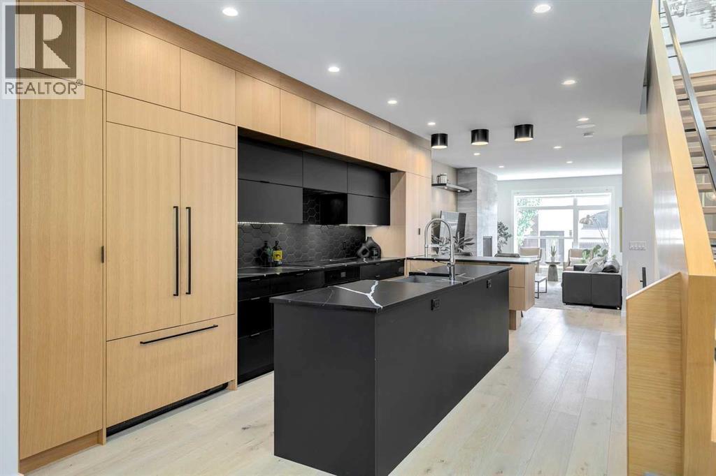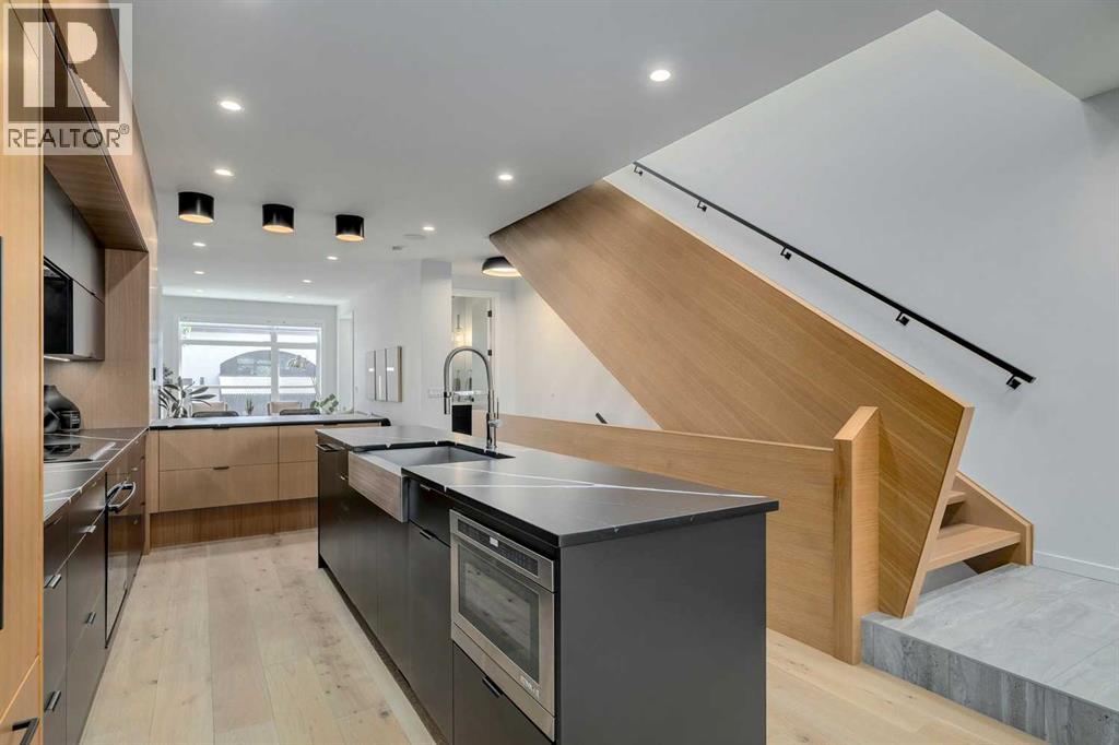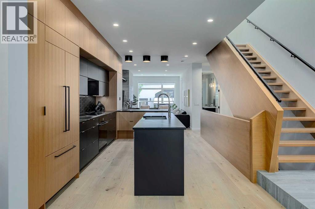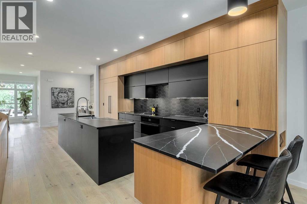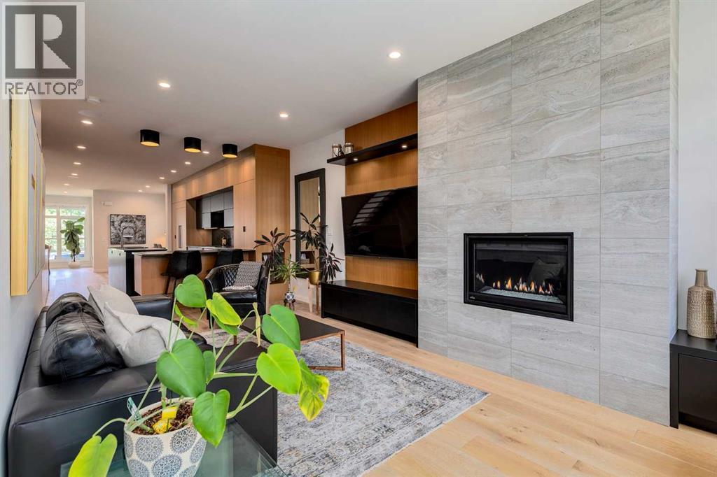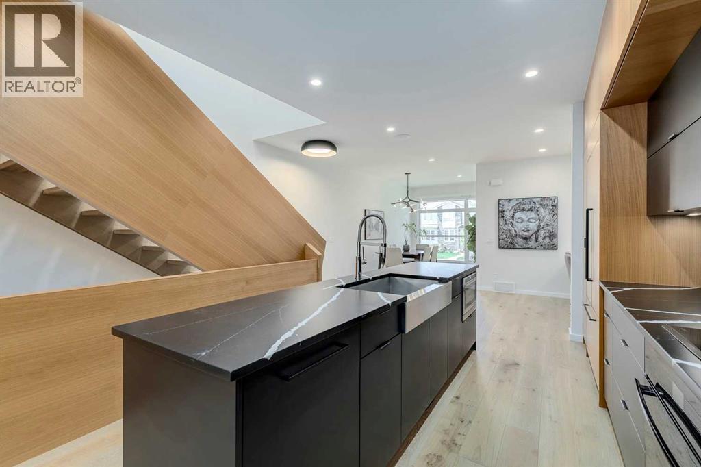 Modern Luxury in Killarney | 3 Bed | 5 Bath | High-End Finishes ThroughoutThis stunning Killarney duplex offers over 2,500 sq. ft. of beautifully finished living space, featuring 3 bedrooms, 5 bathrooms, and a layout designed for modern living and entertaining.The main level boasts 9-ft ceilings, wide-plank hardwood floors, and a striking open-riser staircase. The chef’s kitchen includes floor-to-ceiling cabinetry, built-in appliances, a massive island, and matte black finishes. A dedicated office nook, stylish powder room, and sunlit living room with tile-wrapped fireplace complete the space.Upstairs, the luxurious primary suite includes a spa-like ensuite with a soaker tub, glass shower, dual sinks, and a fully built-in walk-in closet. A spacious second bedroom, bonus room, full laundry, and main bath offer functionality and comfort.The fully developed basement features a large rec area, full wet bar, powder room, third bedroom with private ensuite, and in-floor heating plus second laundry hookup.Outside, enjoy a landscaped backyard with concrete patio and BBQ hookup, a rare drive-through double garage, and extra covered parking. Move-in ready, beautifully designed, and loaded with upgrades — this home is a must-see. Book your private tour today! (id:53676)