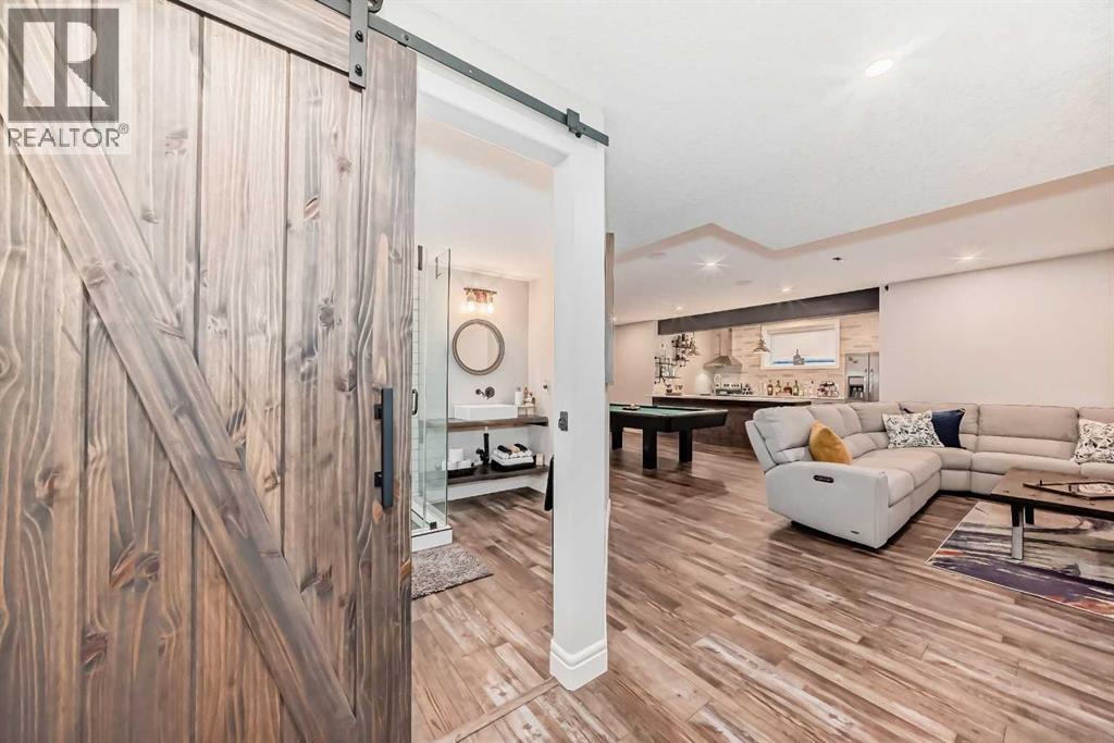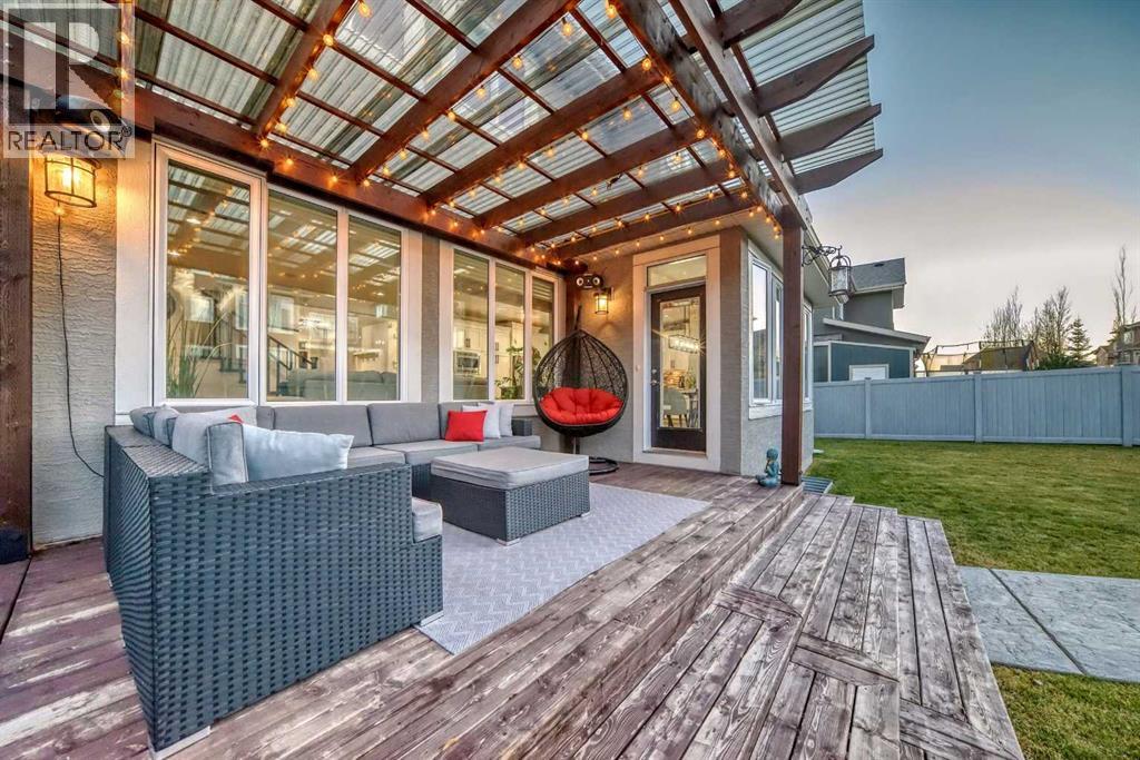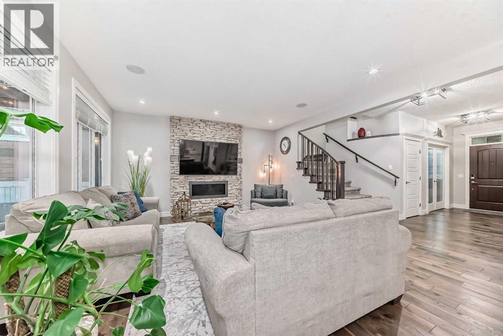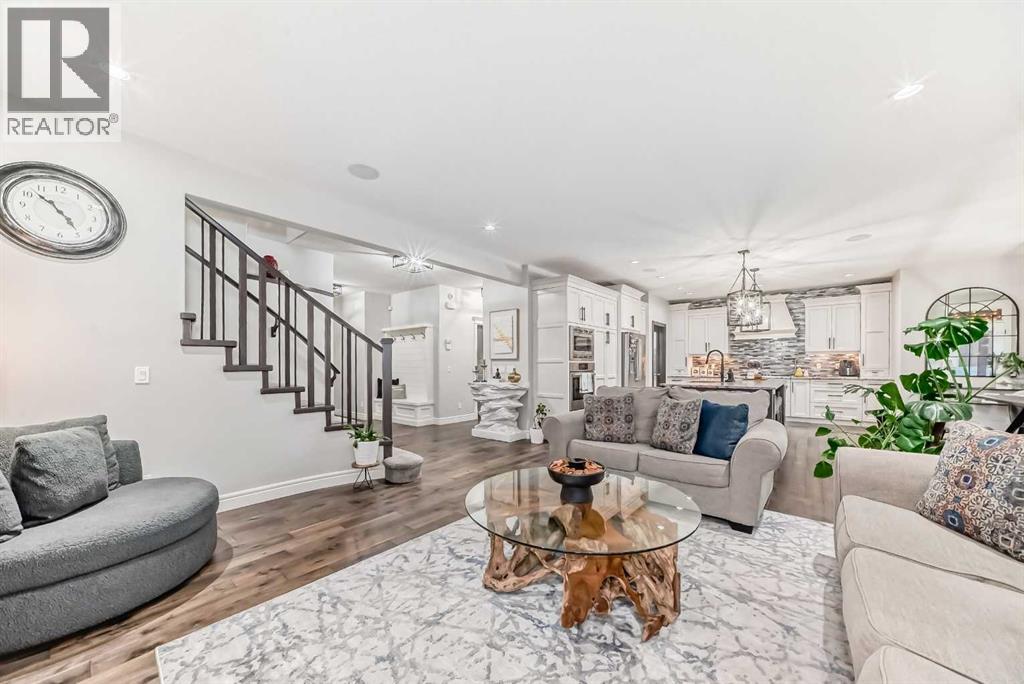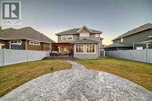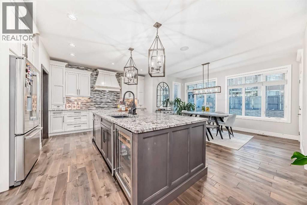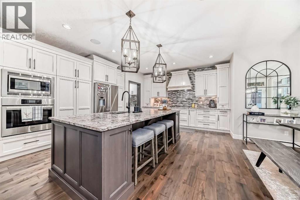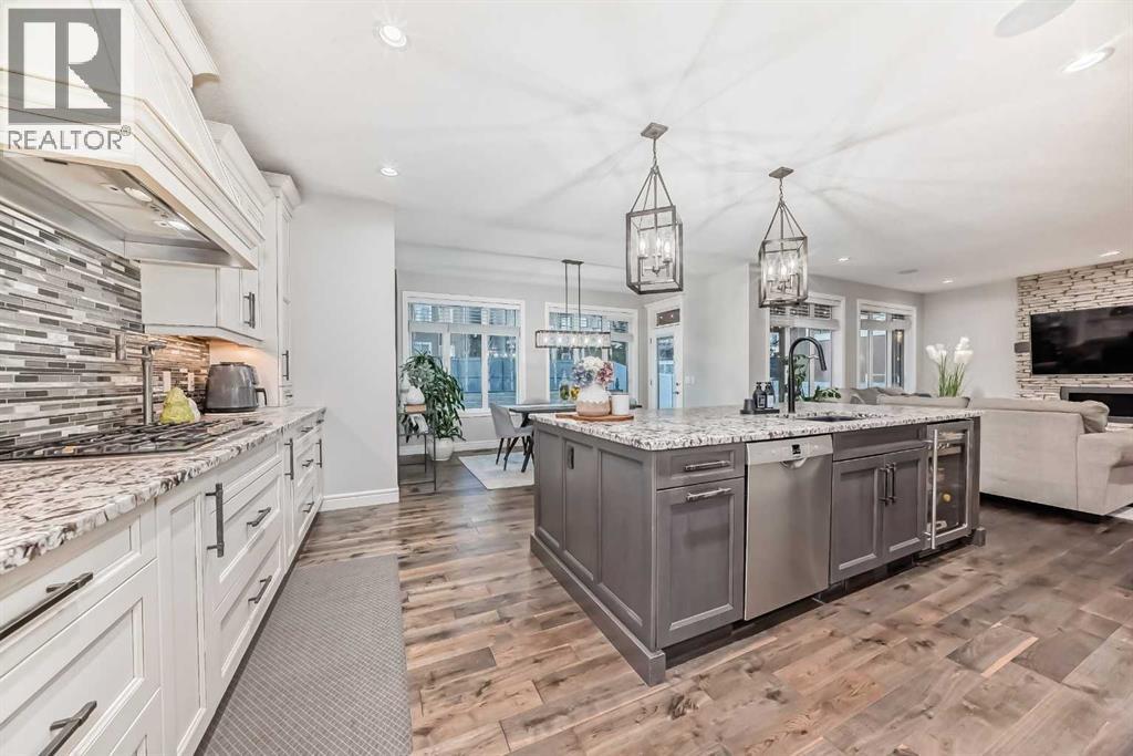 Welcome to this stunning executive home featuring a triple car garage and over 4,098 sq. ft. of beautifully designed living space. With 5 bedrooms, 4 bathrooms, and a main floor office, this residence is nestled on one of Chestermere’s most tranquil and sought-after streets. This home is loaded with high-end finishes and thoughtful upgrades, including new carpet, rich hardwood floors, granite countertops, upgraded and recessed lighting, and a chef’s kitchen outfitted with premium built-in Bosch stainless steel appliances. Additional features include two air conditioning units, central vacuum, built-in speakers, CCTV security cameras, a heated garage, and an exposed aggregate concrete driveway. As you step through the front door, you’re welcomed by a spacious foyer featuring a built-in bench and coat hooks. Just off the entry is a beautifully designed home office, perfectly placed for privacy and productivity. The main floor boasts an open-concept layout ideal for entertaining. The family room offers plenty of seating space and a cozy gas fireplace with a floor-to-ceiling stone surround. The chef’s kitchen is a dream, featuring Bosch built-in stainless-steel appliances, a gas cooktop with a custom hood fan canopy, granite counters, and a kitchen island with a built-in bar fridge for extra beverage storage. A walk-through butler’s pantry with a prep sink provides additional storage and connects seamlessly to the mudroom, which includes built-in cabinetry, a bench, and coat hooks. The dining area is located at the back of the home, filled with natural light from large windows and providing easy access to the backyard. A conveniently located 2-piece bathroom completes the main level. The backyard is a true outdoor retreat with a covered deck, a generous grassy area with mature trees, and a stamped concrete pathway leading to a separate patio with seating around a cozy fire pit — ideal for relaxing or entertaining guests. Upstairs, you'll find four generously sized bed rooms, each featuring custom-built walk-in closets. A bright and spacious bonus room with vaulted ceilings offers additional space for relaxation or play. The luxurious primary suite is the ultimate retreat with tray ceilings, a spa-inspired 5-piece ensuite that includes dual vanities, a freestanding soaker tub, a custom tile shower with bench, and a massive walk-in closet with custom built-ins. A full 4-piece bathroom and a well-placed laundry room complete the upper level. The fully finished basement is designed for entertaining, with 9-foot ceilings and a large open family and recreation area. A stylish wet bar includes an island with a fridge, stove, and dishwasher — perfect for hosting. The lower level also features a fifth bedroom and a modern 3-piece bathroom with a custom walk-in shower. (id:53676)