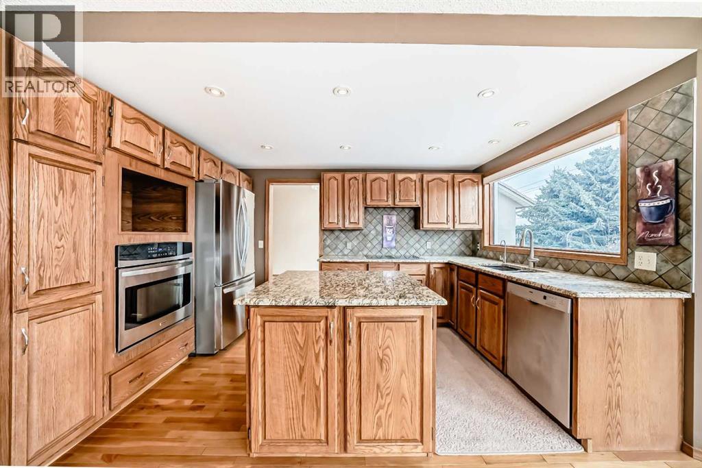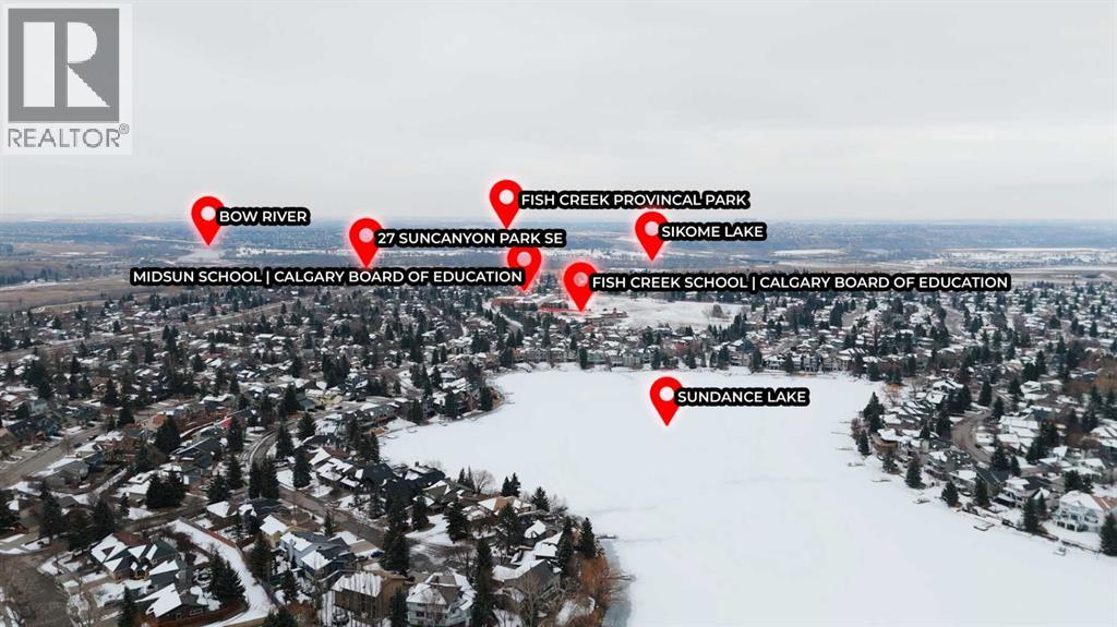 Incredible 4 bedroom 3 bathroom home with walk out basement and prime crescent location in prestigious estates area of Sundance - Welcome home to 27 Sun Canyon Park SE! The main level showcases a front living room with dramatic vaulted ceilings, formal dining room, & family room with custom built-ins and classic wood-burning fireplace - perfect for everyday living & entertaining! The bright & spacious kitchen features granite countertops, stainless steel appliances, and breakfast nook with direct access to the brand new expansive upper deck, flowing effortlessly into the casual dining area. Located just off the garage, the practical laundry and mudroom includes a dedicated dog door leading to a small, private fenced run. A two piece bathroom completes the main level. Upstairs, the primary suite is built for relaxation, offering a spacious walk-in closet with reconfigurable storage and 5-piece ensuite complete with dual vanities, jetted tub, & a glass-enclosed slate-tiled shower. Three additional bedrooms—one with a convenient 5-piece dual access ensuite—complete this level, providing plenty of space for a growing family. The fully developed walk-out basement provides versatile extra living space, featuring a family room with gas fireplace and a dedicated recreation area, all with easy access to the yard through the sliding doors. Step outside to find the expansive, sunny south-facing yard which offers total privacy with no neighbours behind. Enjoy the view from the newer upper composite deck with glass railings, or head out the back gate for direct access to the vast trail system of Fish Creek Provincial Park. Recent property upgrades include dual furnaces, dual hot water tanks, and a water softener all replaced in 2021, new upper patio in 2024, and central air conditioning for year-round comfort. For those with multiple vehicles or hobbies, the oversized triple attached garage is a major standout. This prime location is just a short walk to schools, Sikome Lake, an d the historic Bow Valley Ranche, while providing full Sundance Lake privileges for year round recreation. It’s more than a house; it’s a rare lifestyle opportunity in a premier lake community. Book your viewing today! (id:53676)