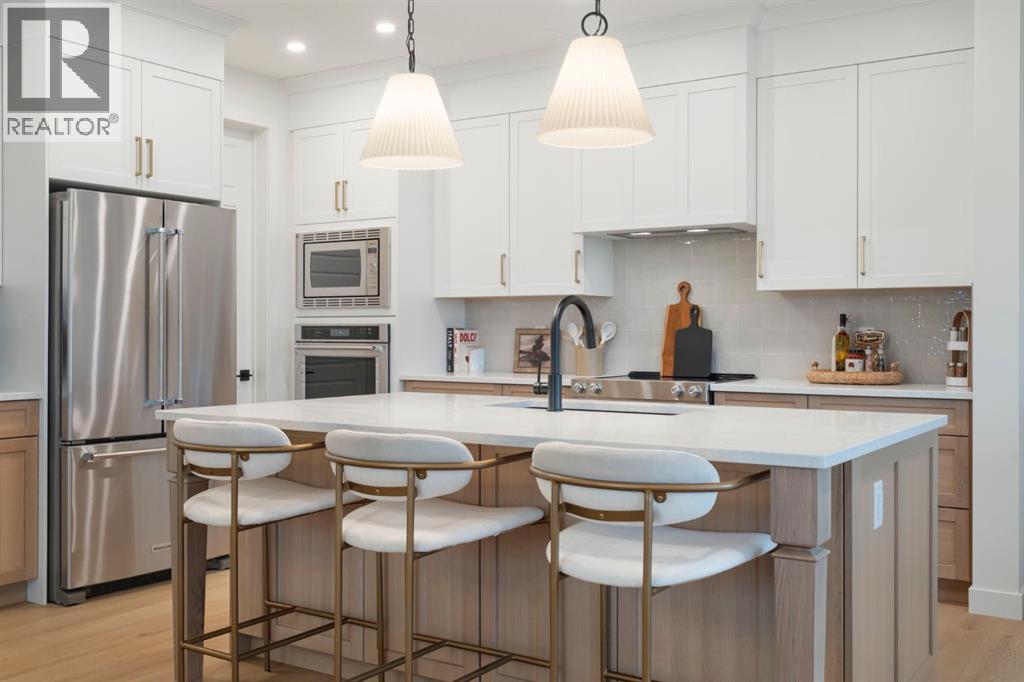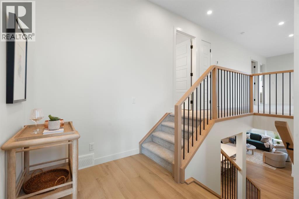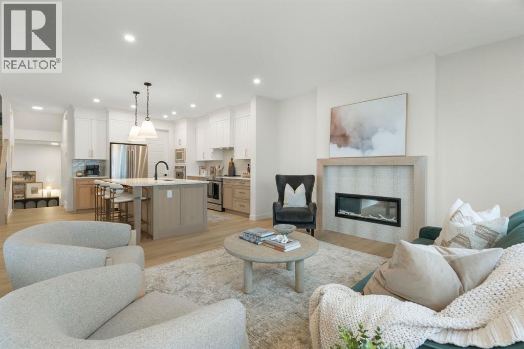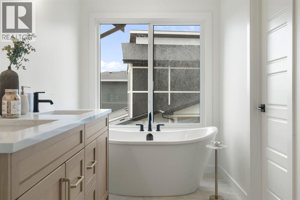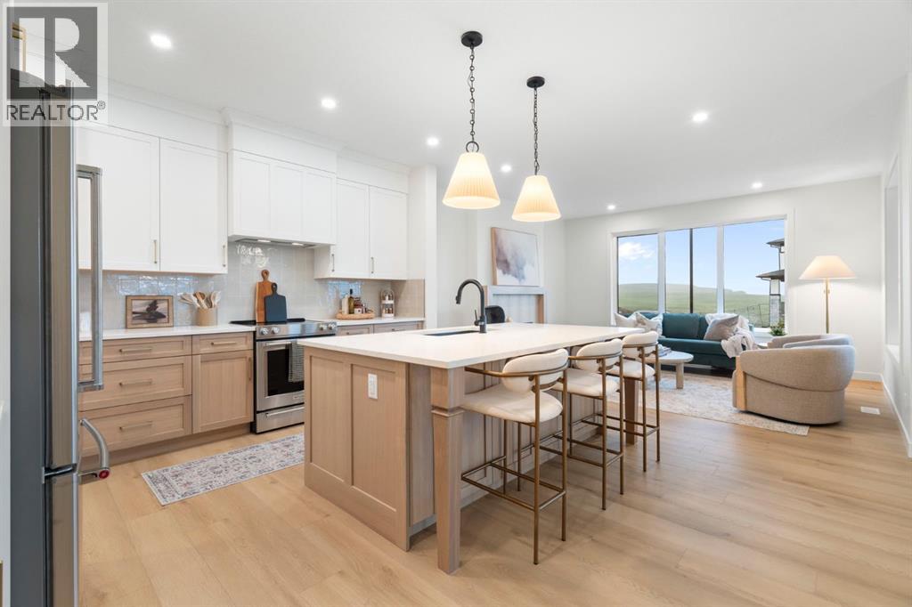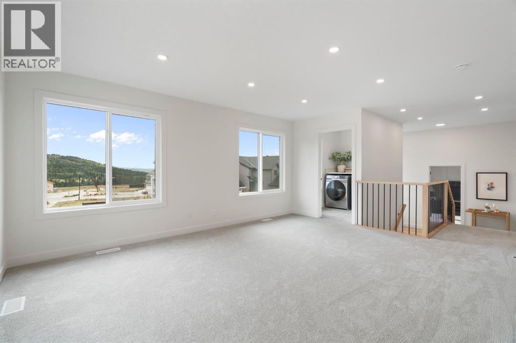 Discover your new home located in the exclusive community of Pinnacle Estates at Sunset Ridge in Cochrane. Introducing the MIA model by Aspen Creek Designer Homes, voted Cochrane Builder of the Year two years in a row. With over 3,100 sq. ft. of developed living space, this corner-lot home is designed for both function and style.A wraparound front porch sets the tone, offering incredible views from all angles. Inside, the spacious entryway flows into a built-in mudroom with coat racks and bench, along with a convenient powder bath. The main floor showcases an open-concept design filled with natural light from oversized windows. The kitchen is a true standout with custom cabinetry, stainless steal appliances, quartz counters, double ovens, and a walk-in pantry with built-in shelving. A tucked-away work space is ideal for those needing a home office. The living room centers around a cozy electric fireplace, while patio doors off the dining area open to the covered porch that is perfect for entertaining or unwinding.Upstairs, the primary suite is privately set apart and features wainscoting detail, a large walk-in closet with custom shelving, and a spa-inspired ensuite with a soaker tub and glass shower. Just outside, the coffee bar on the landing adds a thoughtful touch. Two additional bedrooms with large closets, a generous sun filled bonus room, a 4 piece bathroom with ample counter space and storage for all the linens with a laundry room that completes the upper level.The fully finished lower level includes a spacious rec room, additional bedroom, full bathroom and plenty of storage. The outside yard has been fully covered with sod and is yours to personalize with space for a trampoline, garden or fire pit to spend those summer nights. All of this located one block from RanchView School (K-8), parks, and new pathways leading to the historic Cochrane Ranchehouse. Book your showing today! (id:53676)