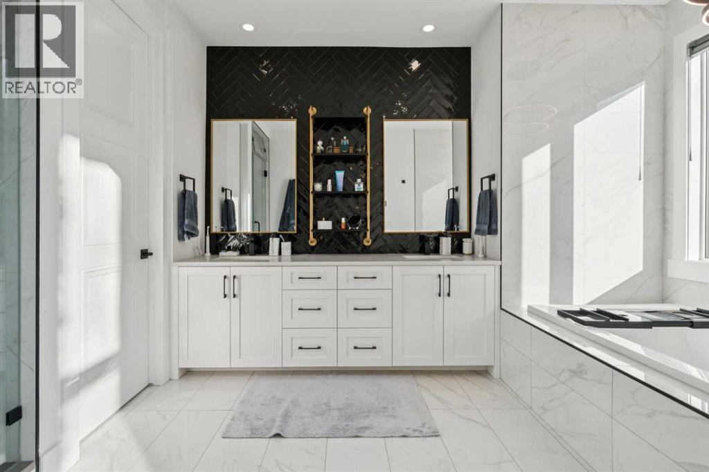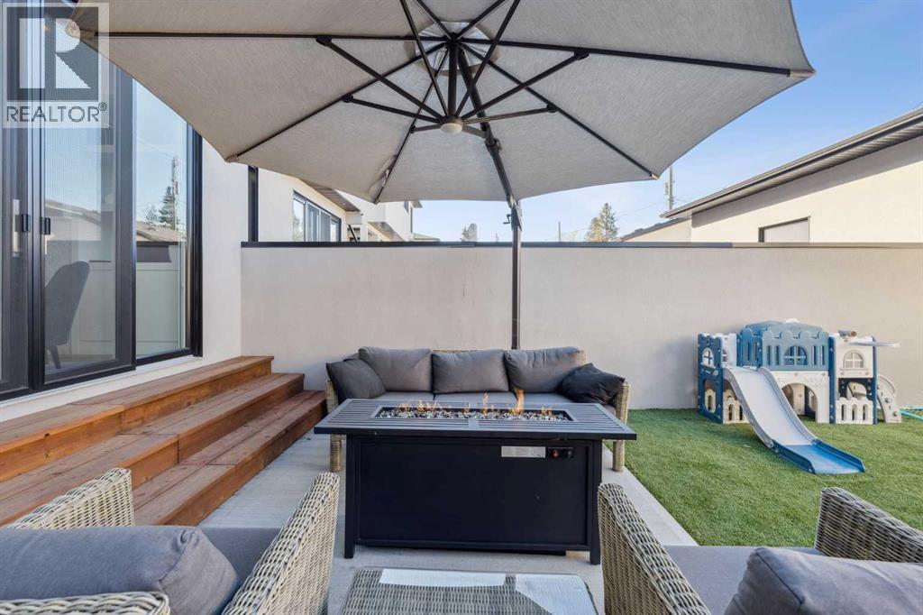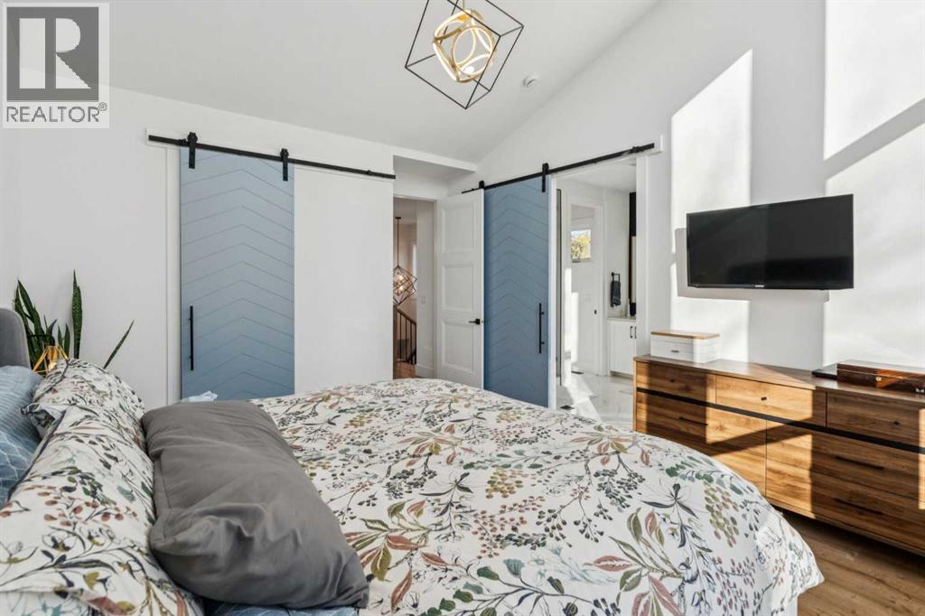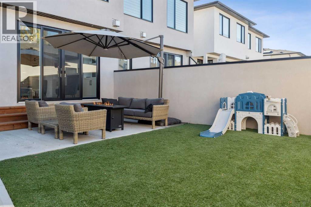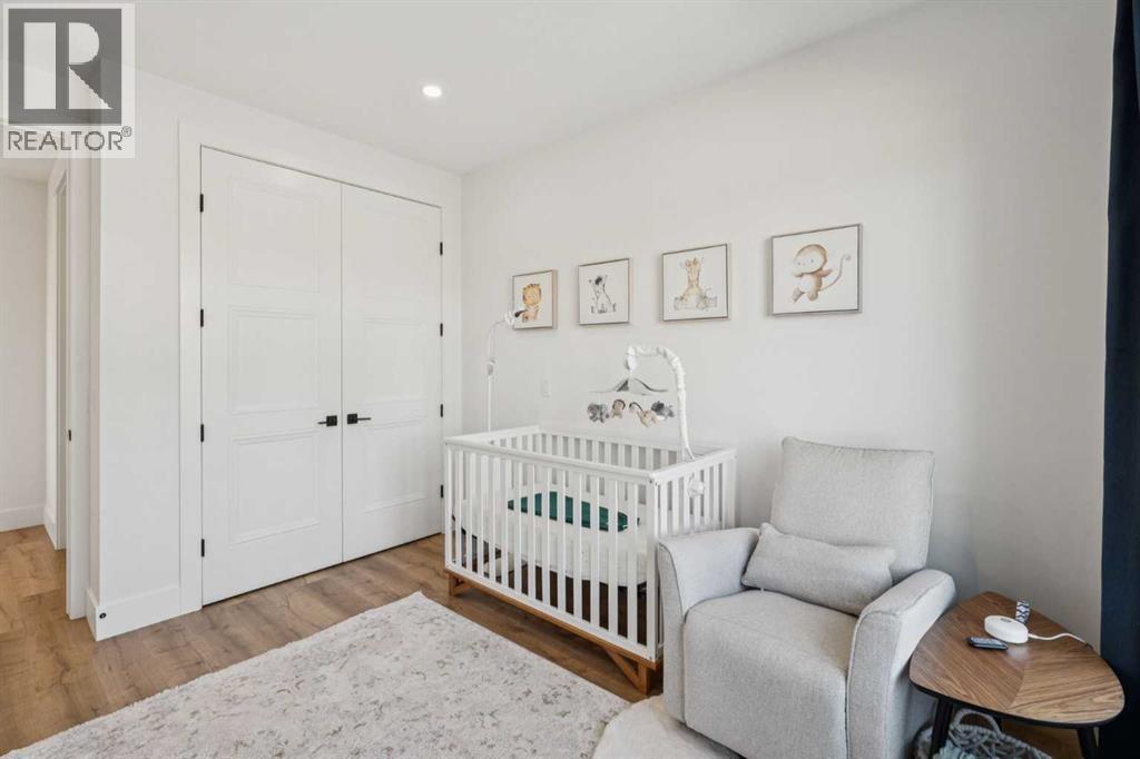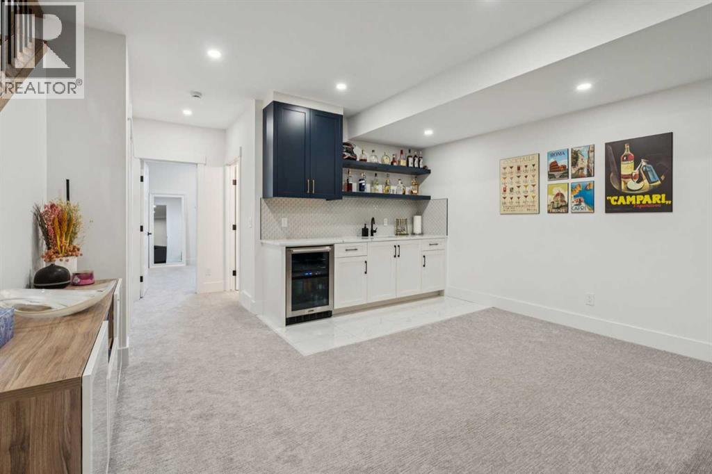 Welcome to 2801 43 Street SW, a pristine 2021 custom build by Royal Model Homes. Set on a quiet, family-friendly street around the corner from a park and playground, this home showcases thoughtful upgrades. The main floor is designed for easy living and entertaining with 9-ft ceilings, premium 20-mil ceramic-finish LVP, Bosch 800 Series appliances, and Hunter Douglas window coverings. The open plan flows from dining to kitchen to living room and out to a low-maintenance west backyard with concrete patio and turf—perfect for sunny afternoons and relaxed evenings. Upstairs, the primary retreat is vaulted to roughly 16 ft with a spa ensuite featuring in-floor heat, steam shower, and an air-jetted two-person tub, plus a walk-in closet. Secondary bedrooms are well sized with custom MDF closet built-ins; there’s an additional 4-pc bath and convenient upper laundry. The developed lower level adds a sleek bar wall with fridge, rec area, 4th bedroom, 4-pc bath, and in-slab hydronic heat. Extras: ceiling speakers on all three levels, sound-insulated rec ceiling and powder room, heated garage, central A/C, 90-U.S.-gal hot water tank, water softener, and under-stairs storage. Move-in ready, stylish, and low maintenance in a prime southwest location. (id:53676)