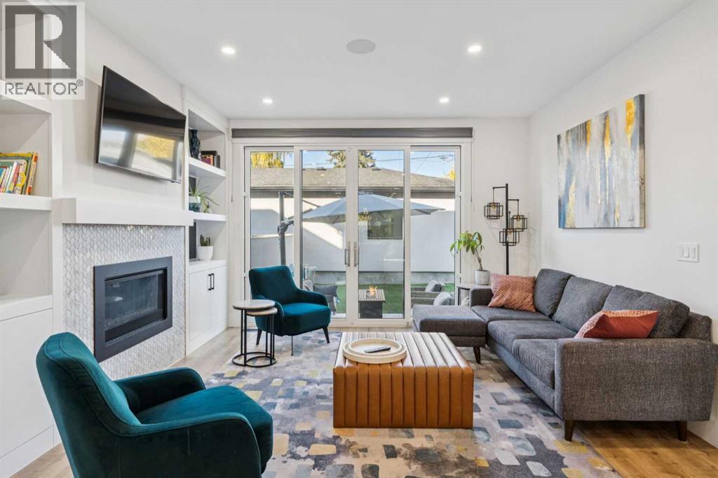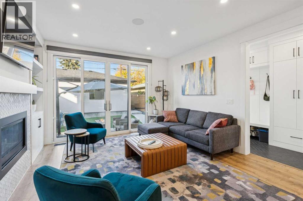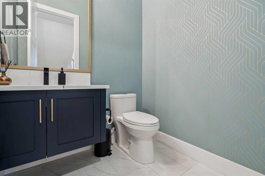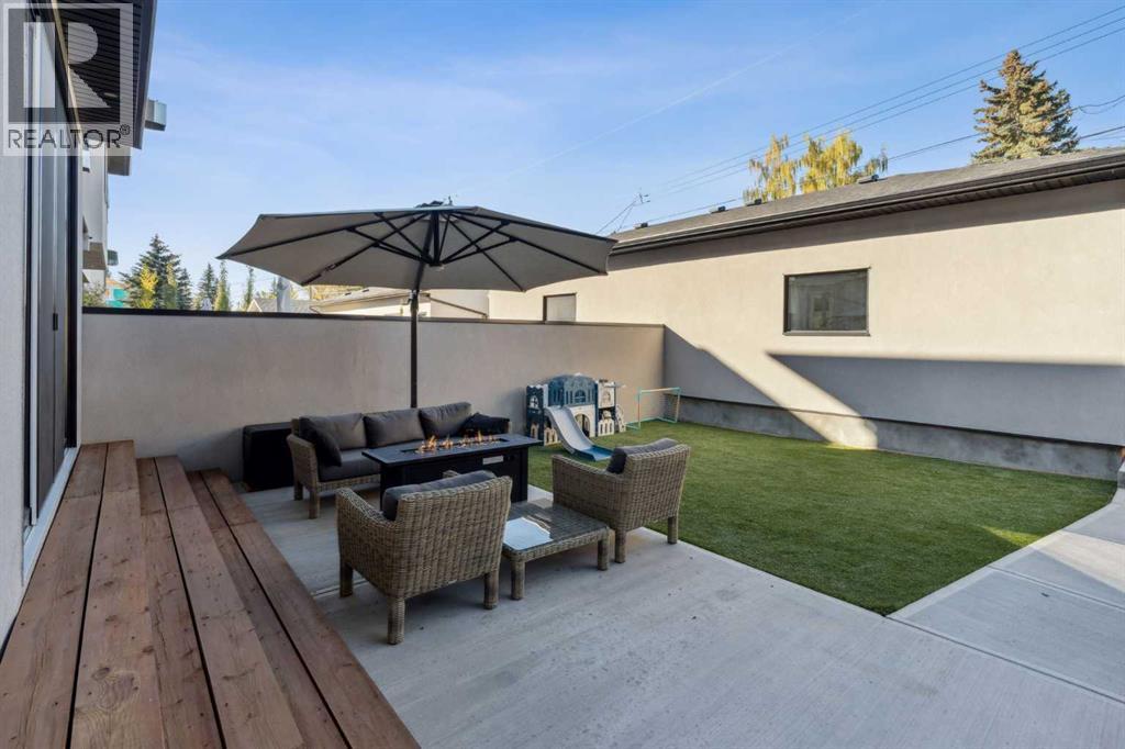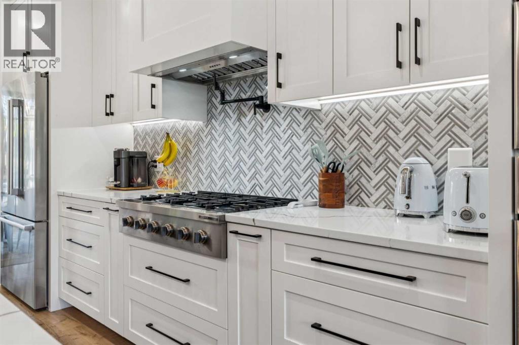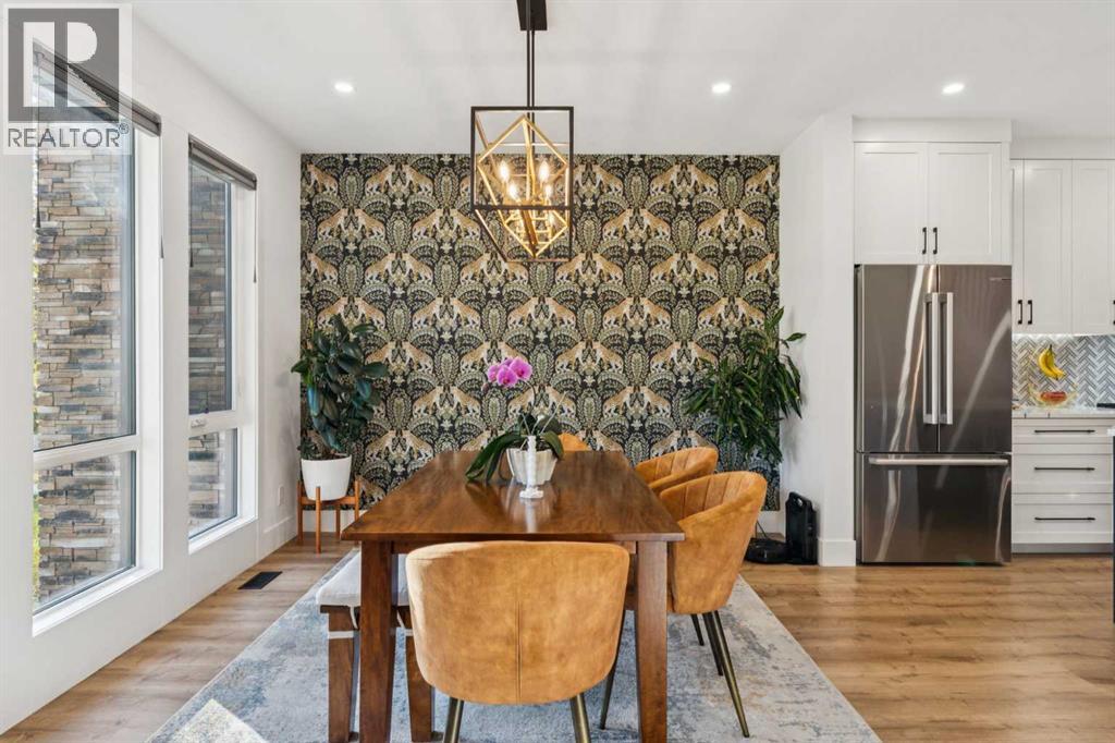 Welcome to 2801 43 Street SW, a pristine 2021 custom build by Royal Model Homes. Set on a quiet, family-friendly street around the corner from a park and playground, this home showcases thoughtful upgrades. The main floor is designed for easy living and entertaining with 9-ft ceilings, premium 20-mil ceramic-finish LVP, Bosch 800 Series appliances, and Hunter Douglas window coverings. The open plan flows from dining to kitchen to living room and out to a low-maintenance west backyard with concrete patio and turf—perfect for sunny afternoons and relaxed evenings. Upstairs, the primary retreat is vaulted to roughly 16 ft with a spa ensuite featuring in-floor heat, steam shower, and an air-jetted two-person tub, plus a walk-in closet. Secondary bedrooms are well sized with custom MDF closet built-ins; there’s an additional 4-pc bath and convenient upper laundry. The developed lower level adds a sleek bar wall with fridge, rec area, 4th bedroom, 4-pc bath, and in-slab hydronic heat. Extras: ceiling speakers on all three levels, sound-insulated rec ceiling and powder room, heated garage, central A/C, 90-U.S.-gal hot water tank, water softener, and under-stairs storage. Move-in ready, stylish, and low maintenance in a prime southwest location. (id:53676)