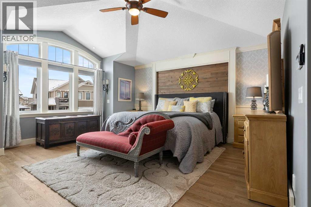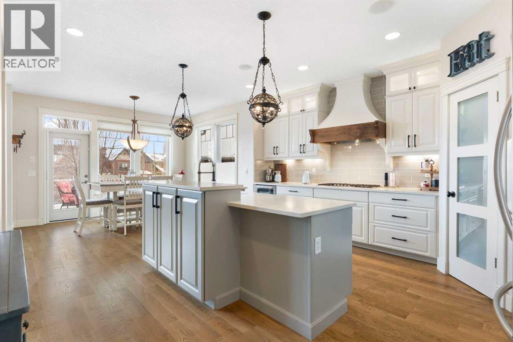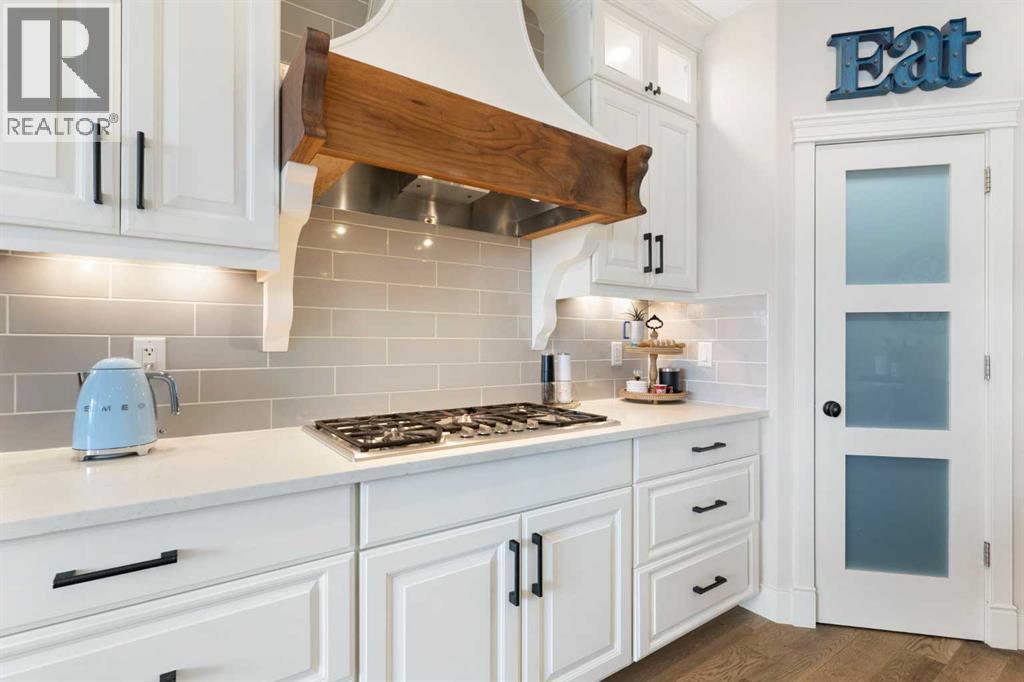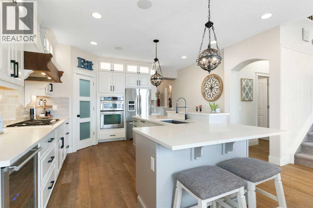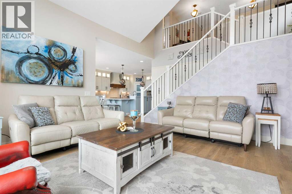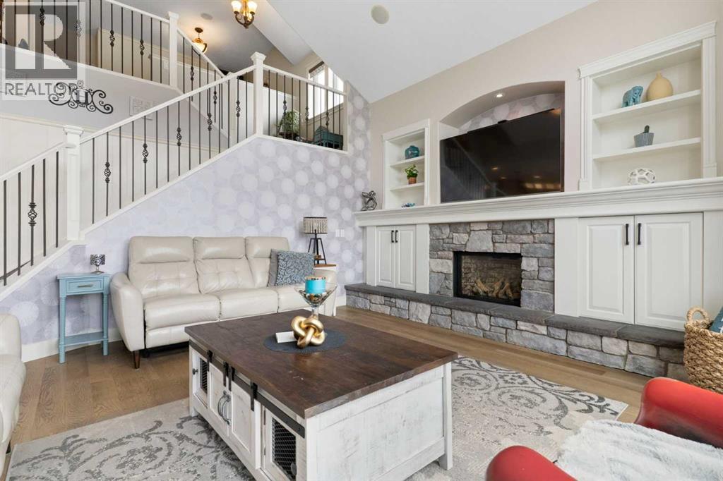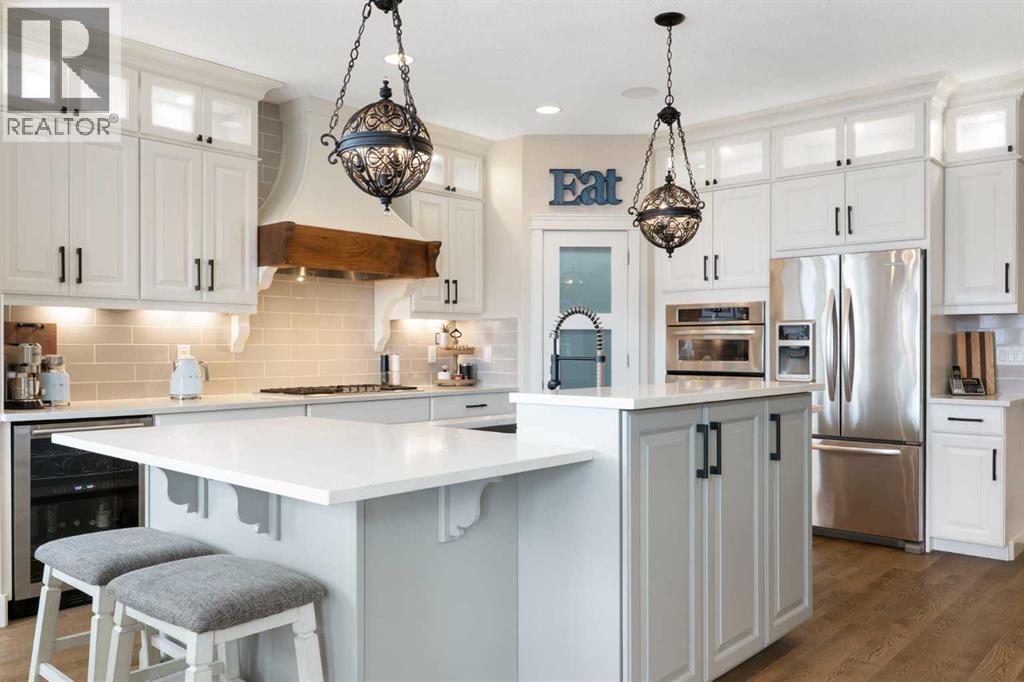 Hello, Gorgeous! Welcome to this beautifully renovated executive walkout home in the highly sought-after community of Coopers Crossing in Airdrie. Offering over 2,500sq ft. above grade plus a fully developed walkout basement, this home blends impressive architectural spaces with thoughtful custom finishes throughout. Step inside to a stunning entry featuring stacked stone accents, rustic beams, and an inviting sense of craftsmanship that continues throughout the home. The main floor includes a private office with glass French doors, perfect for working from home or flexible use as a dining space or additional bedroom. At the heart of the home is the dramatic great room with soaring 14-foot vaulted ceilings, arched windows, and a beautiful fireplace feature wall that fills the space with natural light from the west-facing backyard.The chef-inspired kitchen is designed for both everyday living and entertaining, featuring a large island, quartz countertops, professionally painted two-tone cabinetry, custom organizers, and a striking solid walnut hood fan. Premium appliances include KitchenAid, Bosch, Thermador, and MasterChef, along with a gas range, wall oven, beverage cooler, and walk-in pantry. Upstairs, a welcoming loft creates an additional living space for relaxing or family time. Two spacious bedrooms share a well-appointed bathroom, while the impressive primary retreat offers vaulted ceilings, custom wall detailing, and a luxurious ensuite with heated floors, double vanity, soaker tub & separate water closet. The fully developed walkout basement adds incredible flexibility with a gorgeous second full kitchen, large recreation area, full bathroom, wine/cool room, and a spacious additional bedroom or versatile flex room with built-in Murphy bed. With its high-end finishes and thoughtful layout, this level is ideal for entertaining or multi-generational living. Outdoor living is just as impressive with a west-facing backyard, a 300sq ft. Duradek balcony with glas s railing, natural gas line for BBQ, and a walkout patio below with additional gas connections and hot tub rough-in, plus two storage sheds. The beautifully landscaped yard features custom concrete work, mature trees and shrubs, and a 7-zone irrigation system. Completing the home is a triple attached garage plus shop area, with epoxy floors, forced-air heating, workshop wiring, EV/welder outlets, and extensive built-in storage. Located in one of Airdrie’s most desirable communities, close to parks, pathways, schools, and amenities, this exceptional home offers the perfect combination of space, luxury, and functionality. (id:53676)