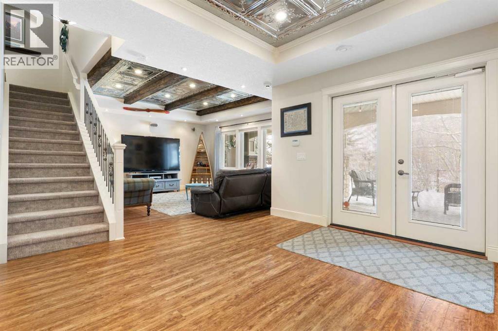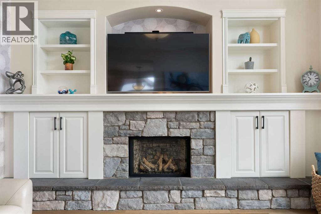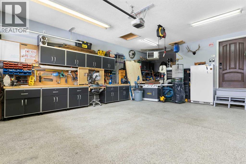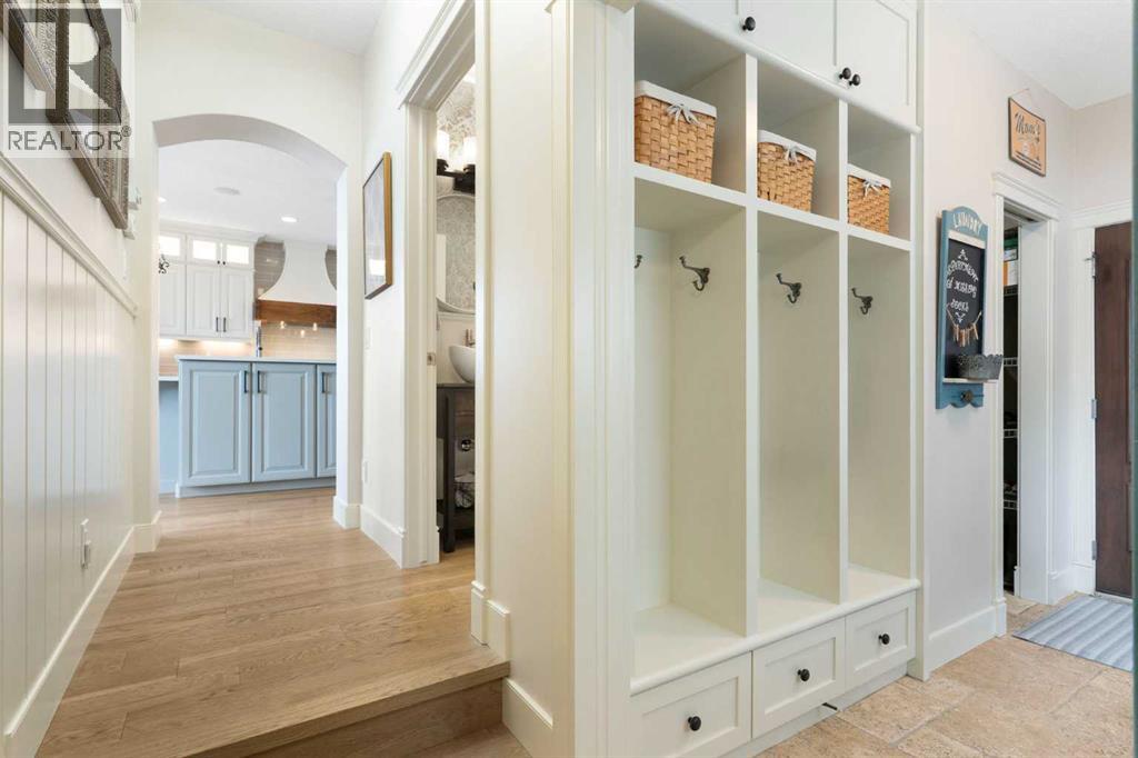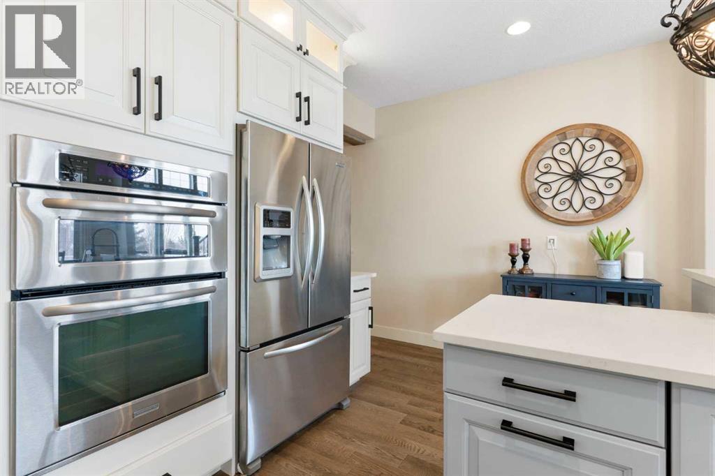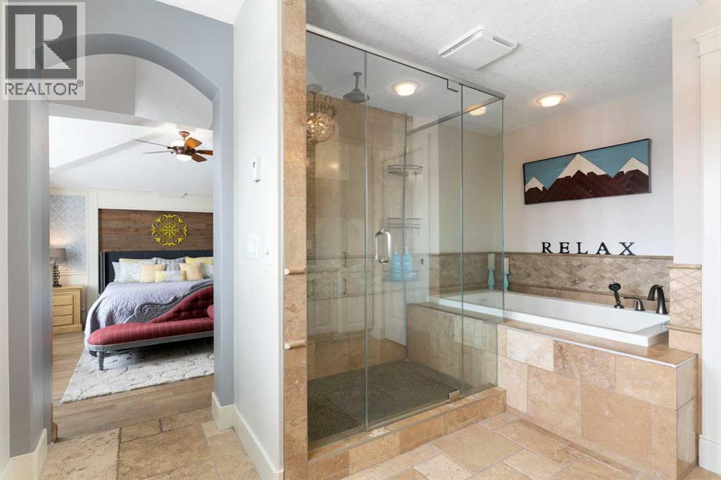 Hello, Gorgeous! Welcome to this beautifully renovated executive walkout home in the highly sought-after community of Coopers Crossing in Airdrie. Offering over 2,500sq ft. above grade plus a fully developed walkout basement, this home blends impressive architectural spaces with thoughtful custom finishes throughout. Step inside to a stunning entry featuring stacked stone accents, rustic beams, and an inviting sense of craftsmanship that continues throughout the home. The main floor includes a private office with glass French doors, perfect for working from home or flexible use as a dining space or additional bedroom. At the heart of the home is the dramatic great room with soaring 14-foot vaulted ceilings, arched windows, and a beautiful fireplace feature wall that fills the space with natural light from the west-facing backyard.The chef-inspired kitchen is designed for both everyday living and entertaining, featuring a large island, quartz countertops, professionally painted two-tone cabinetry, custom organizers, and a striking solid walnut hood fan. Premium appliances include KitchenAid, Bosch, Thermador, and MasterChef, along with a gas range, wall oven, beverage cooler, and walk-in pantry. Upstairs, a welcoming loft creates an additional living space for relaxing or family time. Two spacious bedrooms share a well-appointed bathroom, while the impressive primary retreat offers vaulted ceilings, custom wall detailing, and a luxurious ensuite with heated floors, double vanity, soaker tub & separate water closet. The fully developed walkout basement adds incredible flexibility with a gorgeous second full kitchen, large recreation area, full bathroom, wine/cool room, and a spacious additional bedroom or versatile flex room with built-in Murphy bed. With its high-end finishes and thoughtful layout, this level is ideal for entertaining or multi-generational living. Outdoor living is just as impressive with a west-facing backyard, a 300sq ft. Duradek balcony with glas s railing, natural gas line for BBQ, and a walkout patio below with additional gas connections and hot tub rough-in, plus two storage sheds. The beautifully landscaped yard features custom concrete work, mature trees and shrubs, and a 7-zone irrigation system. Completing the home is a triple attached garage plus shop area, with epoxy floors, forced-air heating, workshop wiring, EV/welder outlets, and extensive built-in storage. Located in one of Airdrie’s most desirable communities, close to parks, pathways, schools, and amenities, this exceptional home offers the perfect combination of space, luxury, and functionality. (id:53676)