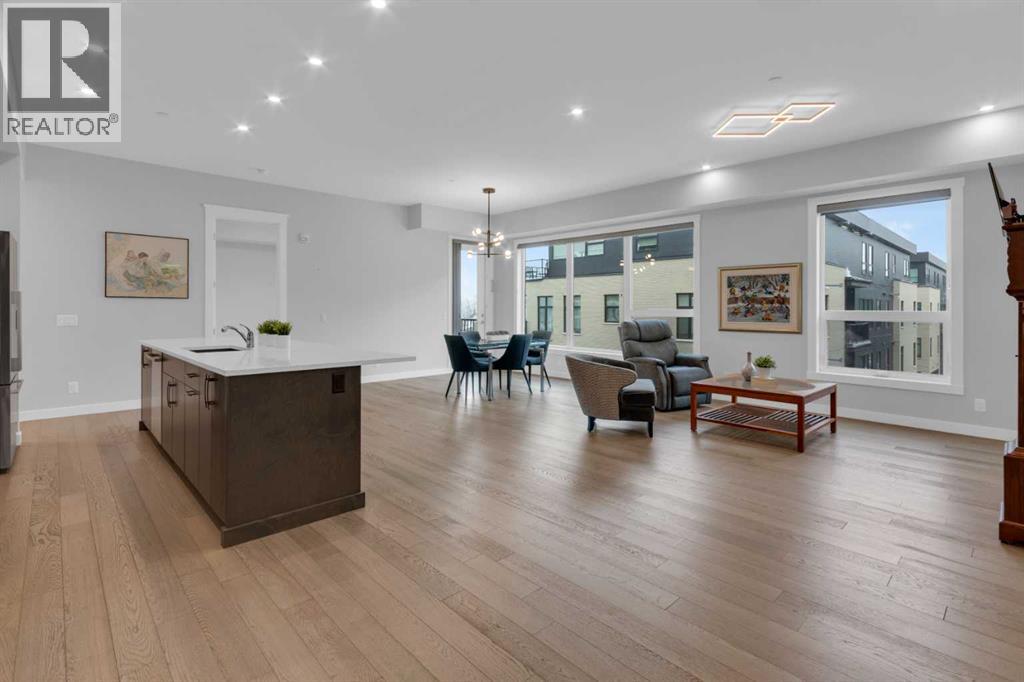 Welcome to Capella in University District, a small condo building with only 8 Estate Style single level luxury homes. This spacious and well laid-out 2 bedroom, 2 bathroom condo with single garage is just steps away from all of the amenities this highly desirable community offers. Located on the third floor is this modern residence with hardwood flooring, 10 foot ceilings, many large windows, central air conditioning, designer bathrooms and well-equipped spacious kitchen. The open concept main living space is flooded with natural light and features a sleek kitchen with expansive island, quartz countertops and full height cabinetry. The kitchen opens directly on to the dining space, the living room with electric fireplace, and a nook that works well for a den/office or as space for additional furniture. The bright primary suite offers enough space for a king size bed, a walk-in closet, and a 5-piece ensuite with heated floors, free standing tub, dual vanity, and fully tiled walk-in shower. The second bedroom has a murphy bed, a full bathroom across the hall, and is located on the other side of the condo from the primary bedroom, providing privacy between the bedrooms. Enjoy the morning sunrise on the spacious east-facing covered balcony that is equipped with a gas line for your BBQ or heater and a water line. The private, heated singe garage is attached to the building has epoxy floors, storage space, and a water softener for the condo unit. This well cared for building is part of a 7 building complex that offers a fitness centre, visitor parking, and courtyard spaces. Conveniently situated within walking distance to a grocery store, restaurants and coffee shops. Steps away from Market Mall, the U of C and the Children's Hospital and a quick commute to downtown and access out to the mountains. (id:53676)