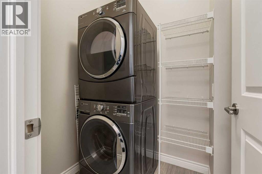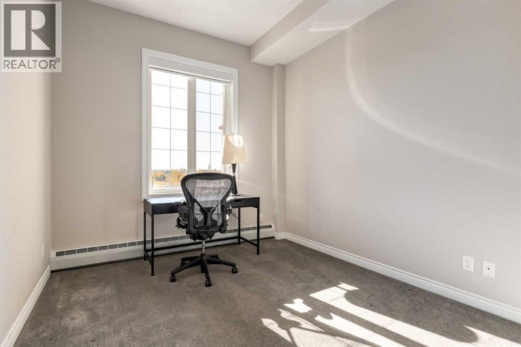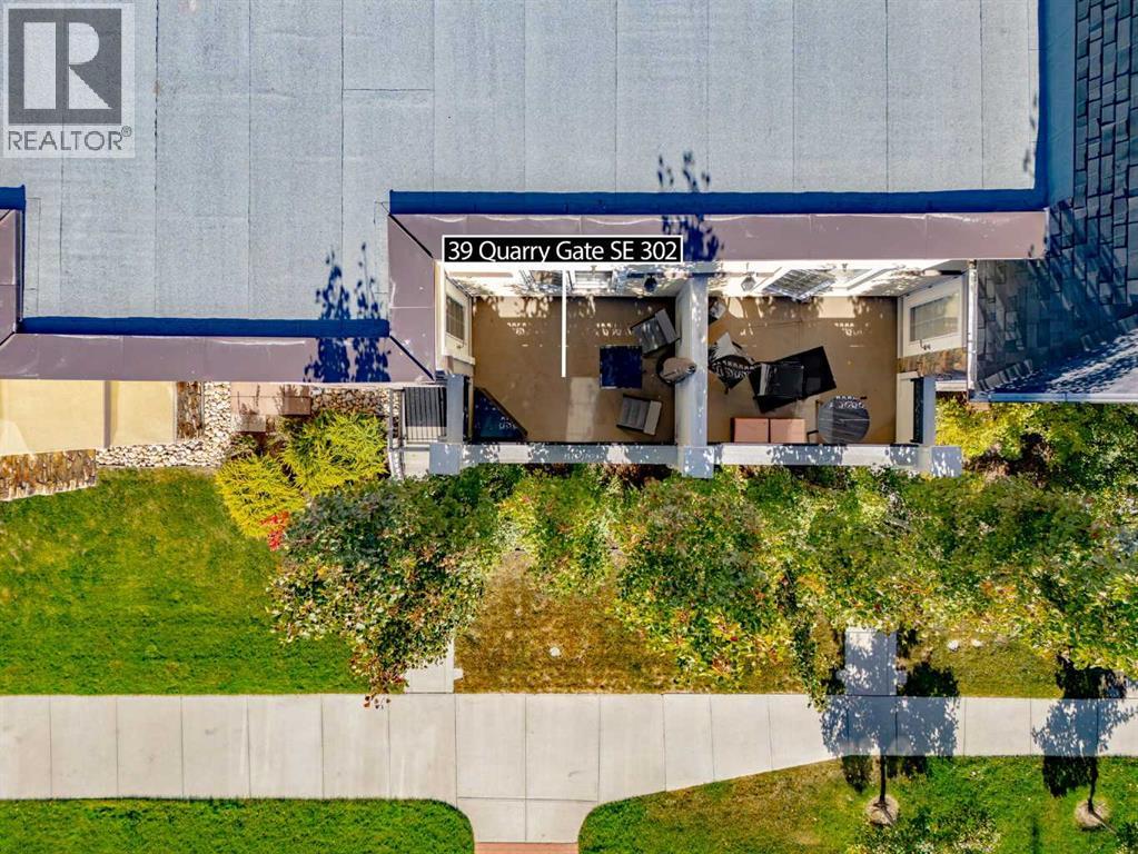 Welcome to 39 Quarry Gate SE! This stunning top-floor, former show suite is filled with natural light and showcases 10-ft ceilings throughout with a bright, open layout. The kitchen features classic shaker-style cabinetry with soft-close doors and drawers, a spacious pantry cupboard, polished Caesarstone countertops with a breakfast bar, stainless steel appliances, an upgraded garburator, and a Kohler polished nickel faucet. The dining area is highlighted by a beautiful Hudson Valley light fixture and flows into the spacious living room with oversized, wall-to-wall windows. Step out onto the private, south-facing patio complete with a gas BBQ line and lovely views of the central fountain and surrounding greenspace that leads directly to the river park and pathways. The primary bedroom includes a walk-through closet and a stylish ensuite with a double vanity and an oversized glass-enclosed shower. The second bedroom is ideal for guests and features its own walk-in closet, with a second full bathroom conveniently located across the hall. Additional highlights include a laundry room with built-in shelving and a niche area off the kitchen that’s perfect for a desk or workstation. This unit also comes with a titled underground parking stall and the largest titled storage room in the entire complex. The building also features a bike storage room for added convenience. Ideally located across from the river and pathways — and just steps from the amenities of Quarry Park and the YMCA — this home is perfect for the active buyer looking to enjoy a maintenance-free lifestyle in a great complex. (id:53676)