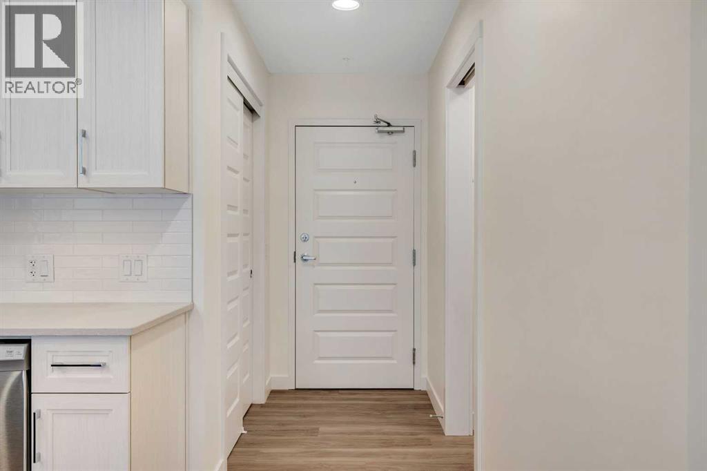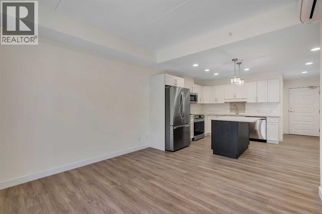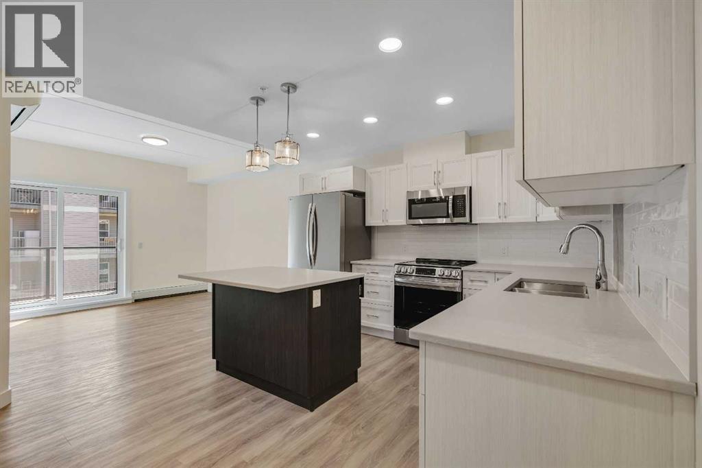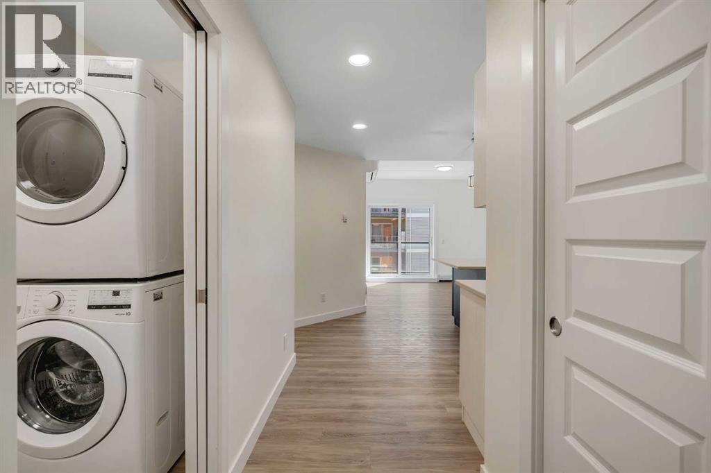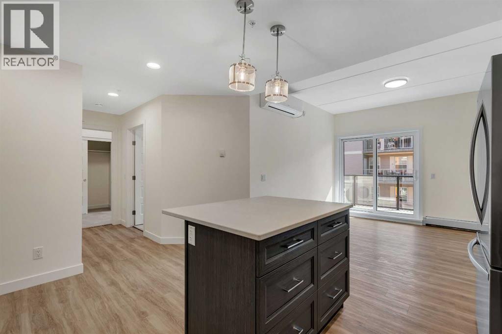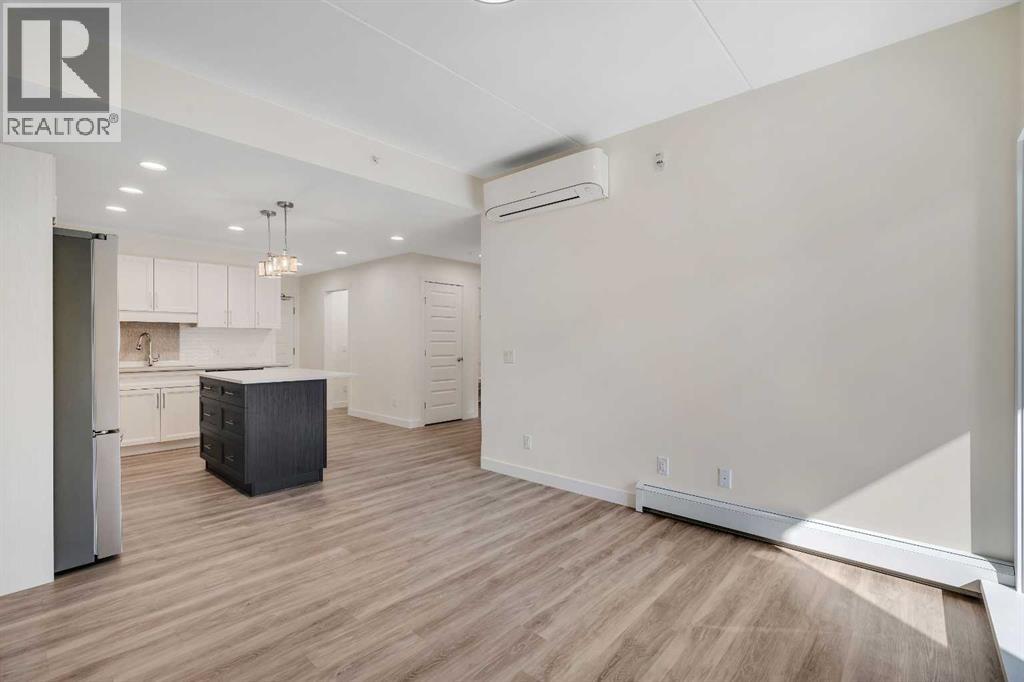 Welcome to 302, 404 1 Avenue SE – a stunning brand new, never-lived-in, south-facing condo that combines modern finishes, comfort, and convenience in one of the area’s most desirable buildings. Step inside this bright 2-bedroom, 2-bathroom home and be greeted by luxury vinyl plank flooring, quartz countertops, 9 ft flat-finish ceilings, and recessed kitchen lighting. The open-concept design makes the living space perfect for entertaining or relaxing, while the thoughtfully designed layout ensures both bedrooms are generously sized. From your 6' x 22' covered deck, you’ll enjoy breathtaking mountain views and plenty of room to unwind outdoors. The deck is equipped with a natural gas BBQ line and includes two enclosed storage rooms, giving you convenient extra space right outside your door. This home also comes with in-suite laundry featuring a stacked washer and dryer, as well as air conditioning for year-round comfort. Thanks to the building’s cement-core floor construction, you’ll appreciate how quiet and private each suite feels. The community is also proudly pet-friendly, allowing up to two small or medium dogs, and even includes a heated parkade dog wash to keep your pets clean and happy. Your parking is secure with a large indoor parking stall, and there’s no shortage of guest and street parking for visitors. The building itself provides a range of thoughtful amenities, including a fitness centre, social room, and a workshop space ideal for carpentry or other hobbies. With heat and water/sewer included in the low condo fees, this home offers exceptional value. Whether you’re downsizing, investing, or purchasing your first home, this unit delivers unbeatable appeal with its brand-new condition, mountain views, and full suite of amenities. (id:53676)
