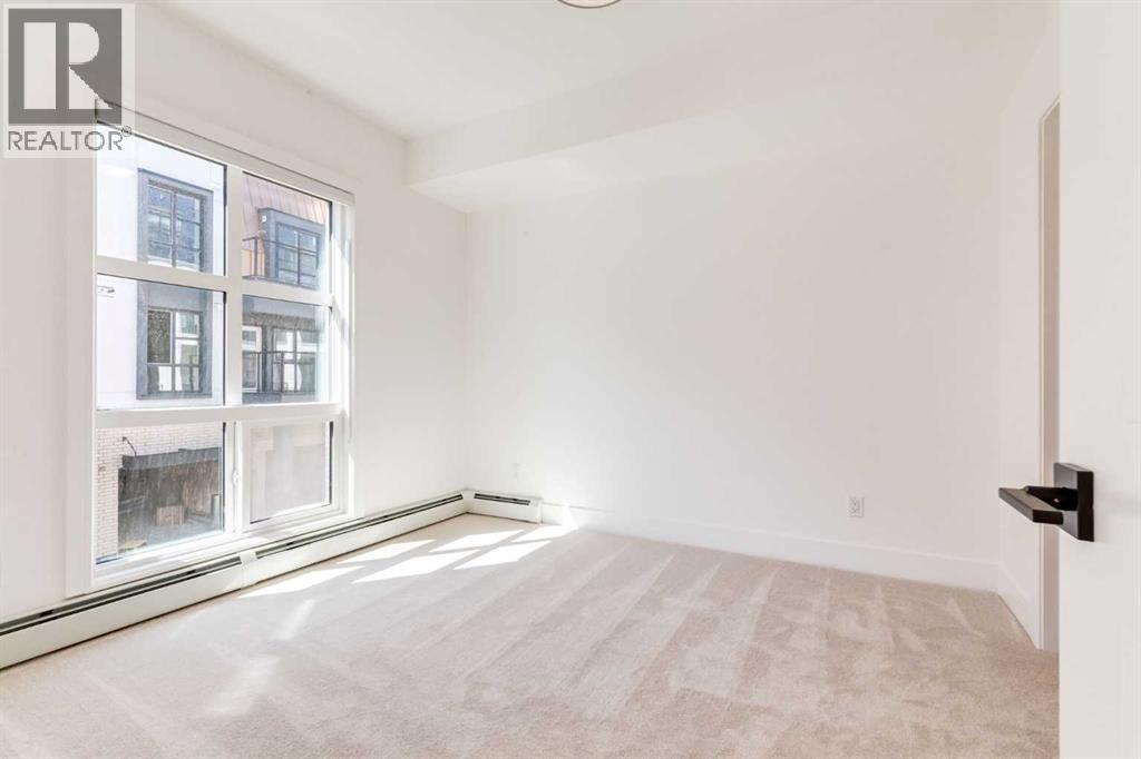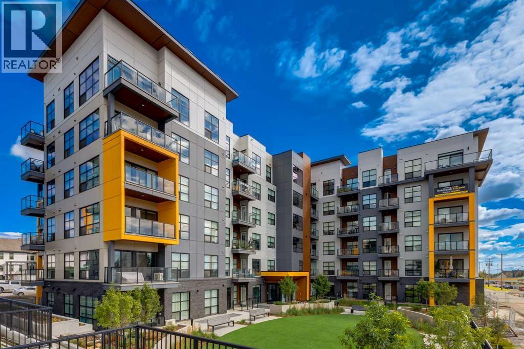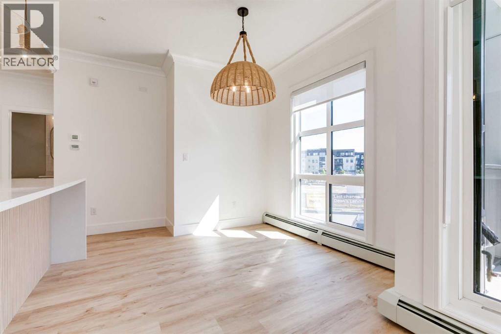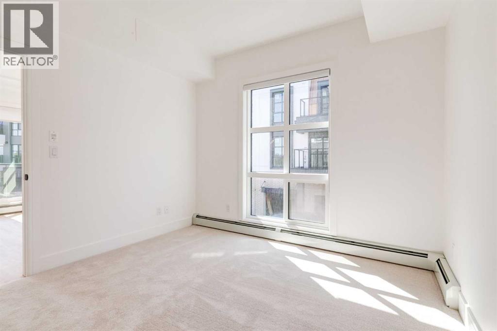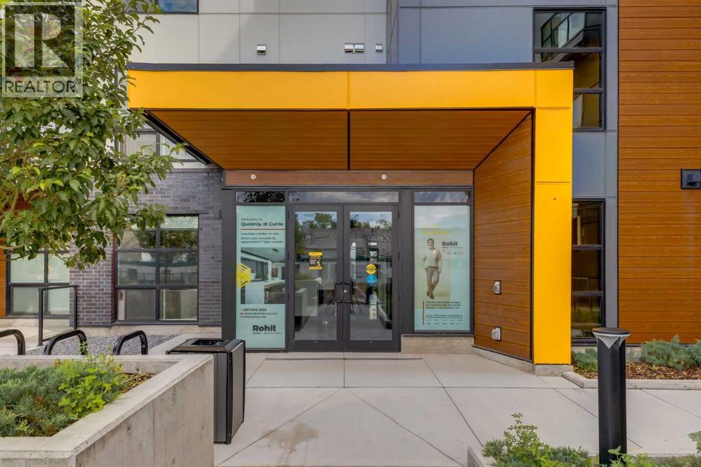 Discover the "Argento" floorplan by award-winning Rohit Homes—a beautifully designed 2-bedroom, 2-bathroom corner unit that offers the perfect balance of style and functionality. Located on the second floor in the sought-after Quesnay at Currie Barracks, this bright and airy home is flooded with natural sunlight, making it an ideal sanctuary for downsizers or anyone seeking a serene, low-maintenance lifestyle. Featuring the tranquil Ethereal Zen color palette, the interior exudes calm and sophistication. Designed by the award-winning interior designer, the unit includes premium finishes such as 9' ceilings, quartz countertops with a waterfall edge, a quartz backsplash, full-height cabinetry, a stainless appliance package, bespoke light fixtures, and window coverings. The open-concept layout seamlessly integrates the kitchen, dining, and living areas, perfect for both relaxing and entertaining. The spacious primary bedroom includes a private ensuite, while the second bedroom and additional full bath offer comfort and flexibility for guests or a home office. Step outside to enjoy a large SE facing balcony, extending your living space into the outdoors. This pet-friendly and AIRBNB-friendly building offers titled heated underground parking and plenty of visitor spaces. Ideally located minutes from downtown, Mount Royal University, and the vibrant amenities of 17th Ave and Marda Loop, the Argento floorplan is a rare gem. Limited units are available—secure your slice of modern living today! **Photos are taken from existing building of the same models. Not of the exact unit ** (id:53676)