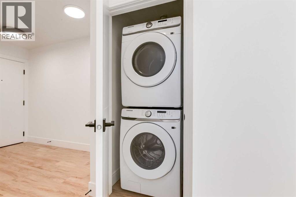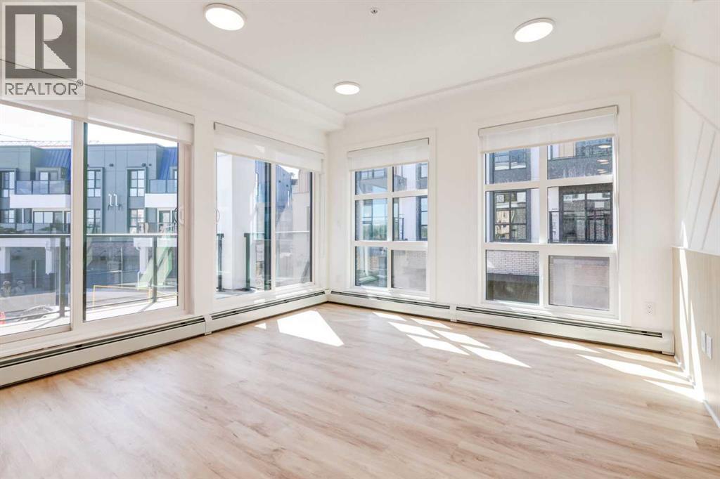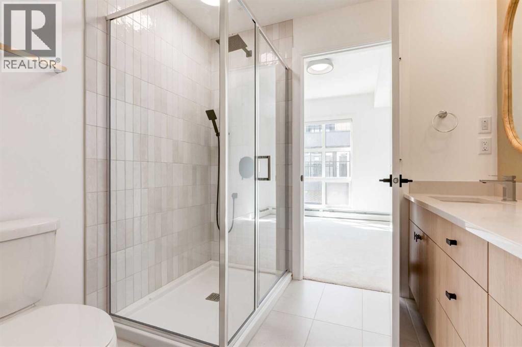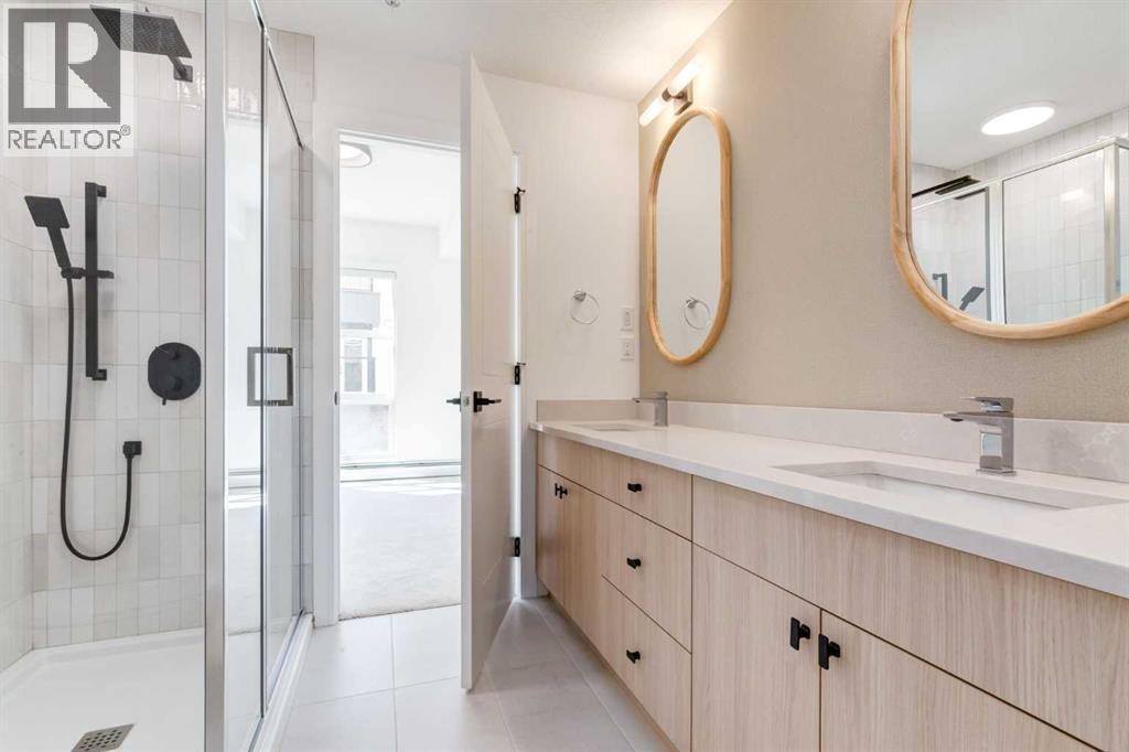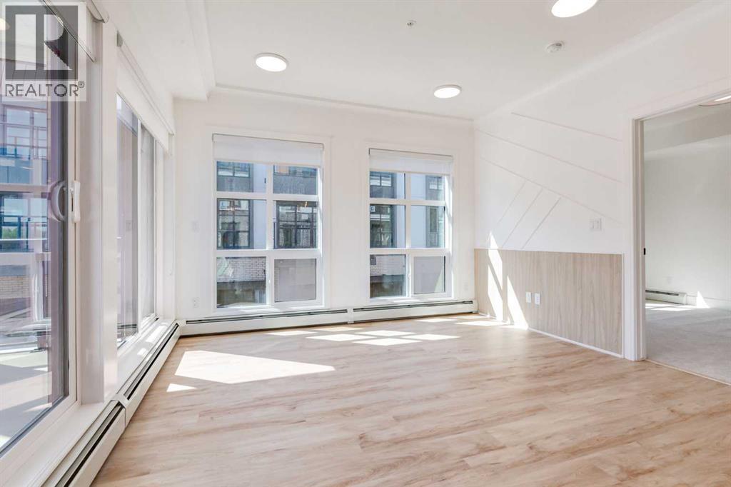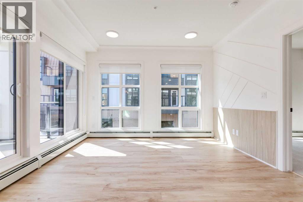 Discover the "Argento" floorplan by award-winning Rohit Homes—a beautifully designed 2-bedroom, 2-bathroom corner unit that offers the perfect balance of style and functionality. Located on the second floor in the sought-after Quesnay at Currie Barracks, this bright and airy home is flooded with natural sunlight, making it an ideal sanctuary for downsizers or anyone seeking a serene, low-maintenance lifestyle. Featuring the tranquil Ethereal Zen color palette, the interior exudes calm and sophistication. Designed by the award-winning interior designer, the unit includes premium finishes such as 9' ceilings, quartz countertops with a waterfall edge, a quartz backsplash, full-height cabinetry, a stainless appliance package, bespoke light fixtures, and window coverings. The open-concept layout seamlessly integrates the kitchen, dining, and living areas, perfect for both relaxing and entertaining. The spacious primary bedroom includes a private ensuite, while the second bedroom and additional full bath offer comfort and flexibility for guests or a home office. Step outside to enjoy a large SE facing balcony, extending your living space into the outdoors. This pet-friendly and AIRBNB-friendly building offers titled heated underground parking and plenty of visitor spaces. Ideally located minutes from downtown, Mount Royal University, and the vibrant amenities of 17th Ave and Marda Loop, the Argento floorplan is a rare gem. Limited units are available—secure your slice of modern living today! **Photos are taken from existing building of the same models. Not of the exact unit ** (id:53676)