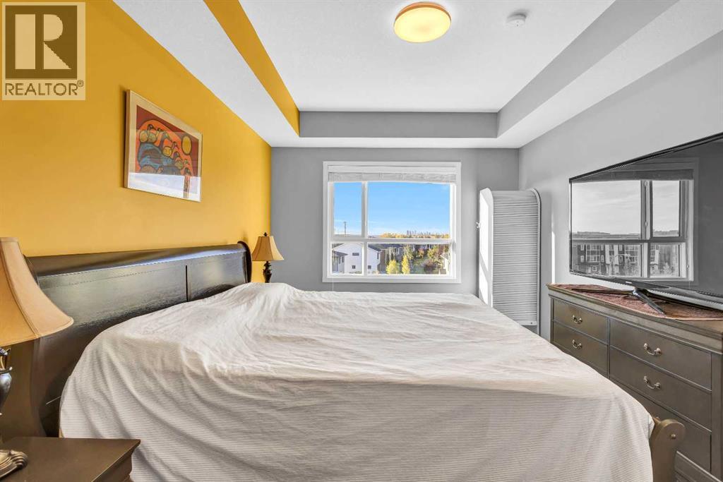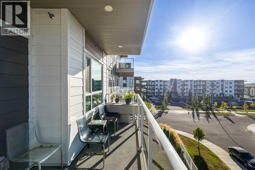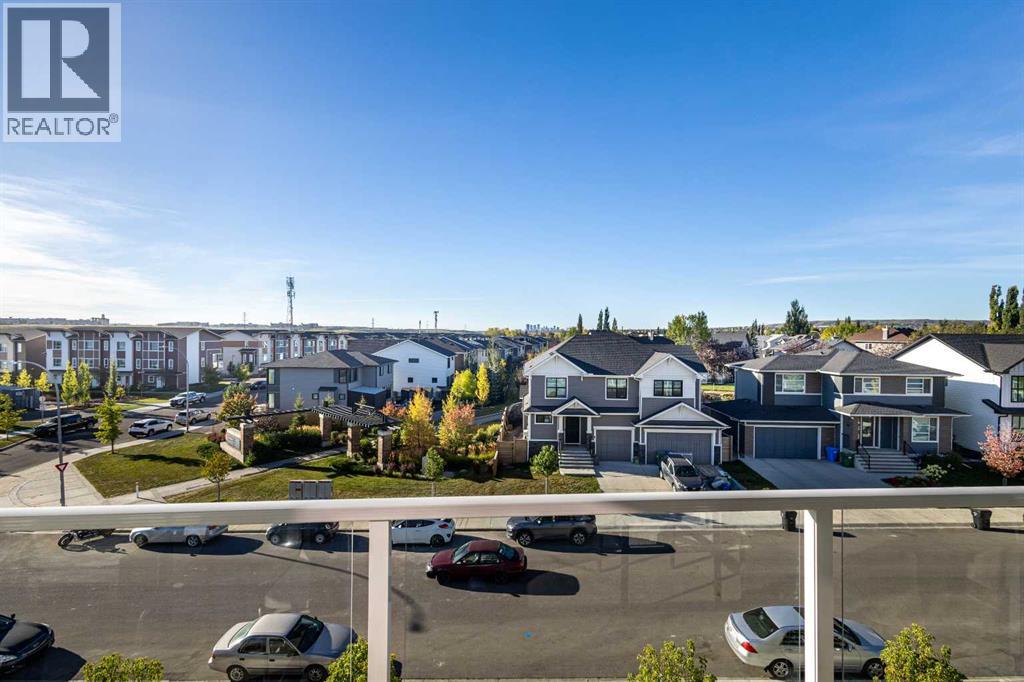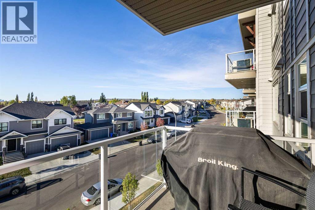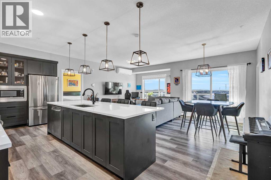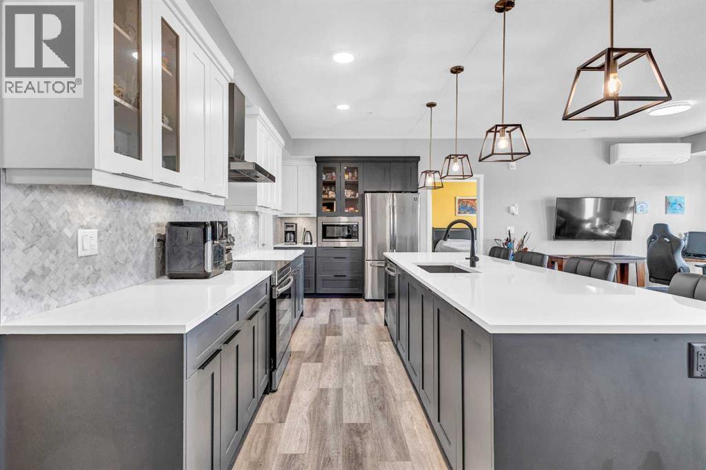 Welcome to this immaculate, like-new condo in The Rise, an award-winning building by Cedarglen Living.Offering THREE bedrooms, TWO bathrooms, and 1,165 sq. ft., this thoughtfully designed home combines modern finishes, functional living, and a low-maintenance lifestyle.The open-concept gourmet kitchen is a true highlight, featuring soft-close doors and drawers cabinets with sleek quartz countertops, a spacious pantry, and an oversized quartz island that’s perfect for entertaining. Modern stainless steel appliances—including a full-size fridge, stove, dishwasher, and built-in microwave—complete this well-appointed space. From the kitchen, the layout flows seamlessly into the bright and inviting living room, where nine-foot ceilings and expansive SOUTH-facing windows fill the space with natural light. The living area extends to a covered balcony with a BBQ gas line and scenic views, providing the perfect setting for morning coffee or evening relaxation.The primary suite is designed as a private retreat, complete with a generous walk-in closet and a spa-inspired four-piece ensuite. The secondary bedroom and versatile den offer flexibility for guests, a home office and are complemented by another full four-piece bathroom. A spacious laundry room with a handmade shelf and countertop adds both convenience and extra storage.This home is filled with upgrades, including luxury vinyl plank and tile flooring throughout, extended height cabinetry in the bathrooms and kitchen island, quartz countertops in both the kitchen and bathrooms, central air conditioning, and wall-mounted medicine cabinets in both bathrooms. A separate storage room and a TITLE underground parking stall with secure bike storage further enhance the convenience of this property.The Rise is surrounded by lifestyle amenities, including scenic walking paths, a pedestrian bridge, and a stormwater pond that create a peaceful setting for daily walks. The Harvest Hills community also offers HOA-managed amenities su ch as tennis courts and recreational spaces, while schools, playgrounds, parks, and the public library are just minutes away. Nearby shopping and dining options include Country Hills Towne Centre and Harvest Hills Crossing, with grocery stores, restaurants, a movie theatre, VIVO Recreation Centre, and T&T Supermarket all within easy reach. Quick access to Stoney Trail, Country Hills Boulevard, and Deerfoot Trail, along with just a 10-minute drive to Calgary International Airport, make this location as convenient as it is desirable. Meticulously maintained by the original owner, this home shows like new and offers a functional layout designed for both comfort and efficiency. With its blend of luxury finishes, vibrant community lifestyle, and prime location, this condo presents a rare opportunity in one of Calgary’s most sought-after neighbourhoods.Schedule your private showing today to experience the comfort, style, and convenience it has to offer. (id:53676)