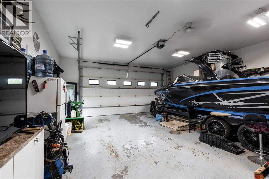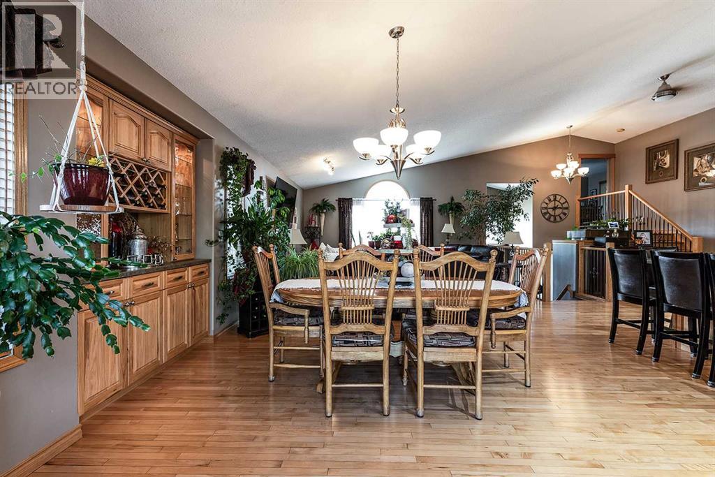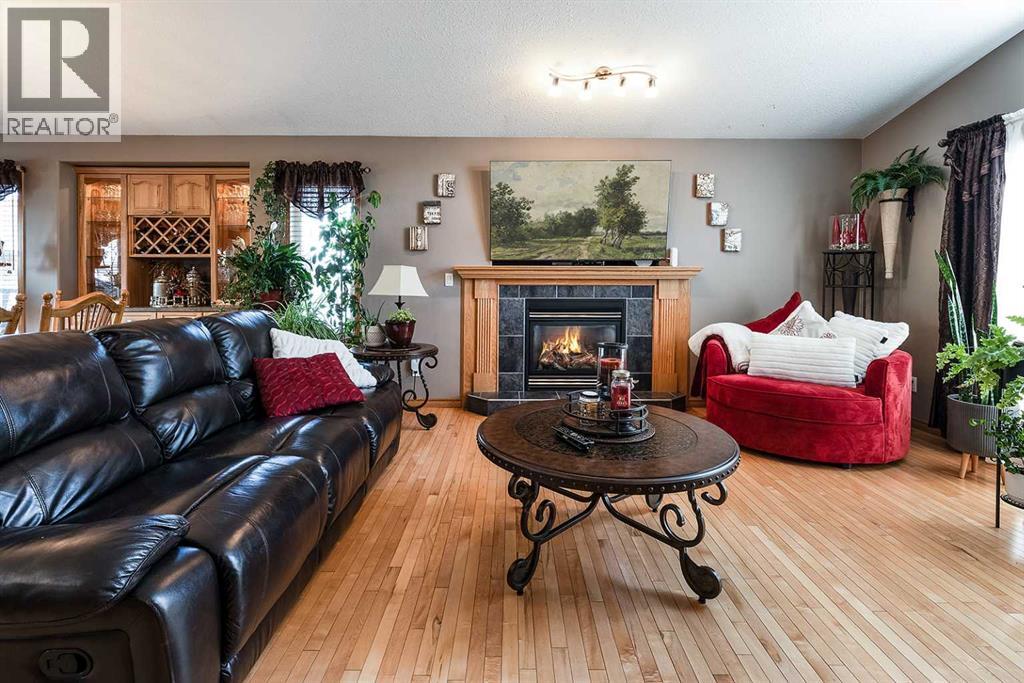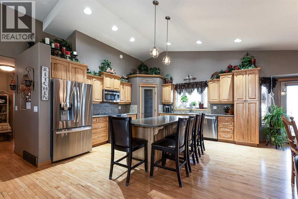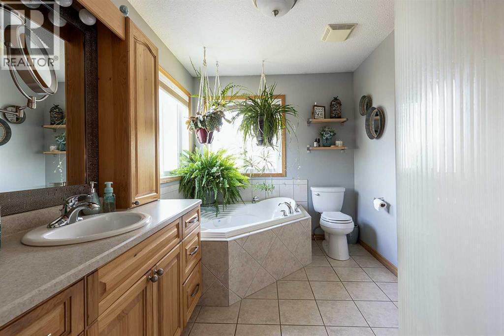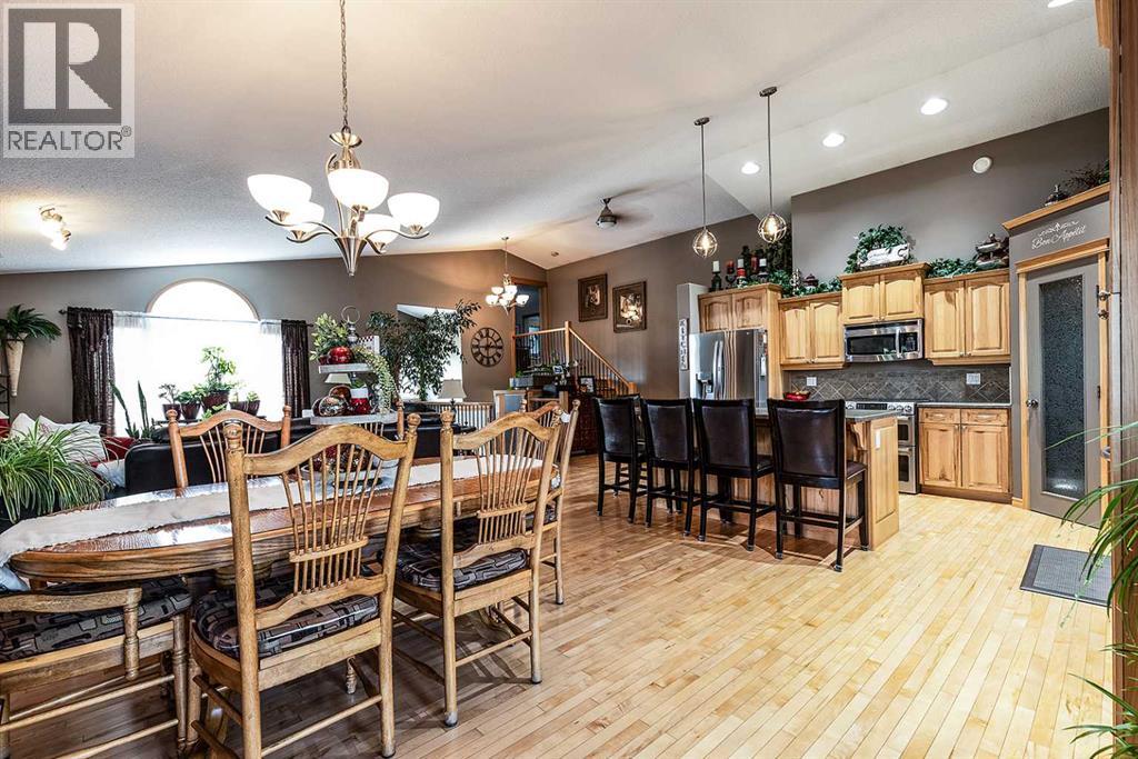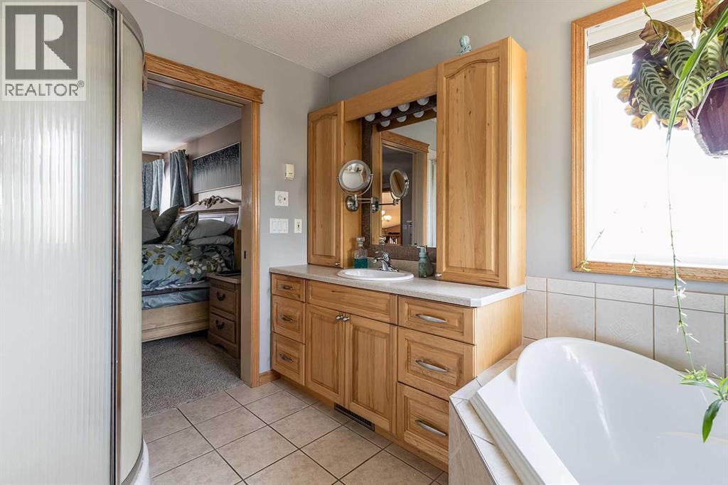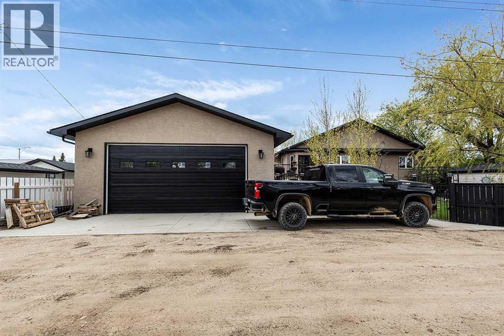 Discover luxury living in this exquisite 1940 sq ft modified bi-level residence, beautifully positioned on a generous double lot in Oyen, Alberta. Built in 2004 and meticulously maintained by its original owner, this home showcases a stunning stucco exterior complemented by new shingles, windows, and a garage door installed in 2023.Step inside to experience an inviting layout with three bedrooms on the upper level and two additional bedrooms downstairs. The highlight is the master suite above the garage, featuring a spacious walk-in closet and a 4-piece ensuite with a jetted tub and separate shower. The home's elegant interior is enhanced by radiant heated tile flooring with individual climate controls, rich hardwood, and plush carpeting in the bedrooms and lower level.Vaulted ceilings and a warm gas fireplace enrich the main living room, creating a welcoming atmosphere for relaxation and entertainment. The gourmet kitchen awaits with sleek maple cabinets, modern stainless steel appliances, and plumbing in place for a future gas stove, adding to its allure. A ready-to-install gas line for a BBQ just outside is perfect for culinary adventures.Practical amenities include an on-demand hot water system, a new central vacuum, and pre-wiring for a hot tub in the beautifully landscaped outdoor space. The fully fenced yard benefits from an underground sprinkler system, ensuring lush surroundings and easy maintenance.Completing this magnificent property are the garages: a double attached garage and a separate 28x32 detached garage, each fully insulated and heated. The attached garage features radiant floor heating, ideal for Alberta's cooler months. With ample space for vehicles, a workshop, or storage, and additional RV parking with electrical hookup, this home meets all your needs with unmatched style and functionality. (id:53676)