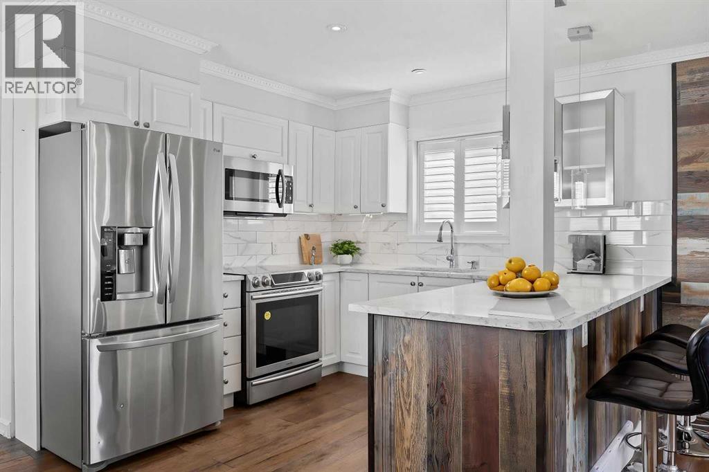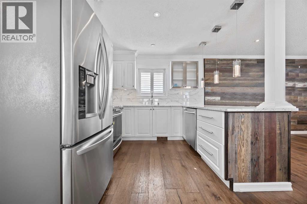 **OPEN HOUSE SATURDAY OCT 4 @ 12-3PM**Welcome to 31 Martinridge Place – a fully finished 4-level split offering 4 bedrooms, 2 full bathrooms, and a separate side entrance. This well-maintained property features numerous upgrades and is move-in ready. The main floor has been renovated and showcases a bright white kitchen with stainless steel appliances, quartz countertops, and a peninsula island with seating. Engineered hardwood flooring runs throughout the main level, complemented by elegant shutter-style window coverings. The upper level offers two spacious bedrooms and a 3-piece bathroom with walk in shower. The third level includes a large family room, stacked laundry, a basement kitchenette, a second full bathroom, and access to the side entry. The fourth level features two additional bedrooms - ideal for extended family or illegal suite potential. Additional updates include new windows (2017), siding and shingles (2020), and central air conditioning (2017). A double detached garage and extra parking pad provide ample off-street parking. Conveniently located close to schools, parks, shopping, and transit. (id:53676)