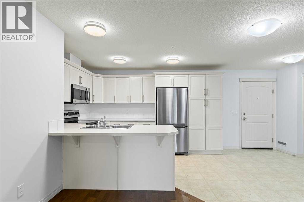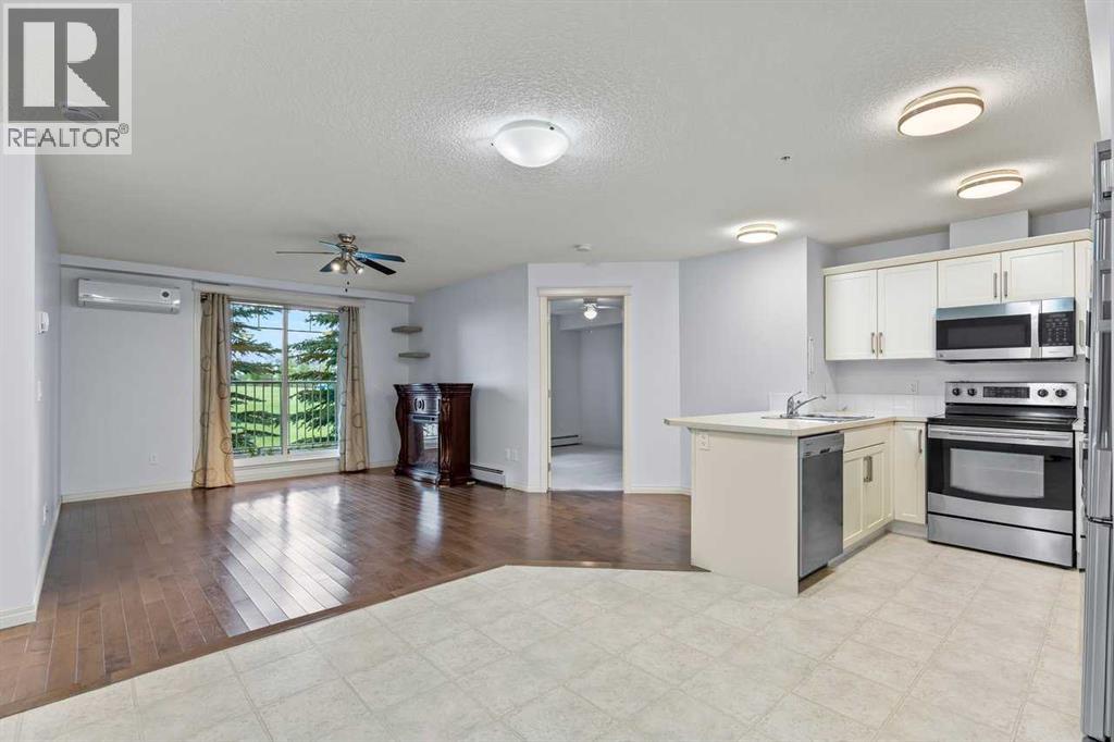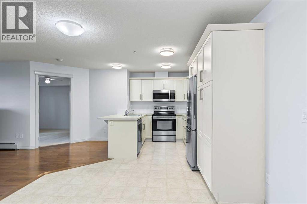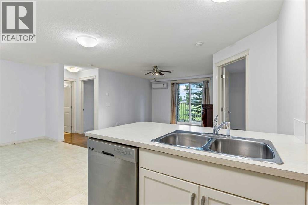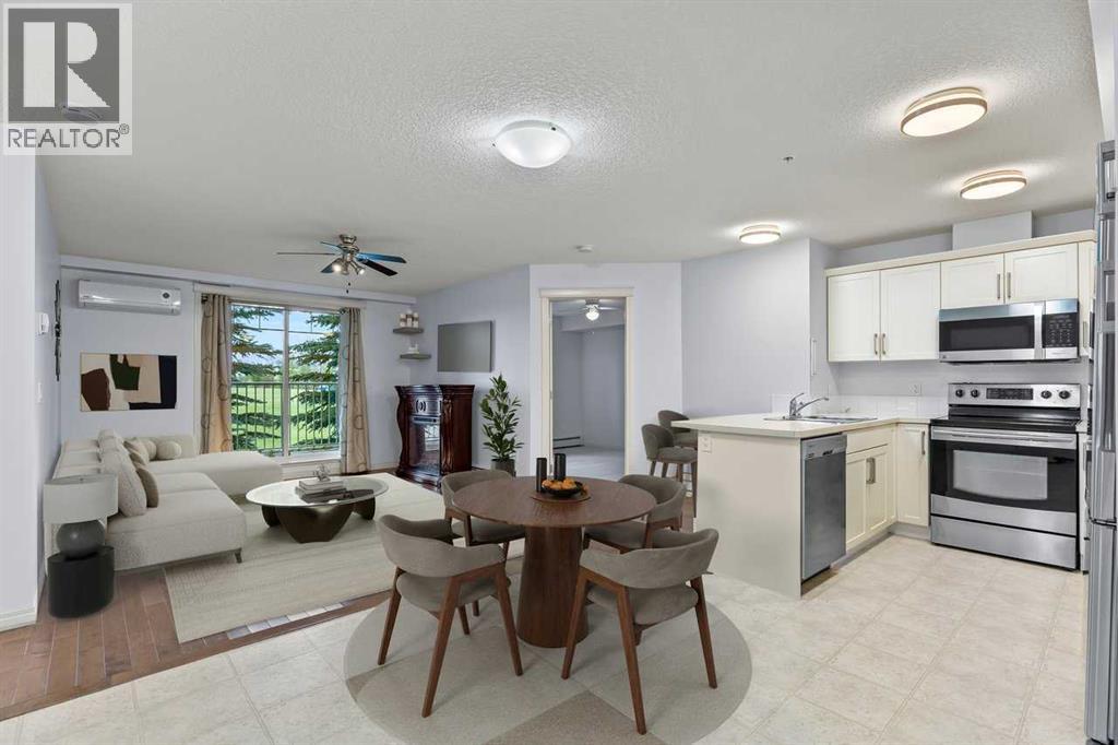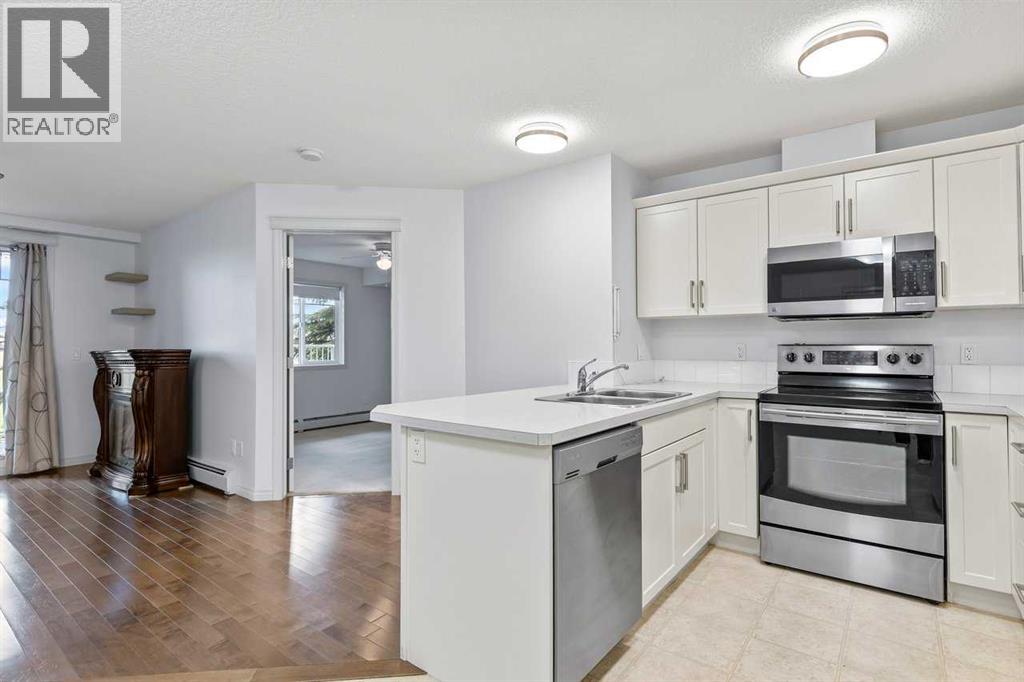 Welcome to this well maintained main-floor condo in the heart of McKenzie Towne! This spacious 2-bedroom, 2-bathroom unit offers the perfect combination of style, comfort, and convenience. Step inside to an open and airy layout with a wide entryway leading into a modern white kitchen, complete with stainless steel appliances, upgraded pantry, and a breakfast bar—ideal for both cooking and entertaining. Just off the kitchen, you'll find a large dining area and a dedicated work-from-home space for added versatility. The bright and inviting living room features well-maintained hardwood floors and opens onto a sunny west-facing deck that spans the width of the unit, offering beautiful views of green space and a gas BBQ hookup—perfect for summer evenings. The air-conditioned unit offers excellent privacy with bedrooms on opposite sides of the living space. The primary suite features a walk-in closet and a 3-piece ensuite, while the second bedroom is steps from a full 4-piece bathroom. A separate laundry room with washer and dryer adds to the practicality of the home. Additional features include titled underground parking, assigned storage locker, pet-friendly building (with board approval). Located just minutes from the shops and restaurants of 130th Avenue, schools, parks, and transit—this home truly has it all. Quick possession available. Don’t miss your chance to make this exceptional home yours! (id:53676)