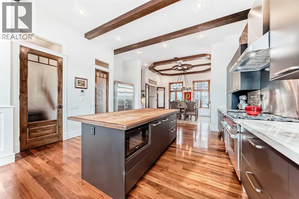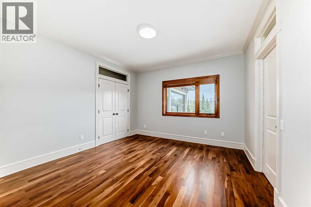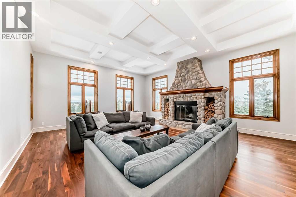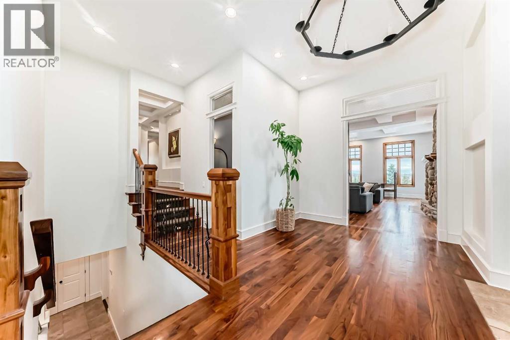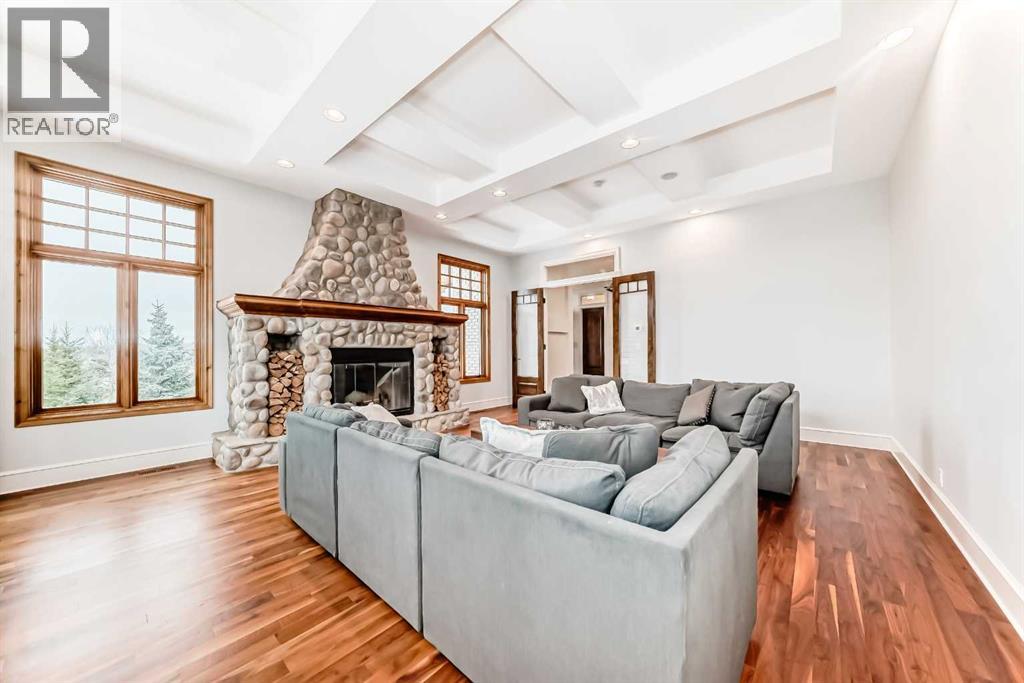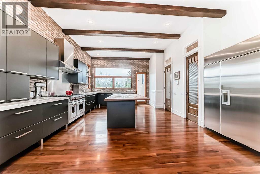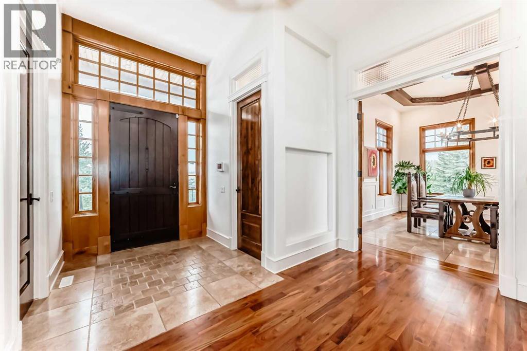 Expansive acreage living just minutes from Calgary. Set on 3.24 acres and well removed from highway noise, this property offers privacy, open views, and a functional layout designed for both daily living and entertaining.The home features just under 4,000 sq. ft above grade plus 1,500 sq. ft of developed walkout basement space. A large wraparound driveway provides easy access to the oversized attached in-floor heated garage and an attached heated oversized shop with its own separate entrance.Inside, the main level is anchored by a spacious kitchen with a central island, premium gas-burning Wolf range, and a full-size Sub-Zero refrigerator. Living areas are enhanced by a natural stone wood-burning fireplace with gas assist (gas lighter). In-floor heating runs throughout the entire home, providing consistent comfort, while dual-zone furnace and air conditioning systems allow for efficient climate control.Built with efficiency in mind, the home features triple-pane windows and R35 insulated walls, contributing to strong overall energy performance and low energy bills. The upper level includes a well-appointed primary suite with a see-through natural stone wrapped fireplace showing through to the 6-piece ensuite, which features a spacious walk-in closet, a double-width jetted tub, and a full body shower/two-person steam room. Three additional bedrooms, a 5-piece bathroom, and a full laundry room with a sink and Bosch appliances complete the main-upper level.The second level features a dedicated theatre room with fully reclining leather seating, its own separate bathroom, and private balcony, creating a true at-home cinema and entertainment space.The fully developed walkout basement includes a wet bar, wine cellar with a built-in counter and sink, two additional bedrooms, a 3-piece bathroom, and a large recreation/games room offering excellent space for guests or extended family.With generous landscaped yard space with mature trees, unobstructed views, and pro ximity to Calgary, this property combines rural scale and privacy with city convenience. (id:53676)
