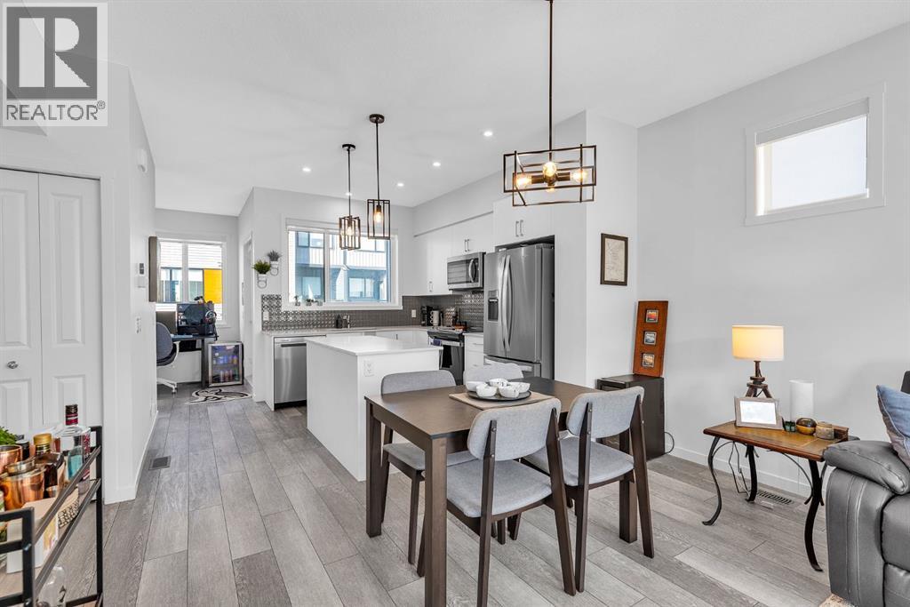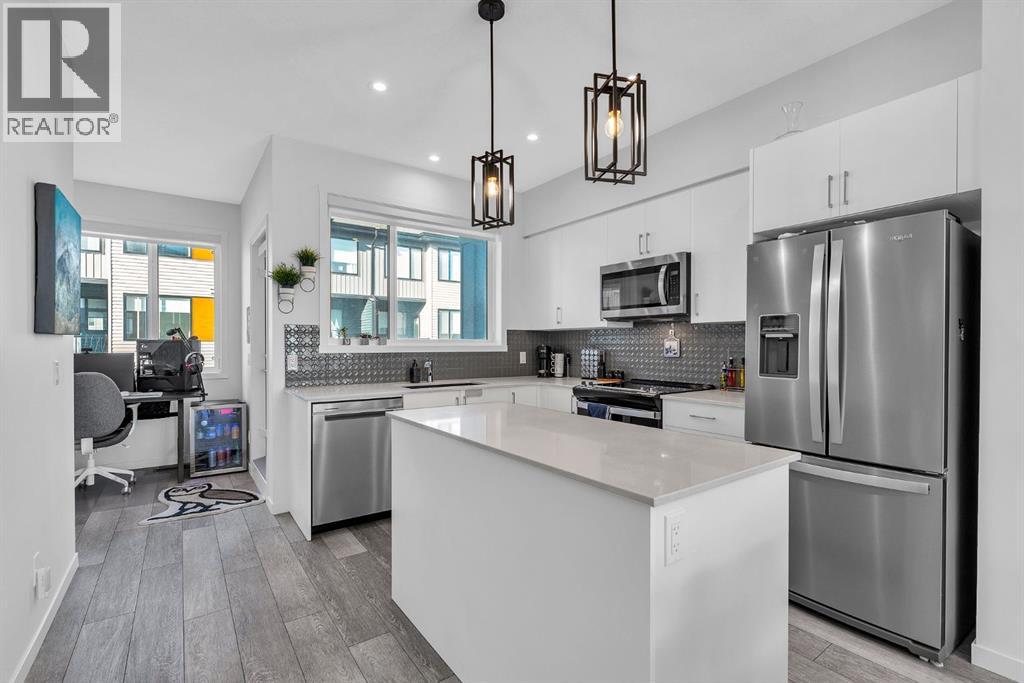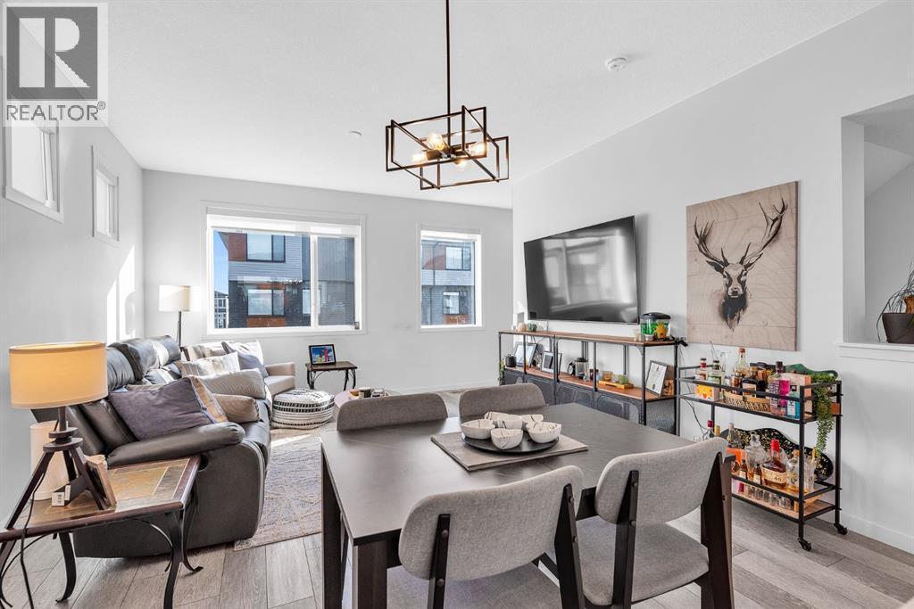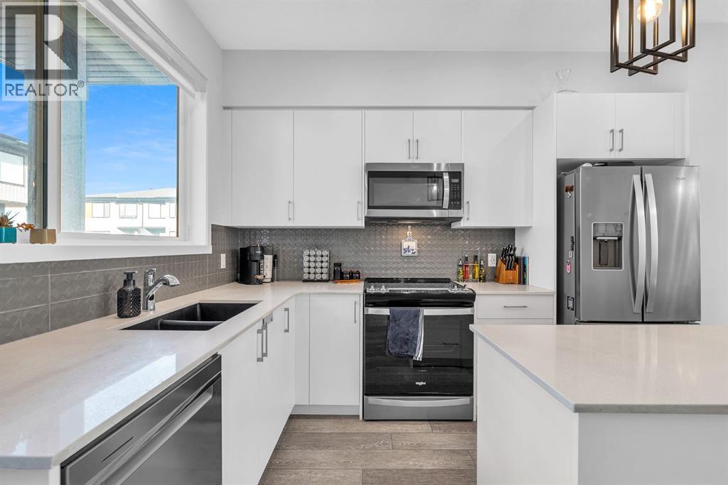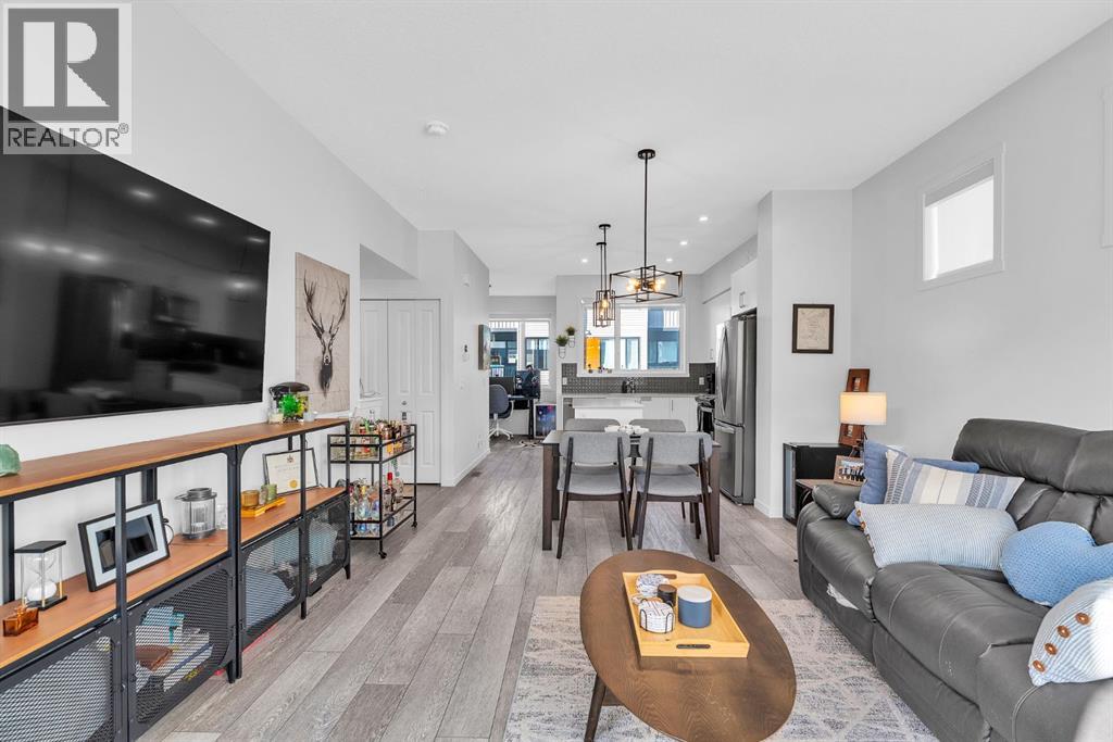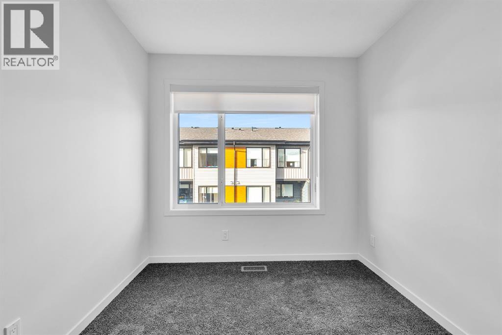 Welcome to this stunning south-facing end-unit townhouse located in the vibrant community of Cornerstone in NE Calgary. With 4 bedrooms, 2.5 bathrooms, and central A/C, this spacious and stylish home is designed for comfort, flexibility, and modern living. On the lower floor, you’ll find a versatile bedroom/flex space—perfect for guests, remote work, or a home gym. The double attached garage offers everyday convenience and additional storage. Head upstairs to the bright, open-concept main floor with 9ft ceilings, featuring a sleek kitchen with quartz countertops, stainless steel appliances, and a pantry. The kitchen flows seamlessly into the dining area and living room, creating an ideal space for both daily life and entertaining. A rear flex room provides even more options for work or relaxation, complete with a half bath and access to a private covered balcony. The upper level boasts a spacious primary bedroom with walk-in closet and a 3-piece ensuite. Two additional generous bedrooms, a full 4-piece bathroom, and convenient upper-level laundry complete the top floor. Additional features include a beautifully landscaped courtyard, ample visitor parking, and close proximity to parks, shops, future schools, and public transit. Located just minutes from Stoney Trail and Calgary International Airport, commuting and travel are a breeze. Don’t miss your opportunity to own this beautifully designed, move-in-ready townhouse in one of Calgary’s most connected and growing communities. Schedule your private viewing today! (id:53676)