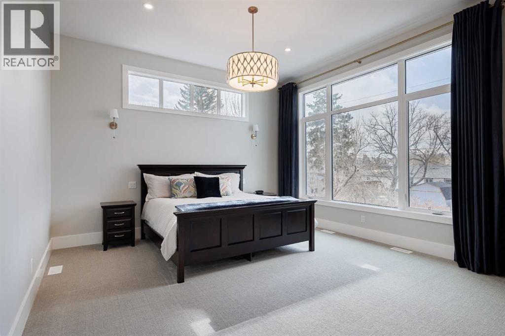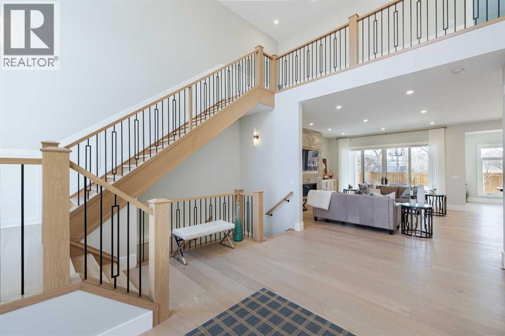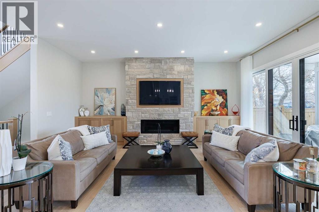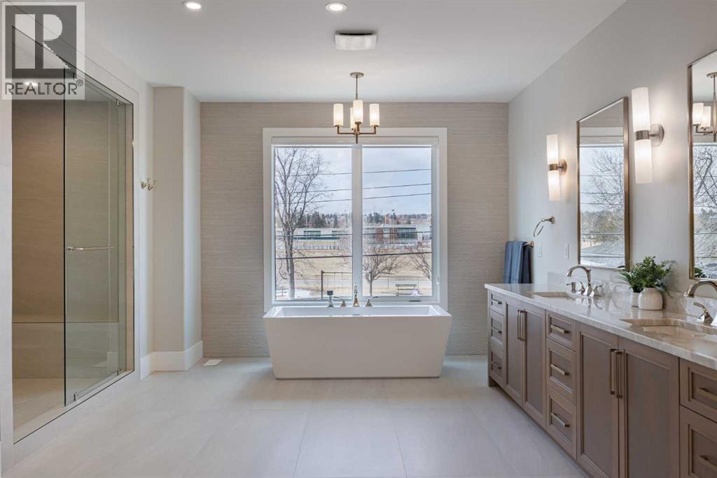Welcome to the finest of Wildwood! This Custom-Built Masterpiece was meticulously designed & is an exemplary testament to fine luxury homes. This two-storey 4 bedroom and 4.5-bathroom home is ideal for a large family seeking the ultimate dream home to live & entertain. There are no neighbours behind as this home backs onto a children’s park. As you enter this home, you will be welcomed by a grand open foyer with elevated ceilings, warm earth tone colours, and great Lux windows offering an abundance of natural light. The open concept main floor offers an impressive white oak staircase, white oak wide plank hardwood floors, front home office, large living & dining area, roomy mud room, and pantry. The custom-built floor to ceiling kitchen highlights beautiful premium granite countertops, an expansive 10’ long island, champagne bronze fixtures, and Miele appliances that include a built-in panelled fridge/freezer, natural gas range, range hood, built-in wall convection oven, and speed oven/microwave. The spacious living room has elegant wall-to-wall built-ins & a gas fireplace. The long stretch of windows & patio doors along the back wall floods the main floor with natural light. The living area is adjacent to a sheltered deck through the patio doors that lead out to a beautifully landscaped backyard with firepit area. Upstairs you will find a stunning Primary Bedroom with 12 ft soaring ceilings, oversized windows, oversized custom-built walk-in closet & a spa-inspired 6-piece ensuite. The luxurious ensuite offers 24 x 48 Italian tile finishes, in-floor heating, a freestanding soaking tub, an oversized stand-up shower with rain head & body sprays. The two additional bedrooms upstairs offer generous spaces with each having a custom-built walk-in closet and 3-piece ensuites. Completing the upper floor is an oversized laundry room offering a sink & ample storage. The carpeted fully finished basement offers additional living space with one additional bedroom, 9’ clear ceili ngs, a 3-pc bathroom with stand-up shower, a gym with durable gym flooring & mirrored walls, a wet bar with 36” fridge, hydronic in-floor heating & a large entertainment media room with an acoustic panel wall with built-ins and rough-in for sound surround. The outdoor areas have been thoughtfully landscaped with perennial plants, an irrigation system, and front & rear brush finished concrete patios. The backyard features a covered concrete deck & separate deck with natural gas BBQ hookup. The oversized, drywalled, insulated, & spray foamed double attached tandem garage offers hydronic in-floor heating, hot & cold-water taps, and tall ceilings. The mechanical room features a boiler system for in-floor heating and domestic hot water, 2 Carrier high-efficiency heat furnaces, & an HRV system. This home is close to Wildwood Community Association, Wildwood Elementary, Edworthy Park, Shaganappi Point Golf Course, minutes to DT Calgary, & steps from the Bow River Valley. Do not miss out & book your showing today! (id:53676)