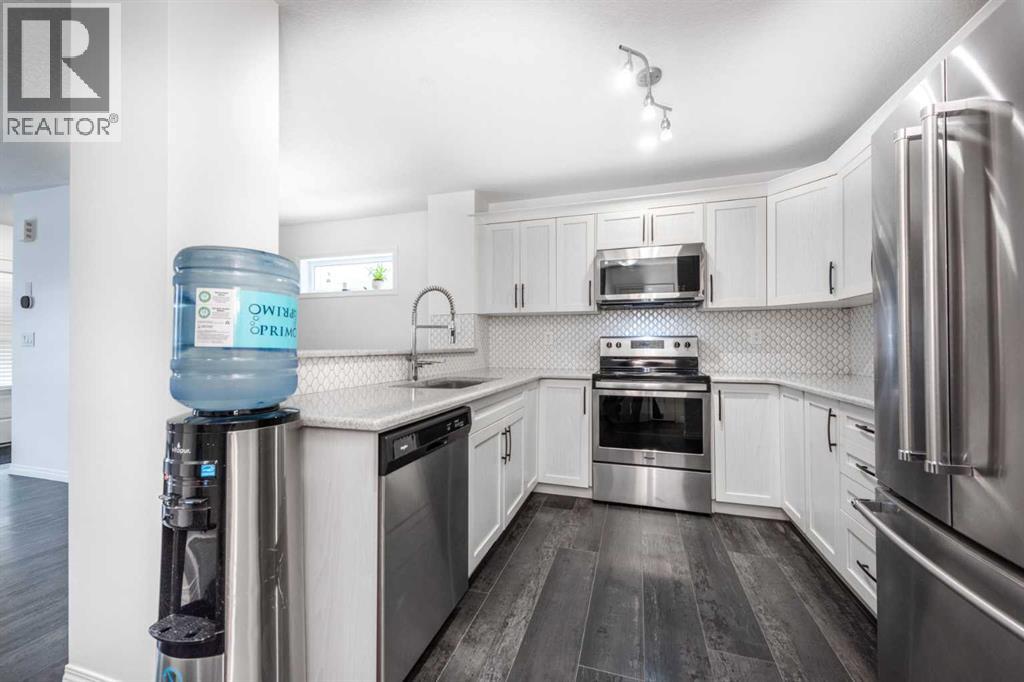 Step into modern living with this beautifully designed NO CONDO FEE end-unit townhome, offering exceptional style, function, and value. With 3 bedrooms, 2.5 bathrooms, and over 1,408 sq. ft. of thoughtfully finished living space, this home stands out with its impressive curb appeal and premium interior upgrades.A bright, open-concept main floor welcomes you with a seamless flow between the kitchen, dining, and living areas—perfect for everyday living and effortless entertaining. The upgraded kitchen features:Full-height raised cabinetsStainless steel appliancesQuartz countertopsLarge pantry closetExpansive counter space and storageThe main level is finished with luxury vinyl plank flooring, additional pot lights, and a convenient 2-piece bathroom, plus direct access to the double attached garage.Upstairs offers a thoughtfully separated layout for privacy and comfort. The spacious primary bedroom includes a walk-in closet and a beautifully upgraded 3-piece ensuite with a large tiled walk-in shower. A central bonus room creates separation from the additional two bedrooms—ideal for families, guests, or a home office.A full laundry room and another 4-piece bathroom complete the upper level.Perfectly situated close to everything you need, this home offers unbeatable accessibility to:Somerset LRT StationMajor commercial districts including IKEA, the Tsuut’ina Costco, Southcentre amenitiesSouth Health Campus HospitalEasy access to major roadways for quick commutingThis exceptional property combines style, convenience, and tremendous long-term value—all without condo fees.Your perfect home awaits. Book your private showing today! (id:53676)