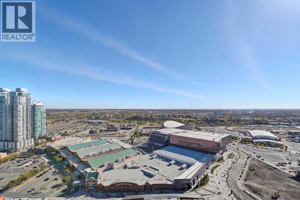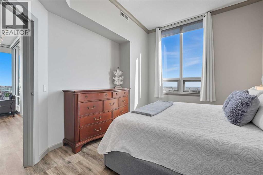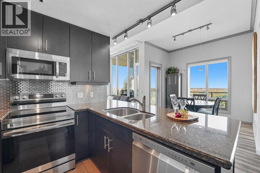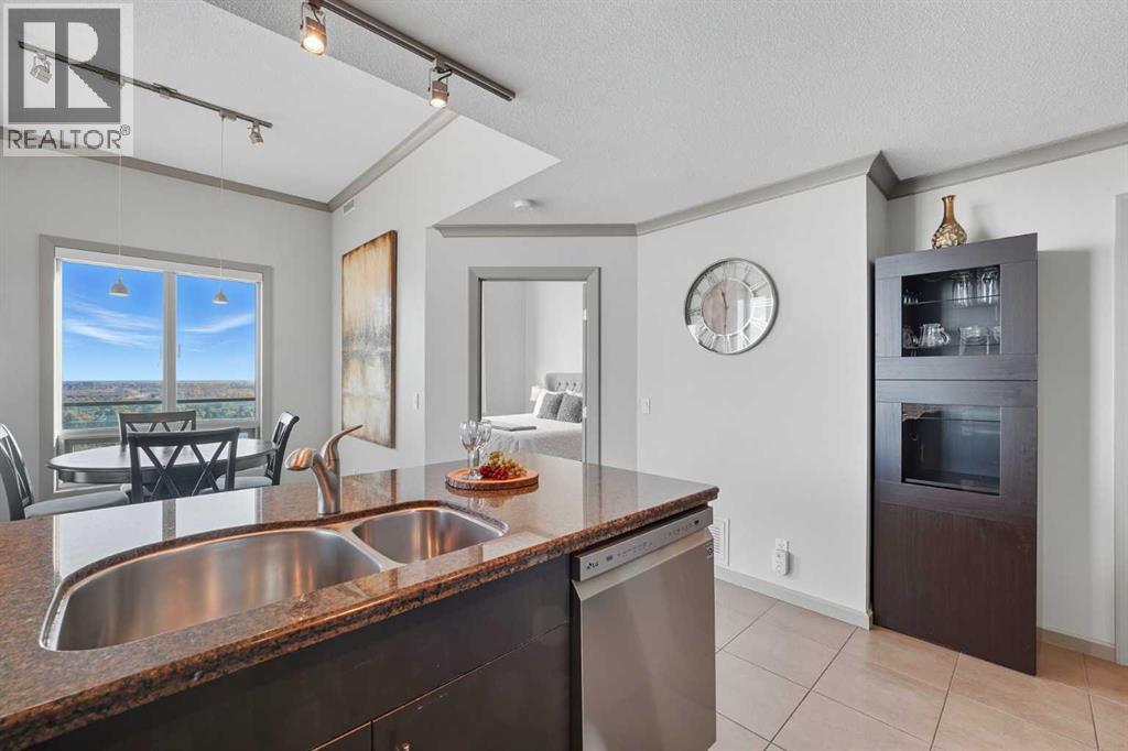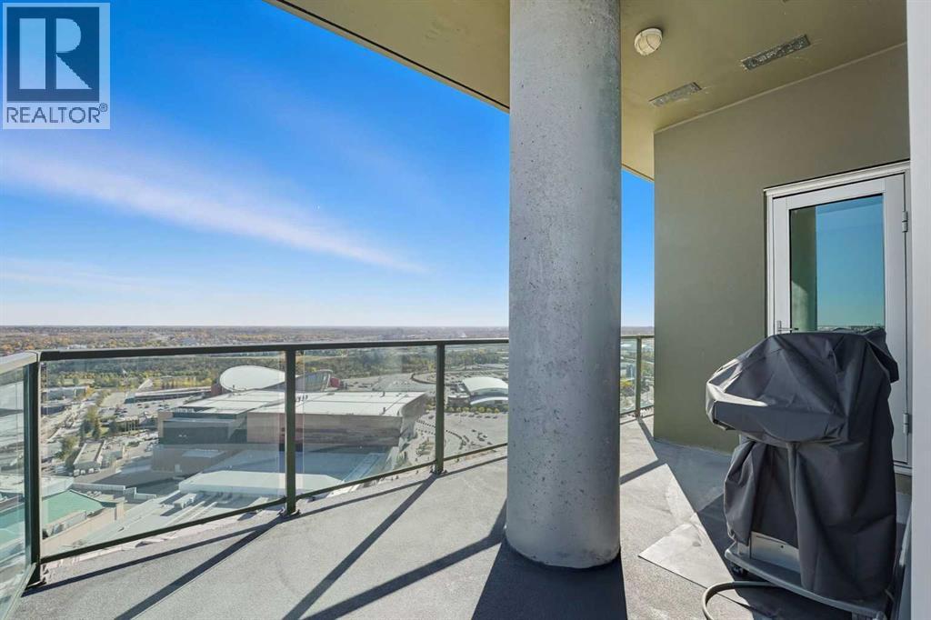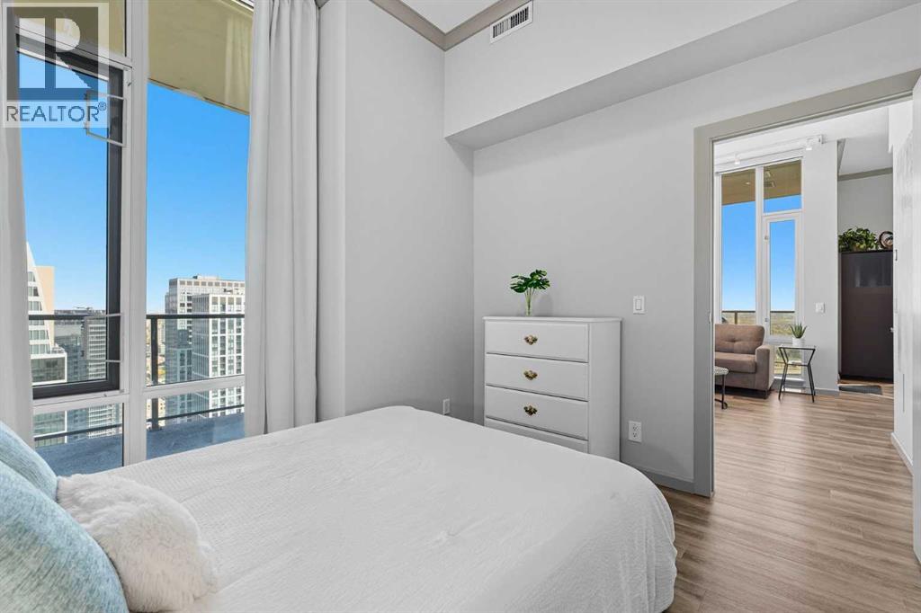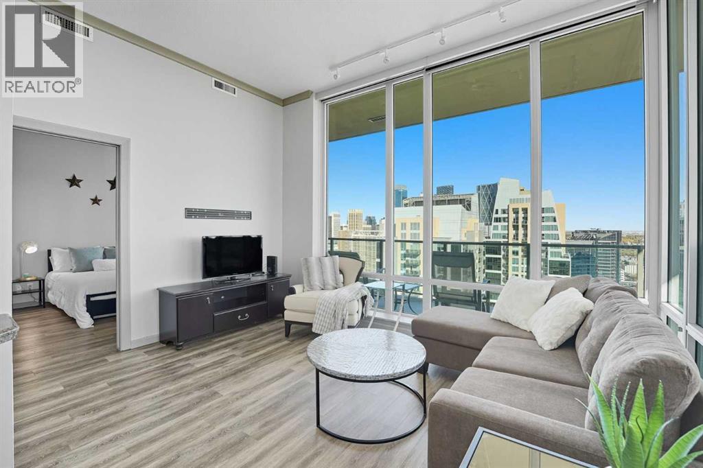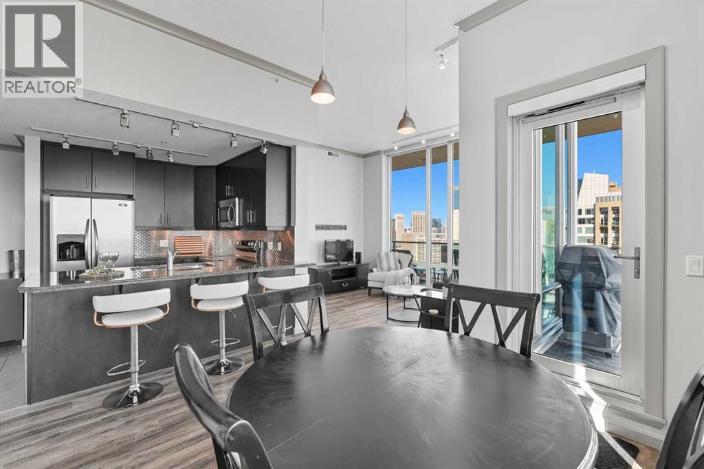 Welcome to Vetro, one of Calgary’s most sought-after high-rise condominiums, ideally located in the heart of the Beltline. Perched on the 32nd floor, this stunning 2-bedroom, 2-bathroom corner unit offers nearly 965 sq. ft. of modern living space with spectacular south-facing city and mountain views through floor-to-ceiling windows.Step inside to discover a bright and open layout featuring contemporary finishes throughout. The kitchen is equipped with sleek cabinetry, stainless steel appliances, granite countertops, and a convenient breakfast bar—perfect for entertaining or casual dining. The adjoining living and dining area flows seamlessly onto a private balcony, ideal for enjoying your morning coffee or the evening skyline.Both bedrooms are generously sized, with the primary suite offering a walk-through closet and private 4-piece ensuite. A second full bathroom, in-suite laundry, and central air conditioning add comfort and convenience to this well-designed space. Vinyl and tile flooring throughout ensure durability and style.This property includes 2 titled underground parking stalls and an assigned storage locker. Move-in ready or an exceptional turn-key investment opportunity. The Vetro building provides an array of amenities, including a fitness centre, sauna, hot tub, social and games rooms, and 24-hour security.Perfectly positioned steps from Stampede Park, the LRT, restaurants, shopping, and downtown, this location blends vibrant urban living with effortless access to everything you need.Enjoy the best of Beltline living—modern comfort, unbeatable views, and premier amenities—all from your sky-high retreat in Vetro. (id:53676)