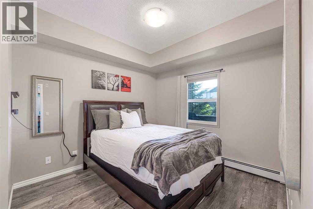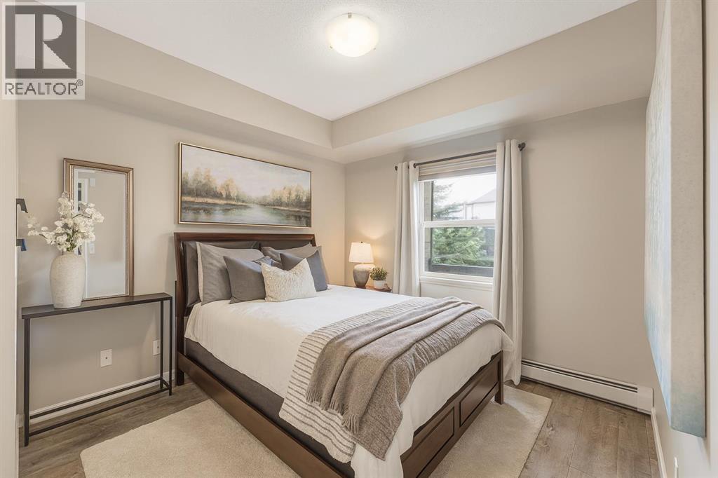 Welcome to The Courtyards in Kings Heights. This one bedroom suite is a must see and offers two parking stalls. The home has been tastefully updated over the years with kitchen and bathroom sinks and faucets (2021), high end laminate barnwood flooring, a stylish barn door, full height kitchen cabinets, backsplash, and ceramic tile in the entry (2021). Window coverings and a Phantom screen door to the balcony were also added in 2021. More recent upgrades in 2025 include a new shower head, a bidet, and a sunshade on the balcony. A storage cage is also included. This suite combines thoughtful details, ample storage, and the convenience of two parking stalls. Located close to Deerfoot, Yankee Valley Boulevard, shopping just across the street, and surrounded by beautiful walking paths, this home offers both comfort and convenience. (id:53676)