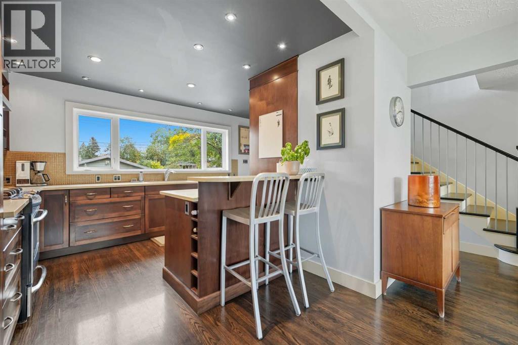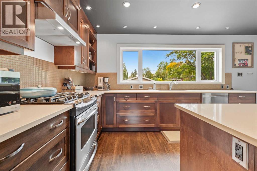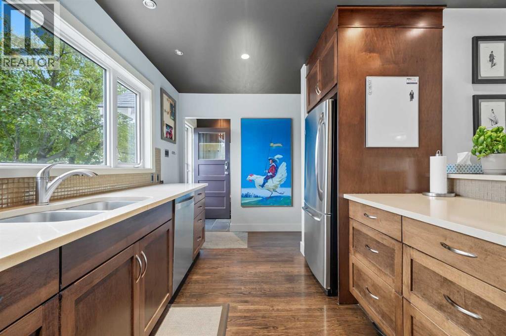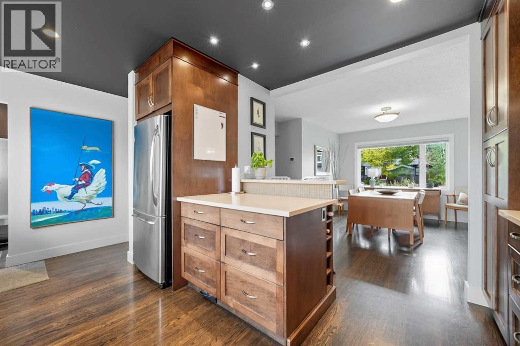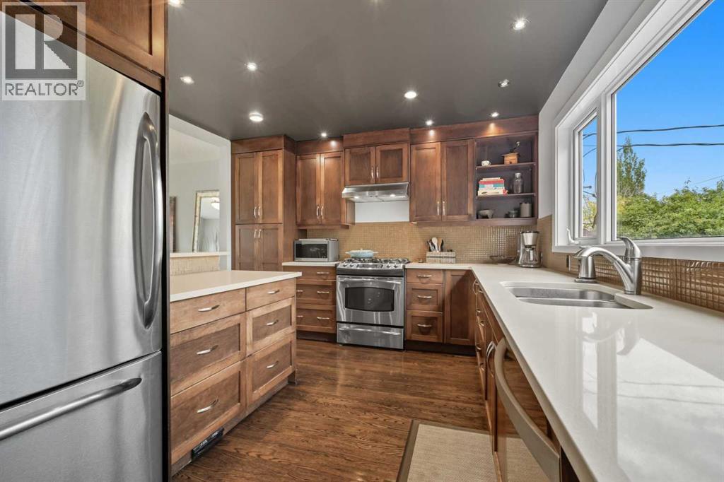 Beautifully updated & absolutely charming 3+1 bedroom 1.5 storey home offering over 2200 sq ft of living space & situated on a 50’x125’ lot in the Richmond wedge, which is a lovely enclave of single family homes. The main level presents hardwood floors, showcasing a spacious living room anchored by a wood burning feature fireplace. The bright dining room has ample space to host family & friends. Create culinary delights in the kitchen that’s tastefully finished with quartz counter tops, cozy eating bar, plenty of storage space & stainless steel appliances. The second level hosts 3 bedrooms & an updated 4 piece bath. Basement development includes a large family/recreation room, fourth bedroom & 3 piece bath. Completing the basement is a large storage room & laundry facilities. Other notable features include central air conditioning, roomy west facing front porch & large back yard with deck plus patio with BBQ gas line. Parking is effortless with an oversized double detached garage. The location is incredibly convenient, close to Richmond Green Park, vibrant Marda Loop, schools, shopping, public transit & easy access to Crowchild Trail. (id:53676)