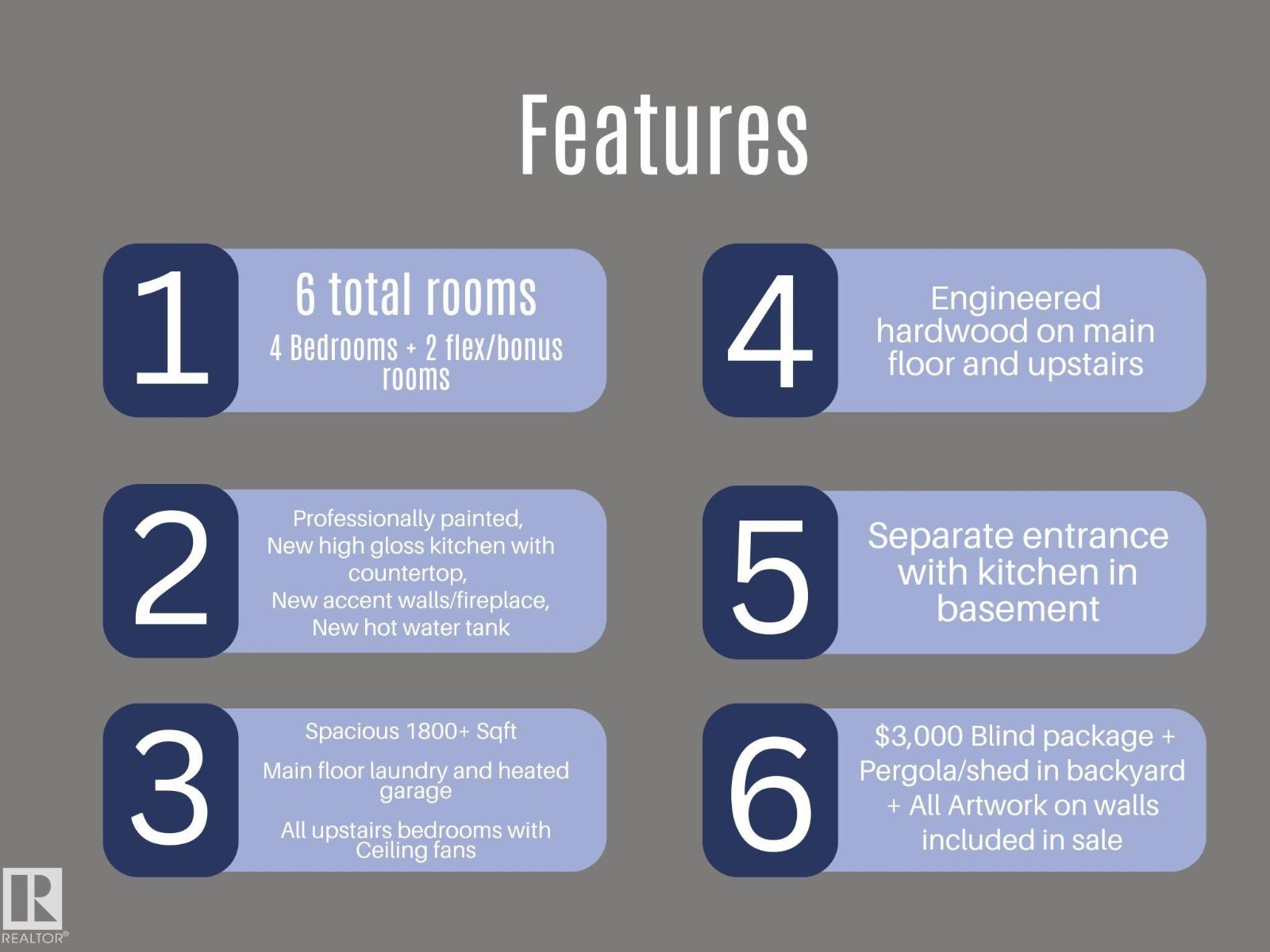 This 1,830 sq.ft. home is in REMARKABLE condition. Basement fully finished with kitchen & bathroom. 6 TOTAL ROOMS. 4 bedrooms + 2 Flex/Bonus Rooms + 3.5 baths there is enough room for families of all sizes. $3,000 Blind package + all artwork on walls + Pergola in backyard included with sale. Eng hardwood on main floor and upstairs. TONS OF RENO. NEW PAINT, NEW HIGH GLOSS KITCHEN + COUNTERTOPS, NEW ACCENT WALLS/FIREPLACE, NEW HWT. You are greeted with a beautiful entryway (w/ built in bench) that leads directly into the den/flex room that can be used also a formal dining area. The kitchen is spacious & offers lots of cupboard and counter space & includes a island/eating bar. The upper level has a HUGE bonus room with vaulted ceilings and a fireplace. The master offers a walk in closet & an ensuite with corner soaker tub. The other two bedrooms are spacious and bright. All upstairs bedrooms have ceiling fans great for hot summers. Heated garage & main floor laundry are some more WOWING features! (id:53676)
