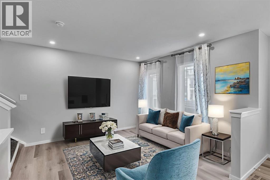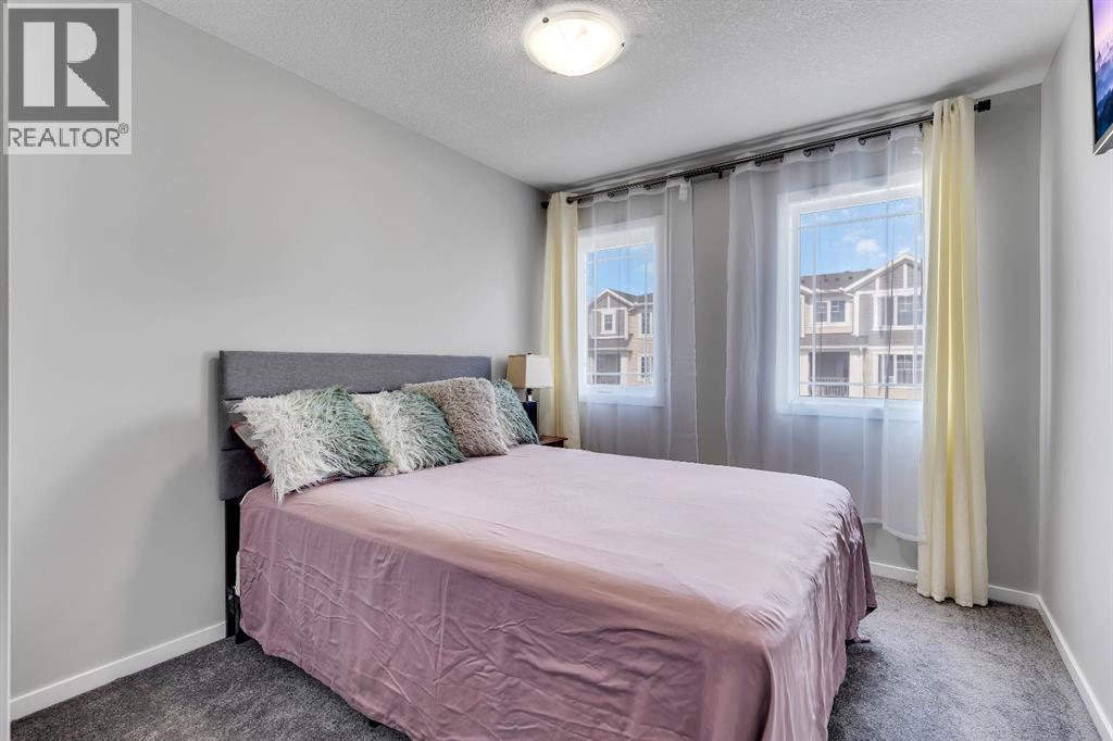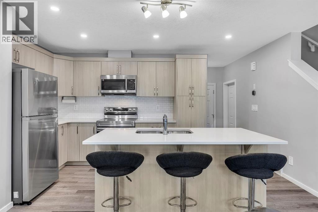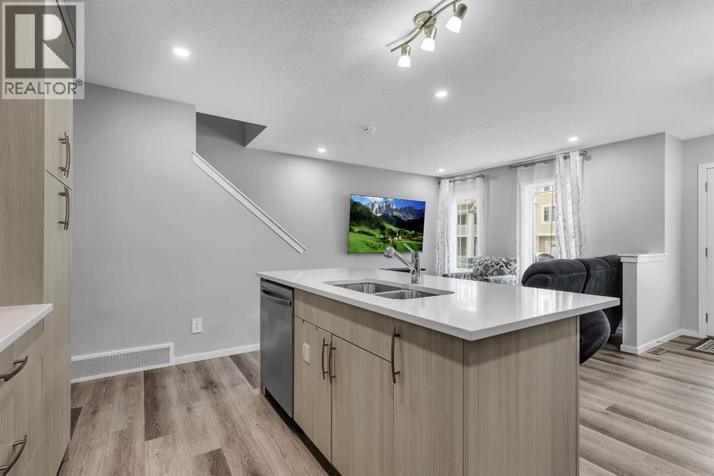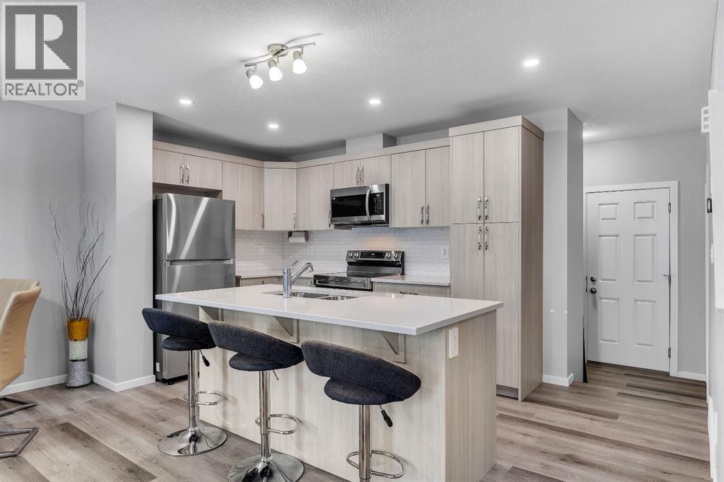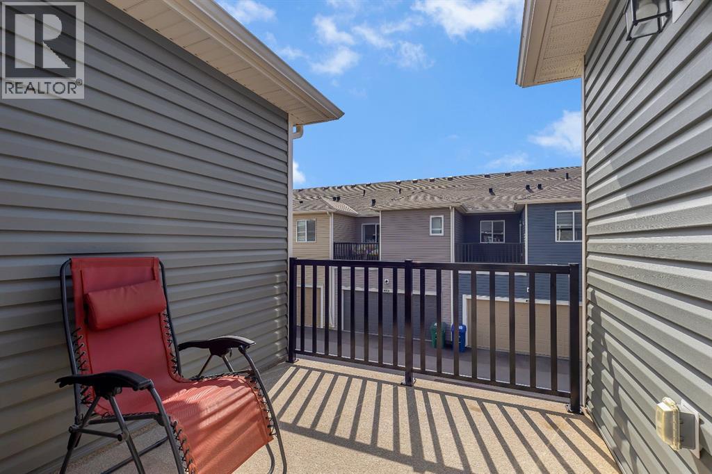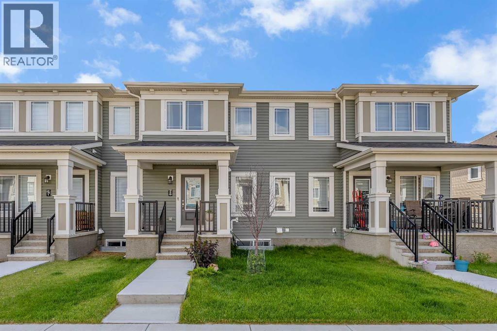 3 BEDS | 2.5 BATHS | DOUBLE CAR GARAGE | NO CONDO FEES – This 2022-built townhome in Southwinds, Airdrie SW offers the ideal combination of space, functionality, and location—with no condo fees and thoughtful design throughout. The home is east-facing, bringing in beautiful morning light through the front windows, while the west-facing private balcony off the primary bedroom lets you enjoy evening sunsets. The main floor features a bright living room at the front, a dining space, and a modern kitchen with quartz countertops, stainless steel appliances, a central island, and plenty of cabinet space. You’ll also find a 2-piece bathroom, a mudroom with built-in shelving, and a front entry closet for extra storage. Upstairs offers three generously sized bedrooms, including a primary suite with a huge walk-in closet, 4-piece ensuite, and direct access to the balcony. Two additional bedrooms, another full 4-piece bathroom, and convenient upper-level laundry complete the layout. The unfinished basement includes plumbing rough-ins for future development. A double attached garage with paved rear lane access, a welcoming front porch, and a family-friendly location close to Windsong Heights School, Chinook Winds Regional Park, playgrounds, and shopping make this a fantastic opportunity in one of Airdrie’s desirable newer communities. (id:53676)