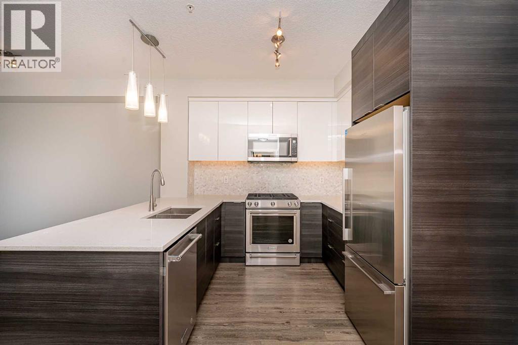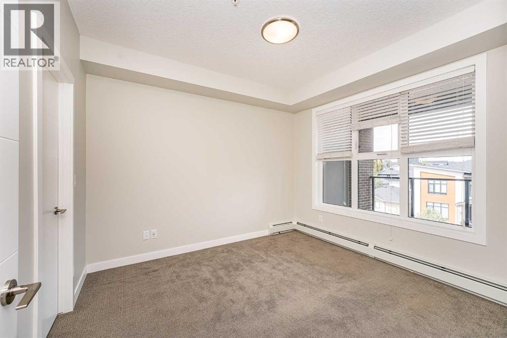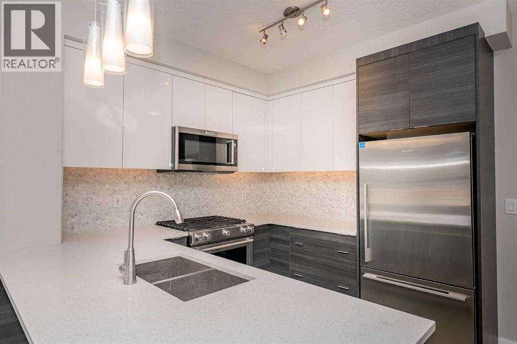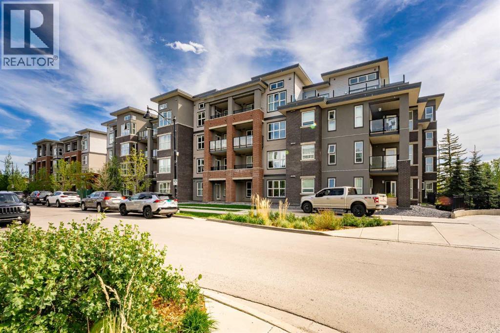 Located in the desired community of Currie Barracks, directly across from Mount Royal University, this third-floor apartment offers a blend of comfort and convenience. The brick and stucco exteriors provide appealing curb appeal, complemented by a private balcony and a landscaped courtyard. Inside, you'll find high 9’ ceilings that make the living space feel open and airy. The master bedroom includes a walk-in closet and a bathroom with porcelain flooring tiles and ceramic wall tiles around the tub. The in-suite washer and dryer add to the convenience. The apartment features soundproof wood plank flooring in the living areas, a functional European-inspired kitchen with a gas stove, marble backsplash, quartz countertops, double bowl stainless steel sinks, and LED under-counter lighting. Additional amenities include 26 underground visitor parking stalls, a spacious bike storage room, and a cage-style storage locker for each parking stall in the heated underground parking area. The location is a mere 7-minute drive to downtown and the West Hills Shopping Center. This apartment offers a comfortable and convenient living experience. Schedule a viewing today to see it for yourself (id:53676)