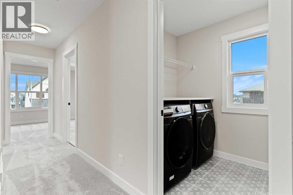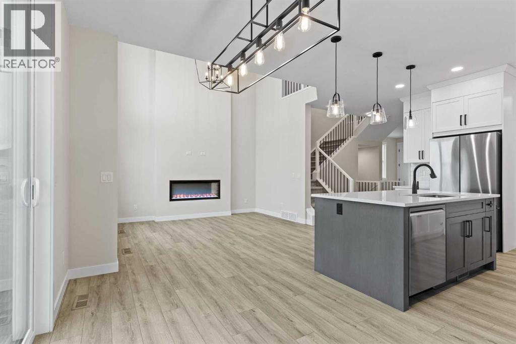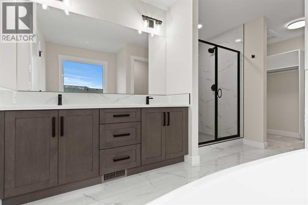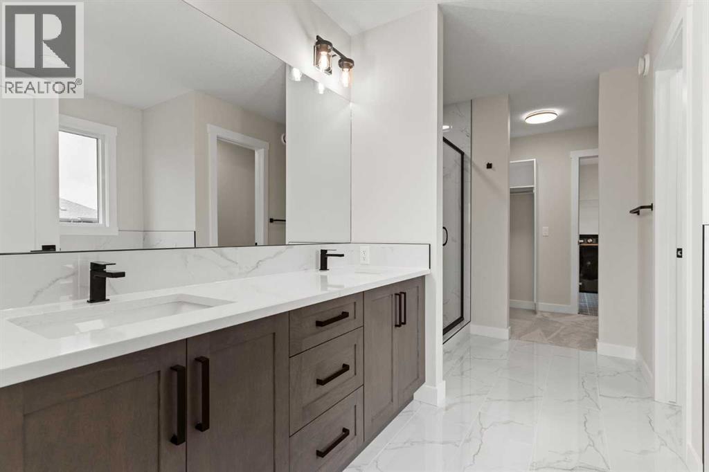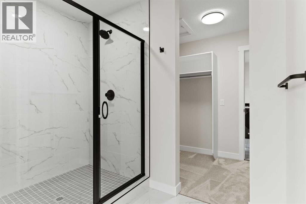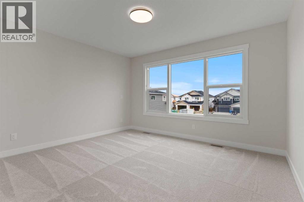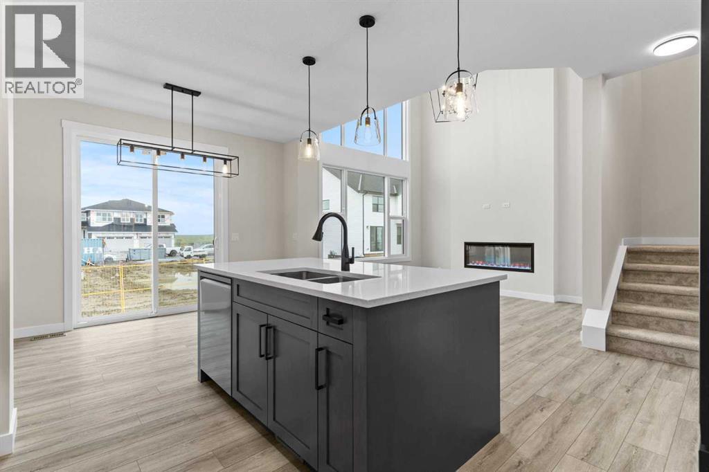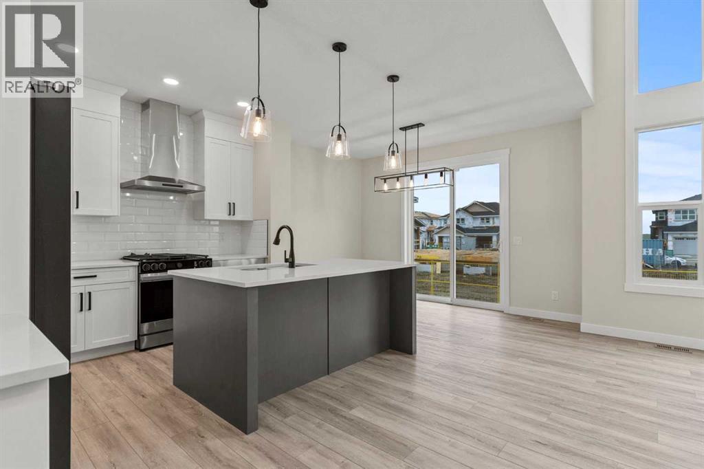 Welcome to 354 Kinniburgh Loop – A Stunning New Build with 4-Bedroom, 3-Bathroom Walkout Backing Onto the Chestermere Canal with Mountain Views!This 2200 SQFT home offers 4 bedrooms, 3 bathrooms, and a walkout basement that brings in an abundance of natural light and provides direct access to your backyard. Backing onto the Chestermere canal with unobstructed mountain views, this home delivers a rare combination of location, luxury, and lifestyle.The main floor is thoughtfully designed with a bedroom and private full bathroom, perfect for guests or multi-generational living. The open-concept layout includes a large family room with a grand open-to-below feature, a spacious dining area, and a designer kitchen with gold accents an oversized quartz island, stainless steel appliances, and a full-height cabinet package. A spice kitchen with a second gas range provides the perfect space for additional cooking, while the mudroom with upgraded MDF shelving keeps your family organized.Upstairs, the primary bedroom offers true luxury, with a luxurious 5-piece ensuite with a freestanding tub, fully tiled mosaic shower base with wall tile to the ceiling, dual vanities, and a private toilet. The ensuite connects to a large walk-in closet with built-in MDF shelving and drawers, which further connects directly to the laundry room, accessible from both the closet and the hallway for everyday convenience. Two additional bedrooms, each with plenty of space, share a Jack & Jill bathroom with a sink and toilet/shower area. A spacious bonus room completes the upper level, perfect for family movie nights or a home office.The walkout basement feels just like the main floor, thanks to oversized triple-pane windows and sliding glass doors that fill the space with natural light and provide easy backyard access. The basement is fully roughed-in, with a separate enclosed mechanical room for safety and convenience.This home is packed with high-end upgrades, including two gas ranges, s tainless steel appliances, black painted railings with black iron spindles, matte black fixtures throughout with gold accents in the kitchen, full-height painted cabinets, upgraded carpet underlay, and metal-sided soft-close drawers. Golden Homes’ Standard features are also included: true 9' ceilings on the main floor and basement, 8' interior doors on the main floor, triple-pane oversized windows, tankless hot water heater, HRV system, smart home features, gas line to the deck, rough-in for a garage heater, upgraded landscaping (lot graded and loamed, sod to side entry, and a tree in the front yard), solar panel rough-in, and more.With its premium location backing onto the canal, mountain views, walkout basement, and countless luxury upgrades, this home is truly one of a kind in Kinniburgh South. Don’t miss your chance to make it yours! Photos of are the same model, Builder specification may vary. (id:53676)