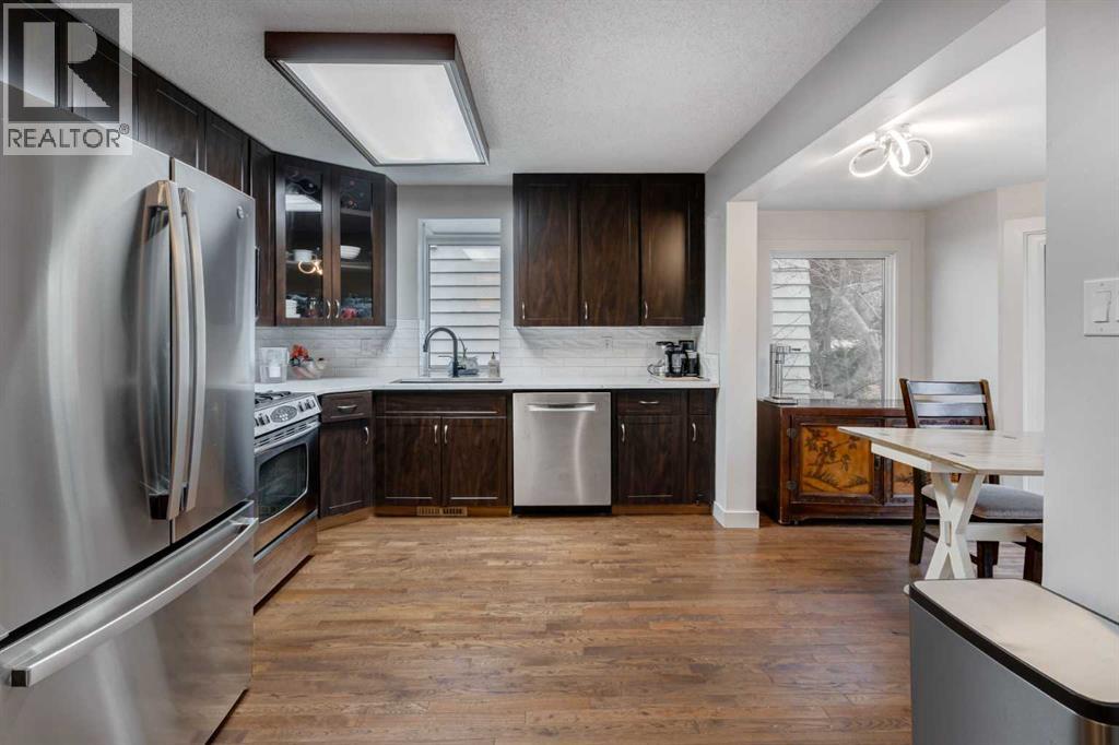 Welcome to this beautifully updated 4-bedroom, 3-bathroom bungalow nestled on a quiet street in sought-after Coach Hill. This home offers a bright, open-concept layout featuring a stylish kitchen with quartz countertops, stainless steel appliances, abundant cabinetry & a convenient kitchen nook with updated bay window. The sunken living room is filled with natural light & showcases a striking floor-to-ceiling river rock fireplace & vaulted ceiling. Imagine curling up with a good book! Host dinner parties with friends & family in the spacious formal dining room. The main floor includes a spacious primary bedroom with a 3-piece ensuite, two additional bedrooms & a 4-piece bathroom with jetted jacuzzi Swirlpool tub. Downstairs, the fully finished walk-out basement provides a generous family room, a fourth bedroom, a beautifully renovated 3-piece bathroom with a steam shower & laundry room. Enjoy carpet-free living with original hardwood on the main & luxury vinyl plank flooring down & heated floors in the ensuite & basement bath for added comfort. Recent upgrades include: new LVP in basement & on stairs, all new triple-pane windows & patio doors, renovated bathrooms, new interior doors, A/C, new furnace & hot water tank (2016), fresh interior & exterior paint, new cedar top on the upper deck, upgraded deck railing, some updated appliances, upgraded attic insulation. The large, south-facing backyard is fully landscaped & features an upper deck perfect for outdoor entertaining. A double attached garage (tandem) completes this incredible package. This amazing location is across the street from a playground, walking distance to great schools, shopping & coffee shops & is only a 15 minute drive to downtown. Connect to the bike paths from nearby Edworthy Park or head West to the mountains. Move-in ready & loaded with value — don’t miss your chance to own this exceptional home! (id:53676)