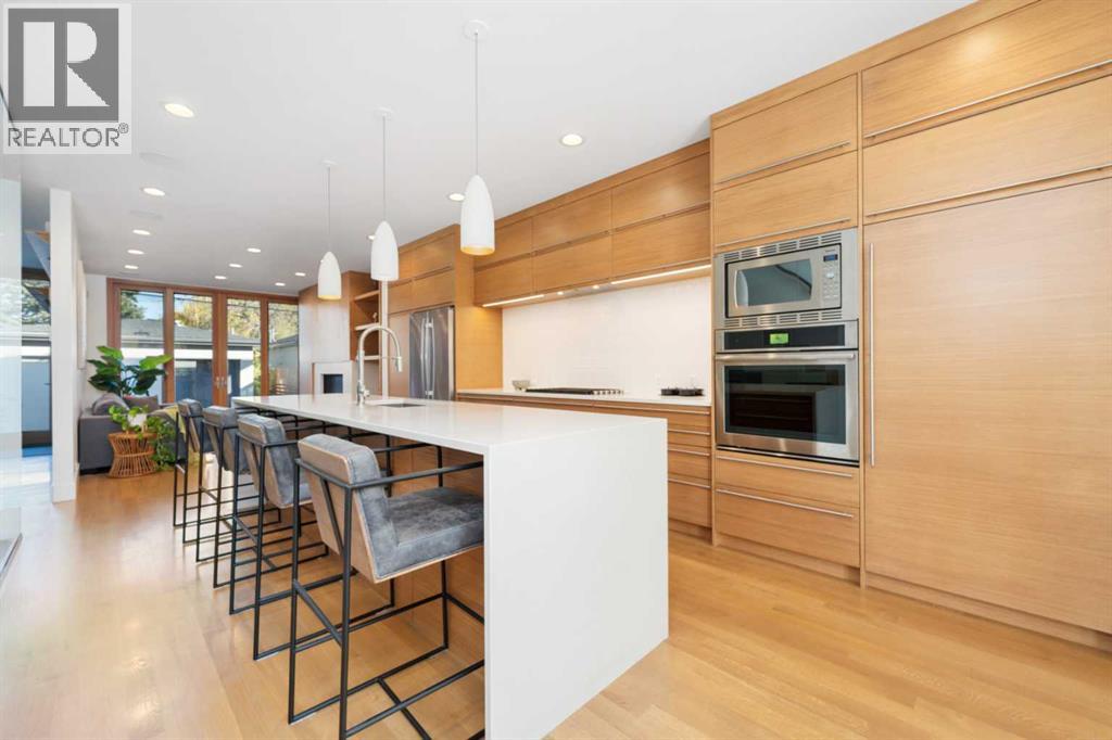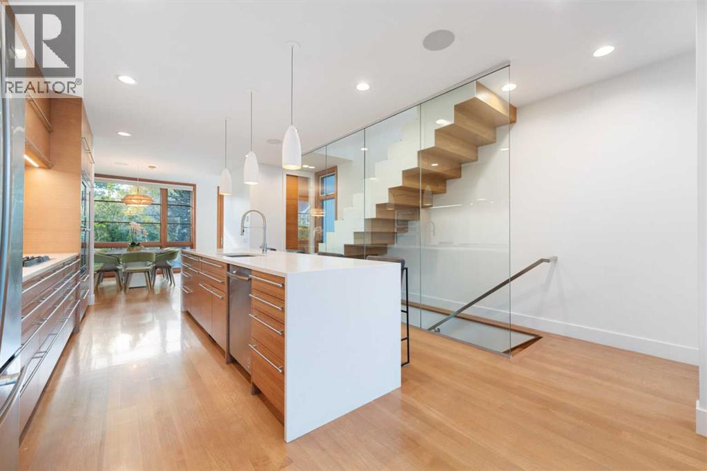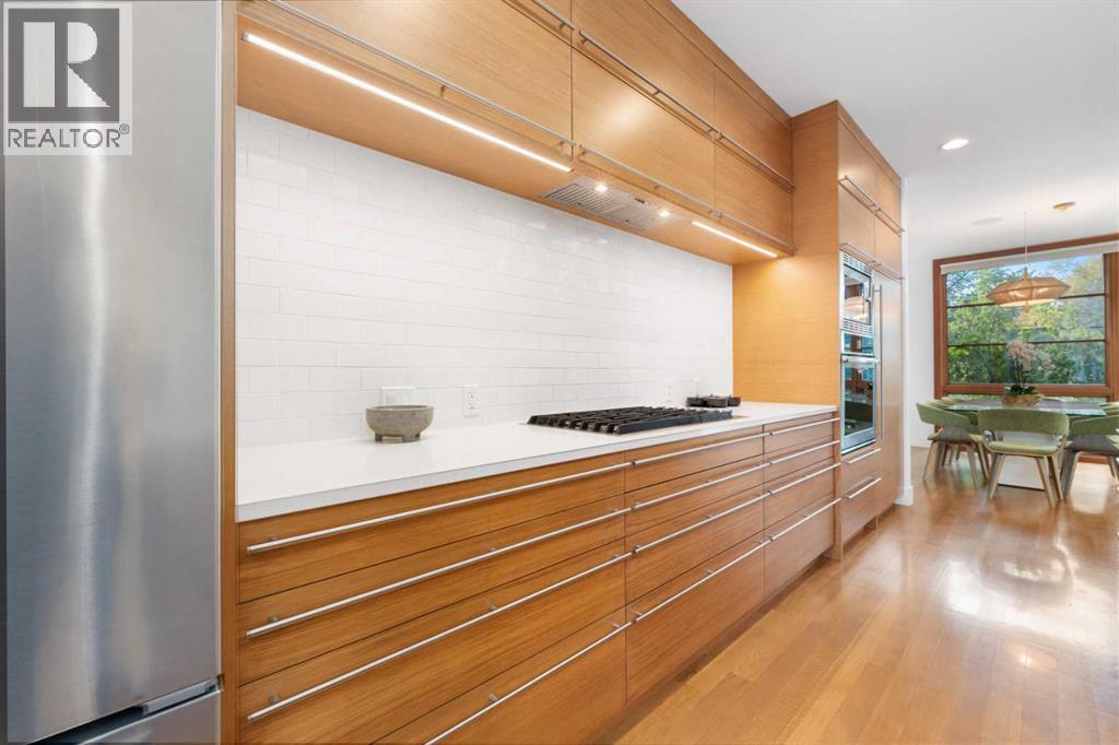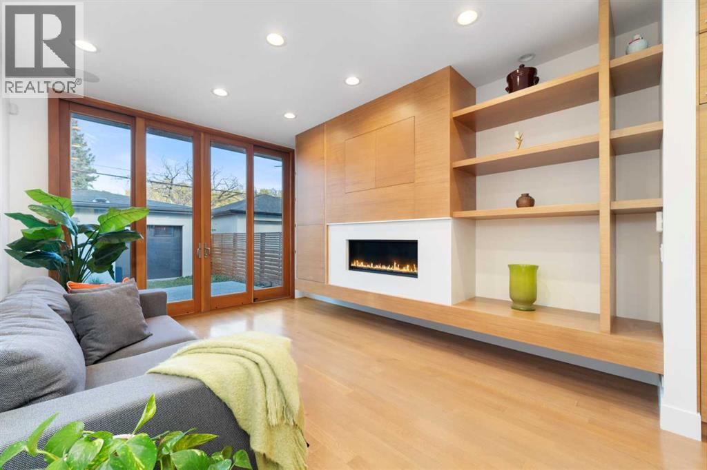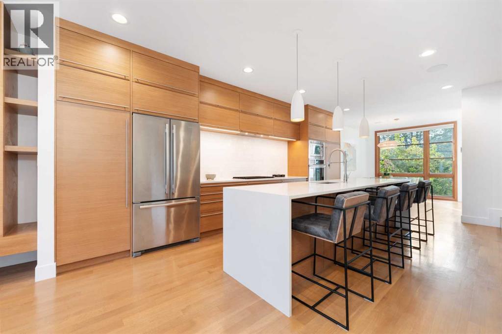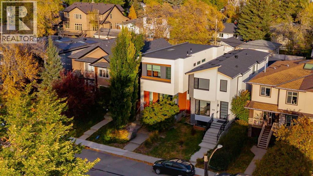 This custom-built 4-bedroom, 3.5-bathroom home in Highland Park delivers an elevated living experience defined by thoughtful design, quality craftsmanship, and refined style across every level. From the moment you step inside, it’s clear that this is not a standard new build — every finish, fixture, and detail has been carefully chosen to create a home that feels both modern and timeless. The main floor features 9’ ceilings and an open-concept layout that’s bright, inviting, and perfectly balanced for everyday living and entertaining. The chef’s kitchen impresses with high-end JennAir appliances, a striking waterfall-edge quartz island, and full-height custom cabinetry that combines form and function. The dining area offers tranquil treetop views, while the living room is anchored by a sleek gas fireplace framed with custom millwork — a contemporary focal point that adds warmth and character. A glass-walled staircase and overhead skylight enhance the sense of space, creating a seamless flow of natural light throughout the home.Upstairs, 11’ ceilings and solid hardwood floors set a tone of quiet sophistication. The primary suite is a serene retreat with a spacious walk-in closet and a spa-like ensuite featuring heated tile floors, dual vanities, and a double soaker tub. Two additional bedrooms and a well-appointed full bath provide comfort and flexibility for family or guests, while the convenient upper laundry room adds practicality to the space. The fully developed lower level continues the home’s modern aesthetic, featuring 9’ ceilings, large windows, and polished, stained concrete floors that lend a stylish, urban edge. A wet bar with a dishwasher makes entertaining easy, while the open recreation area offers versatility as a media room, gym, or guest suite. With a sauna rough-in and generous storage, every need has been anticipated. Behind the design, high-performance features ensure lasting comfort and efficiency, including a Lennox 4-zone HVAC system, triple- pane windows, and built-in ceiling speakers. Outside, the home’s appeal continues with professional landscaping, wide exposed aggregate walkways, and contemporary exterior lighting that highlights its architectural form. Set on a quiet, tree-lined street with west-facing exposure, this property offers exceptional light and privacy in a sought-after inner-city location. With easy access to the core and other major routes, it combines urban convenience with a peaceful residential setting. Sophisticated yet welcoming, this Highland Park home stands out for its thoughtful design, exceptional build quality, and effortless livability — a space that feels as good as it looks. (id:53676)