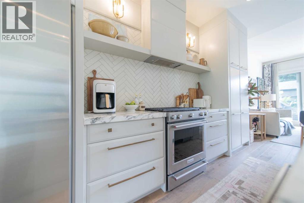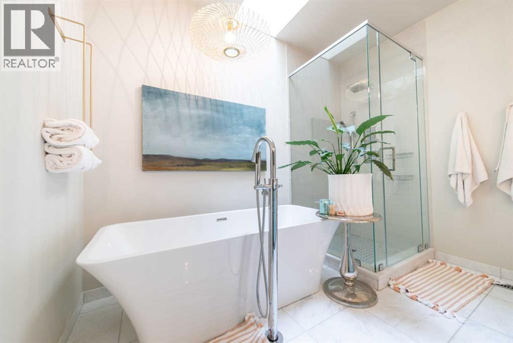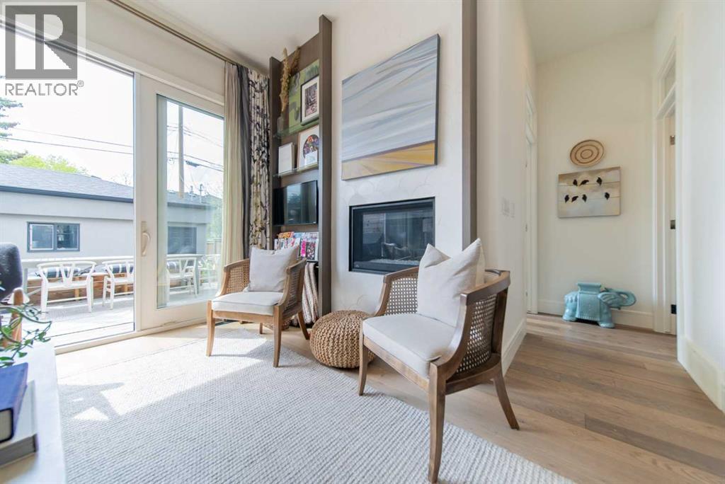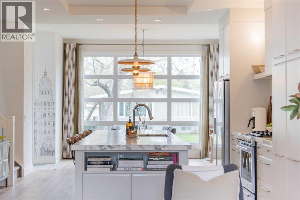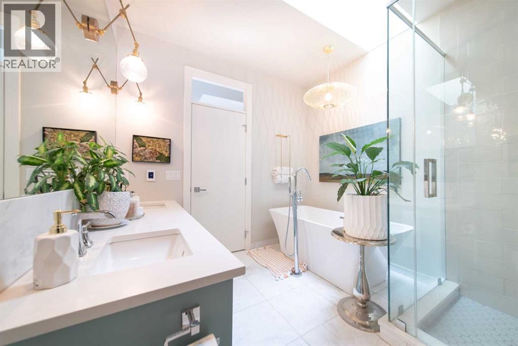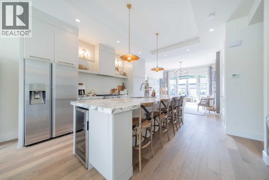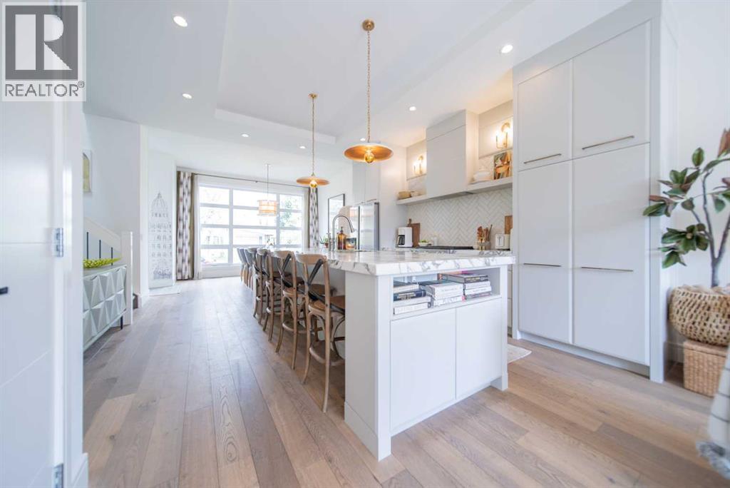 Discover this beautifully curated semi-detached home in the vibrant community of Glenbrook. Offering more than 2,500 sq. ft. of thoughtfully designed living space, this 4 bedroom, 3.5 bathroom residence combines modern elegance with everyday functionality. The main floor showcases an open-concept layout centered around a showstopping honed Arabescato Marble island, complemented by custom Rockpoint cabinetry and premium appliances a dream setup for both entertainers and home chefs. Wide plank Oiled Oak engineered hardwood flows throughout the main and upper levels, while wool carpeting on the stairs adds warmth and sophistication. In the living room, built-in shelving and a gas fireplace create a welcoming focal point, while French sliding doors extend the space to a private west-facing backyard with a deck and stone patio ideal for hosting sunset gatherings. Upstairs, the primary suite is a true retreat with a spa-inspired ensuite featuring heated floors, a freestanding soaker tub, glass enclosed shower, dual vanity, and custom cabinetry. Two additional bedrooms, a functional laundry room and a full bath complete the upper level. The fully finished basement offers even more living space with a sleek wet bar, a large rec room with hidden storage cleverly tucked behind a secret door, plus a guest bedroom with a cheater ensuite. Rounding out this home is an insulated, and heated double detached garage with rough-in for EV charging. Perfectly positioned near parks, schools, and everyday conveniences, this property delivers upscale living in one of Calgary’s most desirable neighbourhoods. (id:53676)