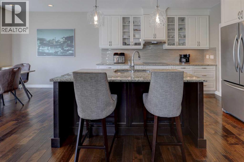 Beautiful Cedarglen-built home perfectly situated on a corner lot in sought-after Cranston Riverstone. From the moment you step inside, you’re welcomed by a spacious entry, 9-foot ceilings, & rich hardwood flooring that flows throughout the main level. The stylish kitchen is designed for both everyday living & entertaining, featuring two-tone cabinetry, granite countertops, a massive island with eating bar, & a walk-through pantry leading to the mudroom. Imagine family dinners & fun dinner parties in the dining area! The bright & inviting living room is anchored by a cozy gas fireplace, while the main floor office with double French doors & built-in workspace makes working from home effortless. Upstairs, the impressive bonus room with coved ceiling offers the perfect place to unwind. The primary suite is a true retreat, complete with a dream ensuite & a large walk-in closet, while two additional bedrooms provide plenty of space for family or guests & the upper laundry is very efficient. The fully finished basement adds incredible versatility with a large open area ideal for a rec room, gym, or games space, plus a bathroom rough-in & 2 large egress windows for future development. Step outside to your private backyard oasis, featuring mature trees, a large deck with privacy glass, retractable awning, gas BBQ hookup, & a spacious shed—perfect for relaxing or entertaining all summer long. All this just steps to a beautiful network of nature walking paths!! Welcome home!!! (id:53676)