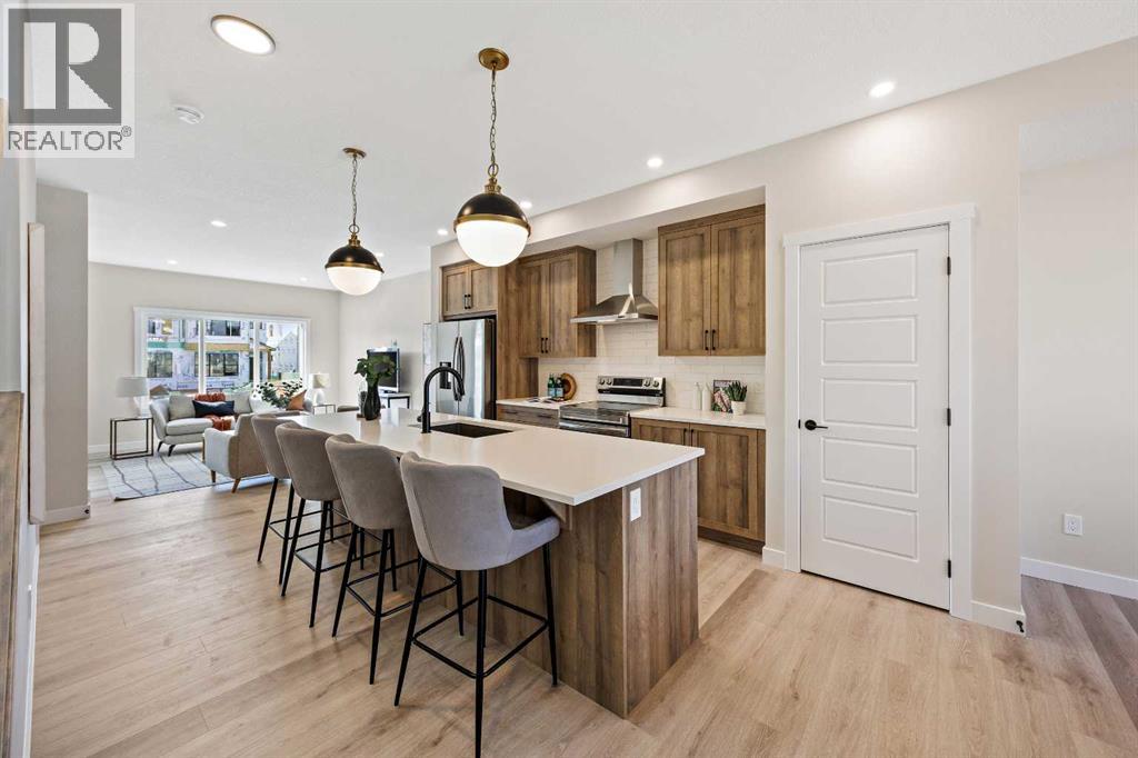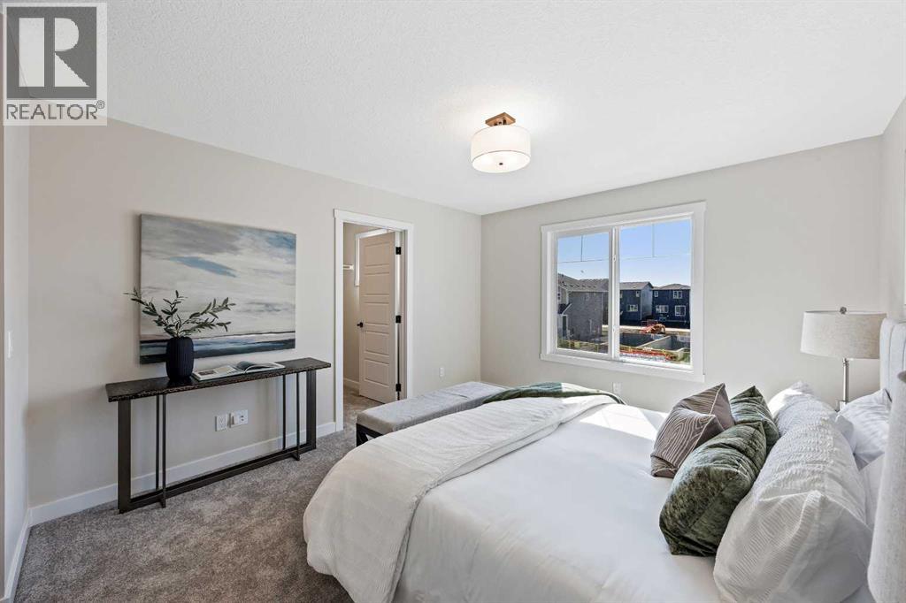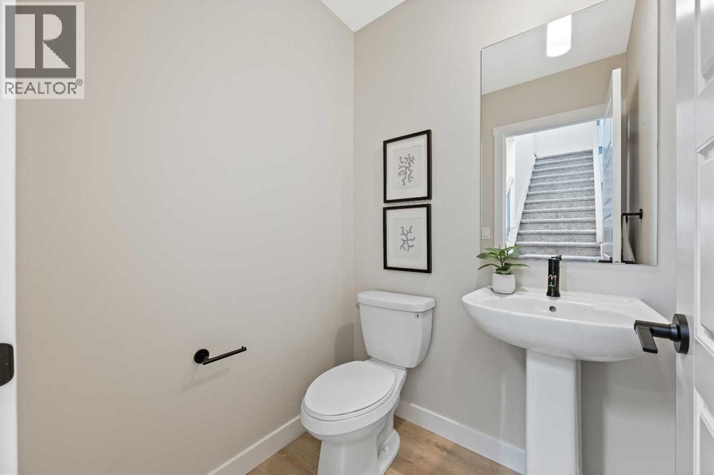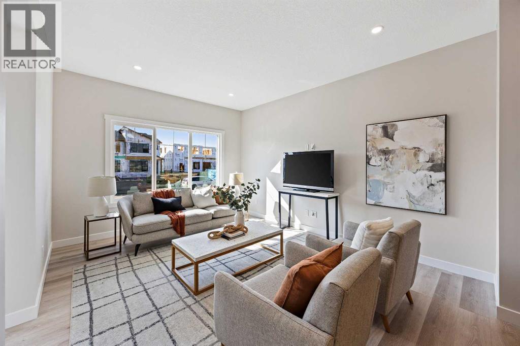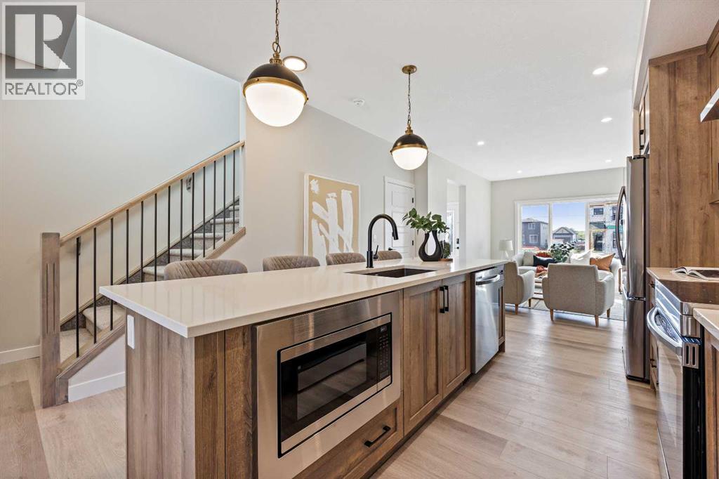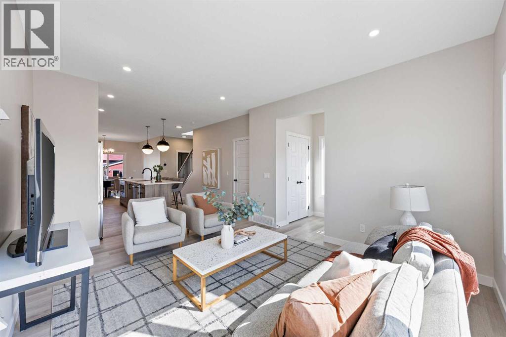 Welcome to 380 Fireside Drive, a newly built two-storey duplex in the family-friendly community of Fireside, Cochrane. This thoughtfully designed home blends style and function with bright open-concept living and modern finishes throughout. The main floor features 9’ ceilings, luxury vinyl plank flooring in a warm mocha tone, and a spacious kitchen with quartz countertops in Polaire, full-height ebony shaker cabinetry, stainless steel appliances, a built-in microwave, and a large island with seating and ample storage. At the front of the home, the living room is filled with natural light, creating a welcoming space that is ideal for both everyday living and entertaining. A half bath and stylish entryway complete this level.Upstairs offers three bedrooms, two full bathrooms and a convenient laundry space. The primary suite includes a walk-in closet and a private ensuite with a double vanity. Two additional bedrooms and a full bath provide space for family or guests, and a hallway linen closet adds extra storage.The basement includes rough-ins and plenty of open space. This home also features a side entry, 9’ foundation, upgraded railing, a gas line to the kitchen range, and a BBQ gas line outdoors.Exterior details include a Craftsman-inspired elevation with stone accents, a concrete front landing and a double parking pad out back. Fireside is a vibrant community with two schools, extensive parks and pathways, and local shops and services. It also offers quick access to the Rocky Mountains, downtown Cochrane and an easy commute into Calgary. Area size was calculated by applying the RMS to the blueprints provided by the builder. Photos are representative, colors and finishes may vary. (id:53676)